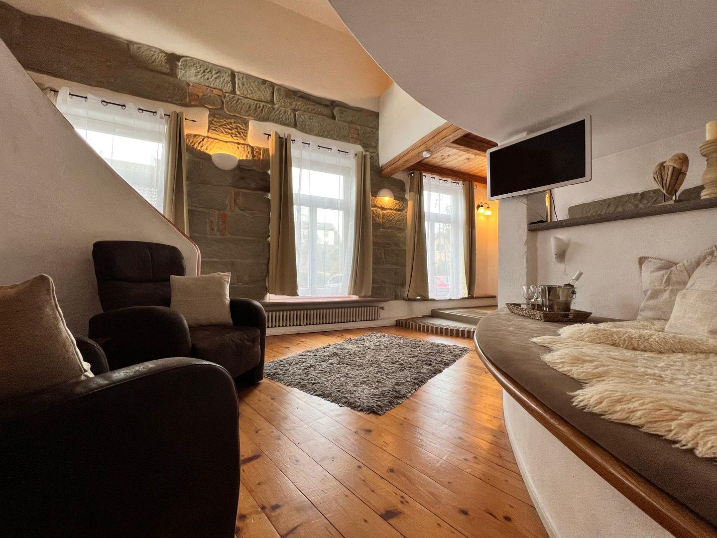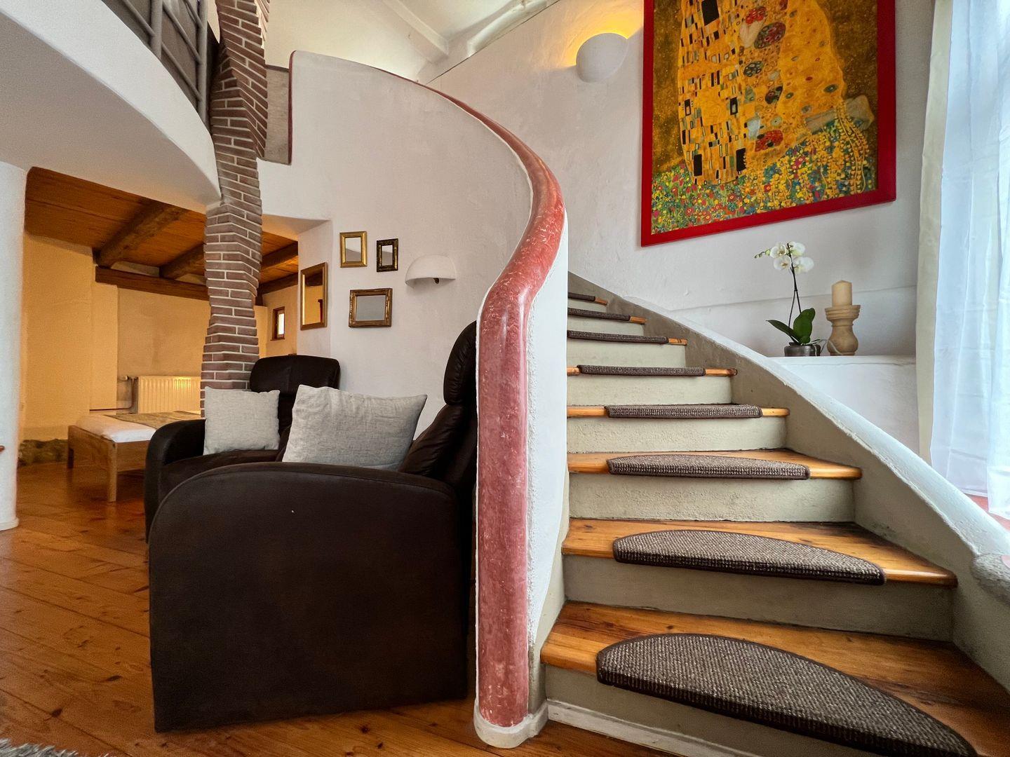 Im Erdgeschoss der offen gestalteten Galeriewohnung befindet sich der Wohn- und Schlafbereich mit gemütlichem Kachelofen. Der Schlafbereich im Erdgeschoss der Ferienwohnung bietet ein großzügiges Doppelbett (180x200 cm) sowie eine funktionale Garderobe mit Stauraum. Als weitere Schlafmöglichkeit steht in einer gemütlichen Nische im Obergeschoss eine Schlafcouch (160x200 cm ) zur Verfügung. Im Obergeschoss befinden sich die funktionale Küchenzeile sowie ein Essplatz für bis zu vier Personen. In der Küche steht neben Gasherd, Backofen und Kühlschrank auch eine Spülmaschine zur Verfügung. Im Tageslicht-Badezimmer finden Sie eine historische Dusch-Badewanne (mit Duschvorhang), einen Waschtisch mit beleuchtetem LED-Spiegel sowie ein WC. Durch einen separaten Zugang am Seitengebäude genießen Sie in der Ferienwohnung absolute Ruhe und Privatsphäre.