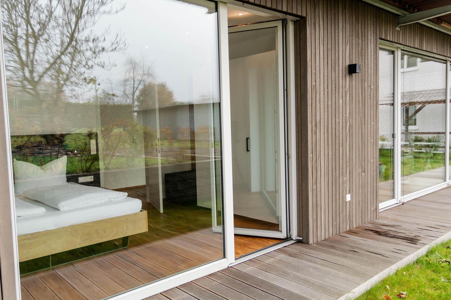 Die Terrasse mit Esstisch für vier Personen bietet Ihnen einen freien Blick Richtung Wald und Wiesen. Die großen Fensterfronten lassen die Ferienwohnung besonders hell wirken und sind mit elektrischen Jalousien ausgestattet. Fußbodenheizung mit separater Steuerung über Raumthermostate.
