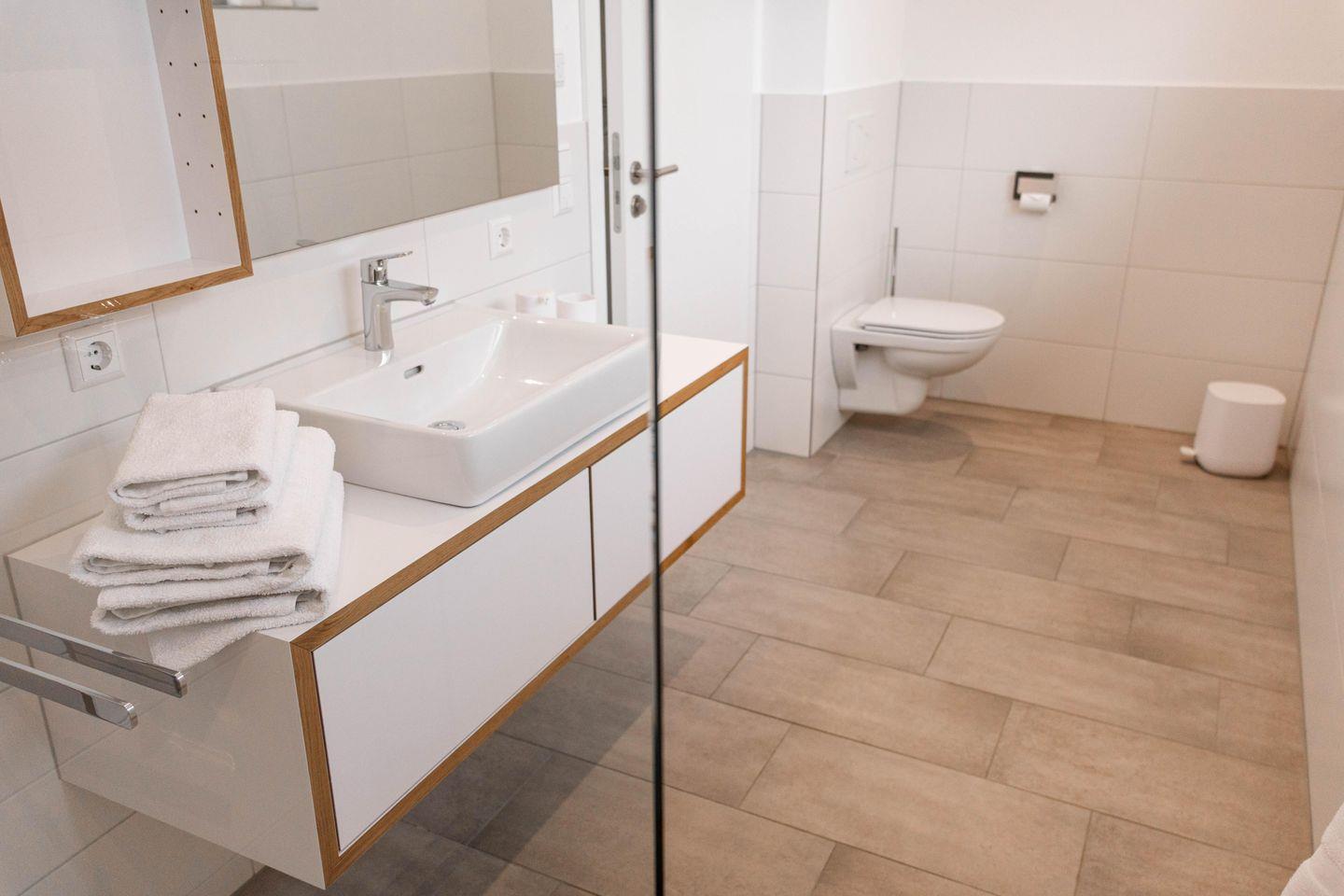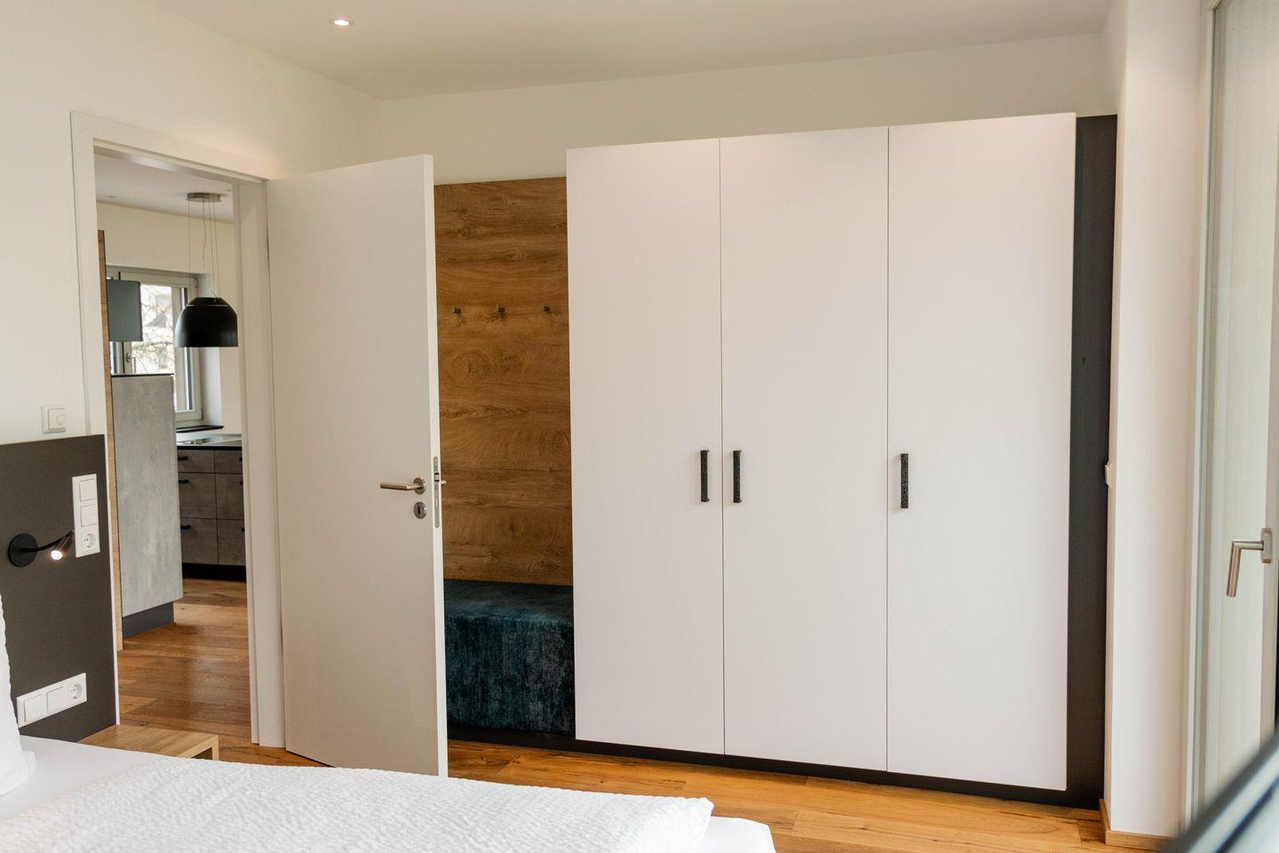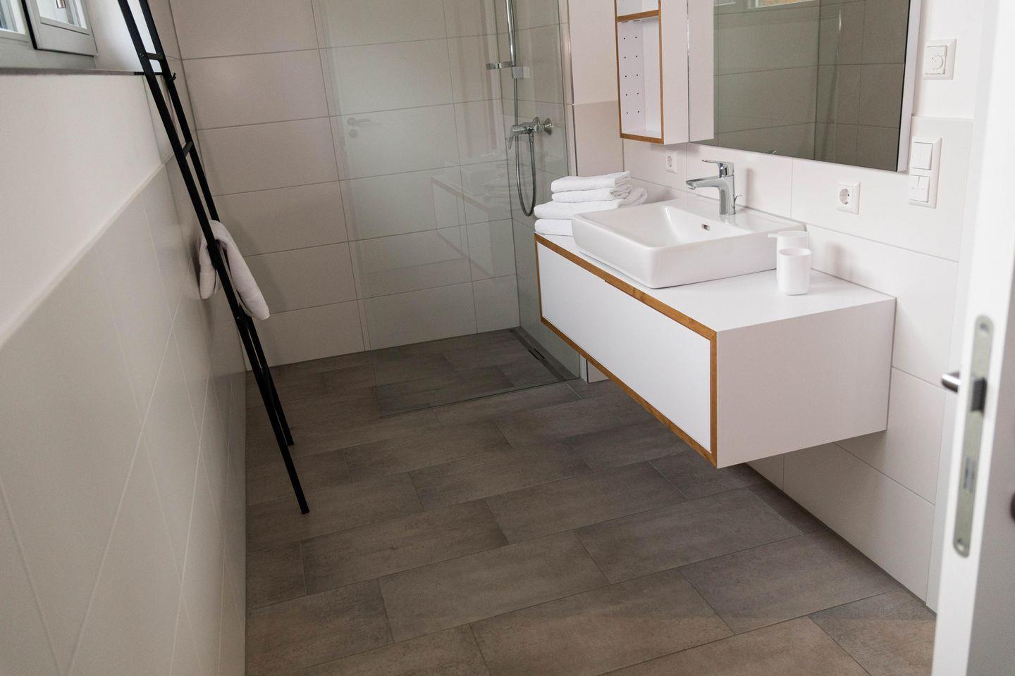 Die Ferienwohnung verfügt über ein Schlafzimmer mit Doppelbett (180X200 cm) und ausreichend Stauraum im maßangefertigten Kleiderschrank. Das Badezimmer beinhaltet eine großzügige, bodenebene Dusche sowie Waschbecken und WC.