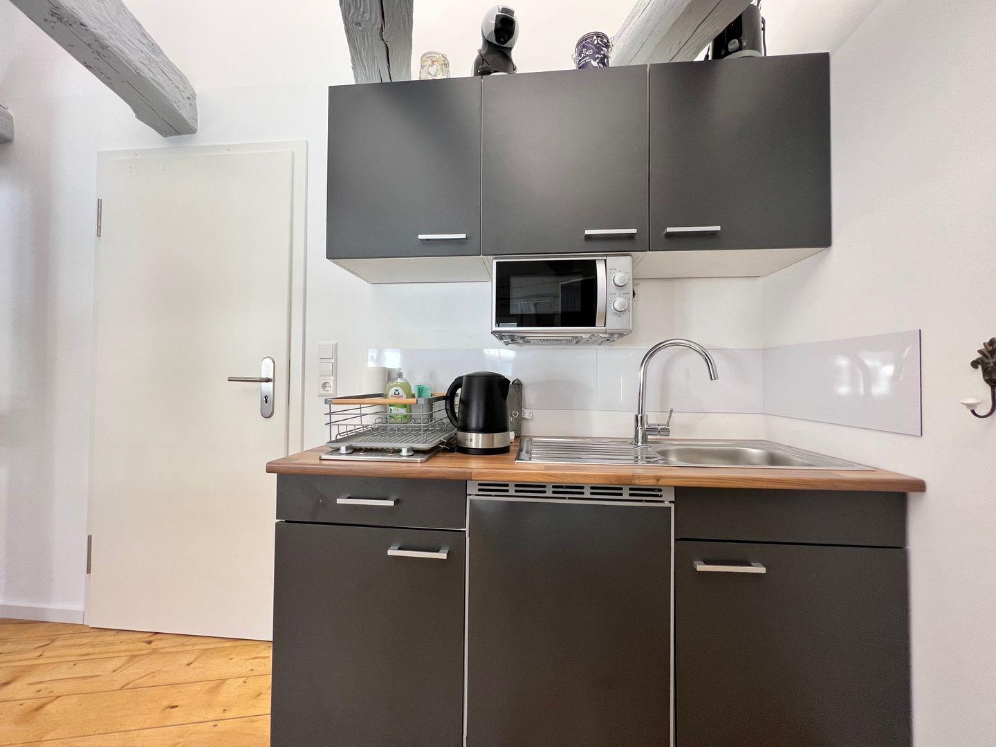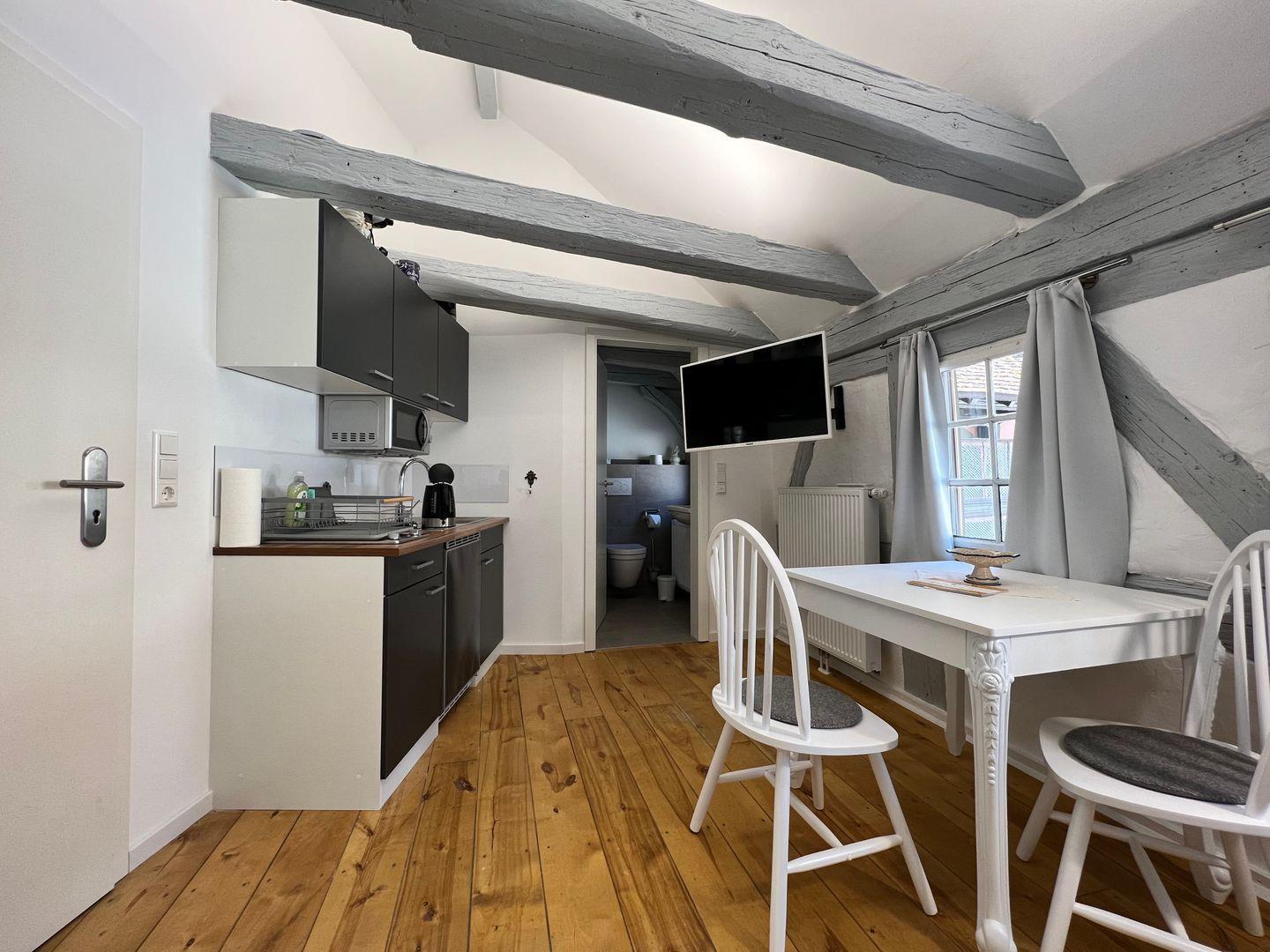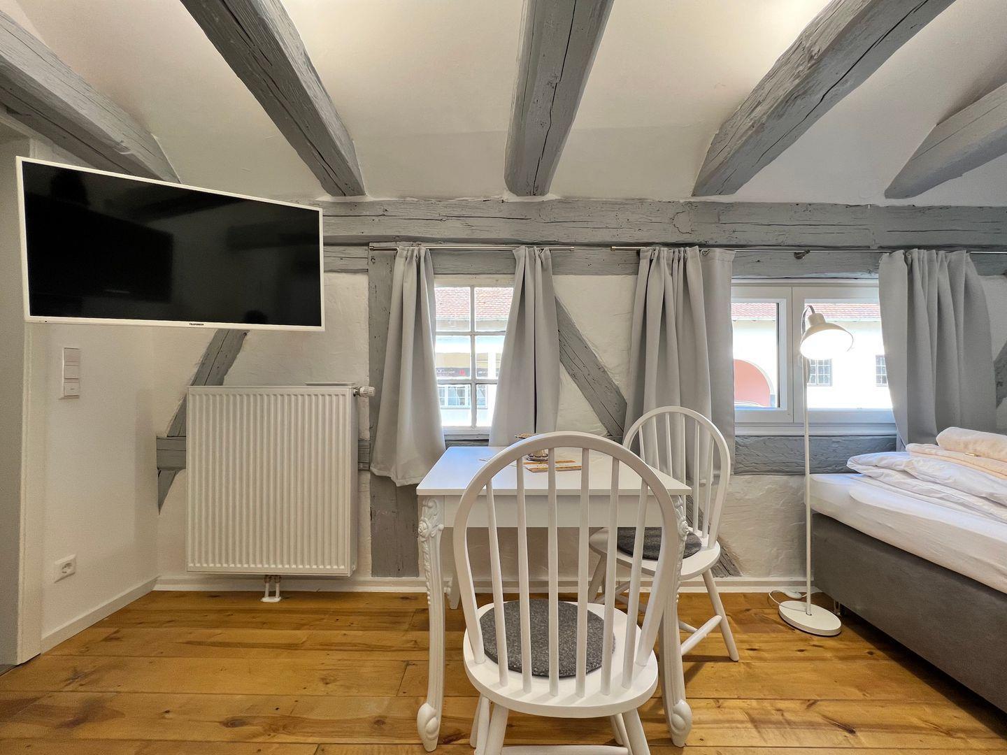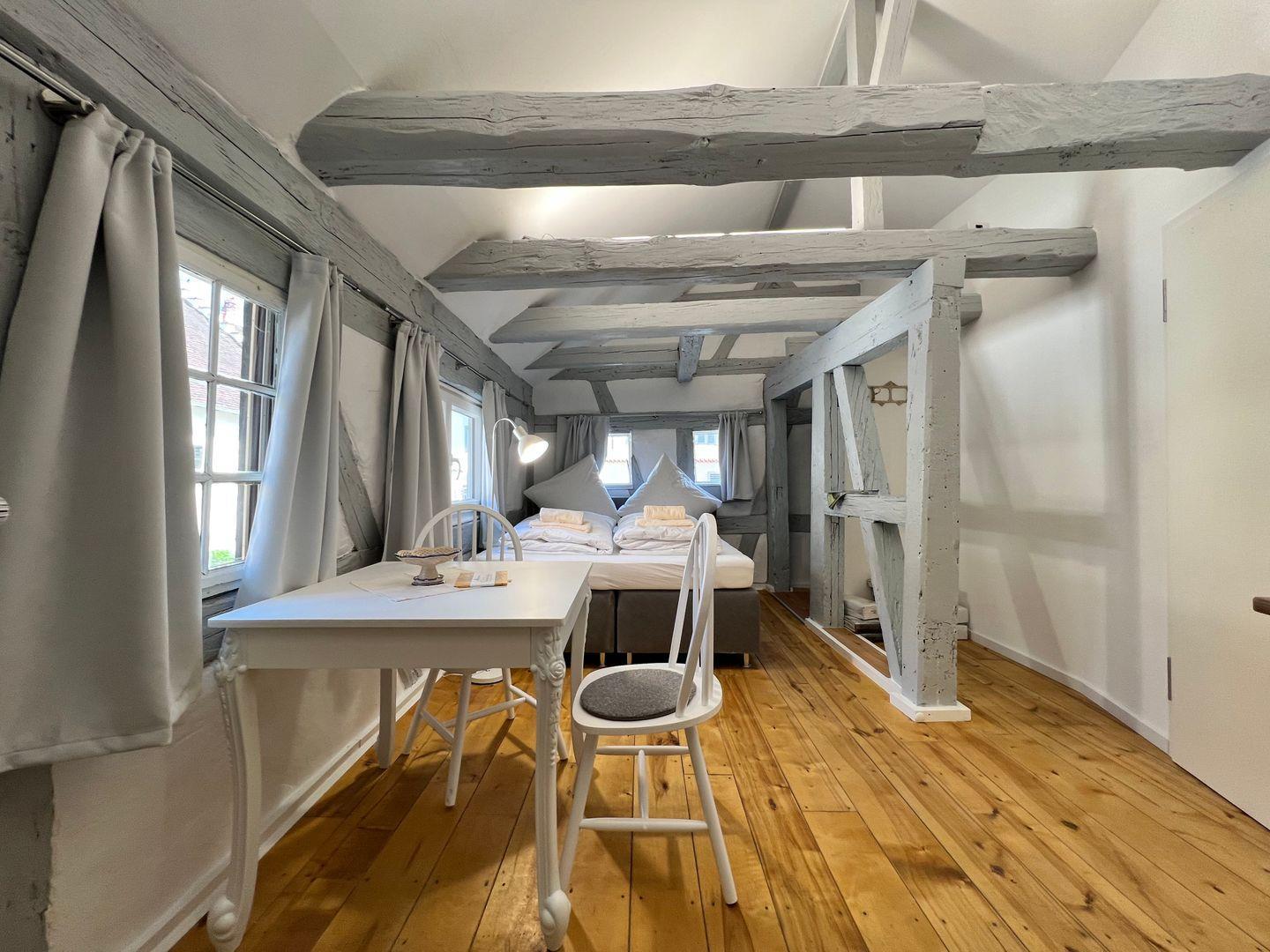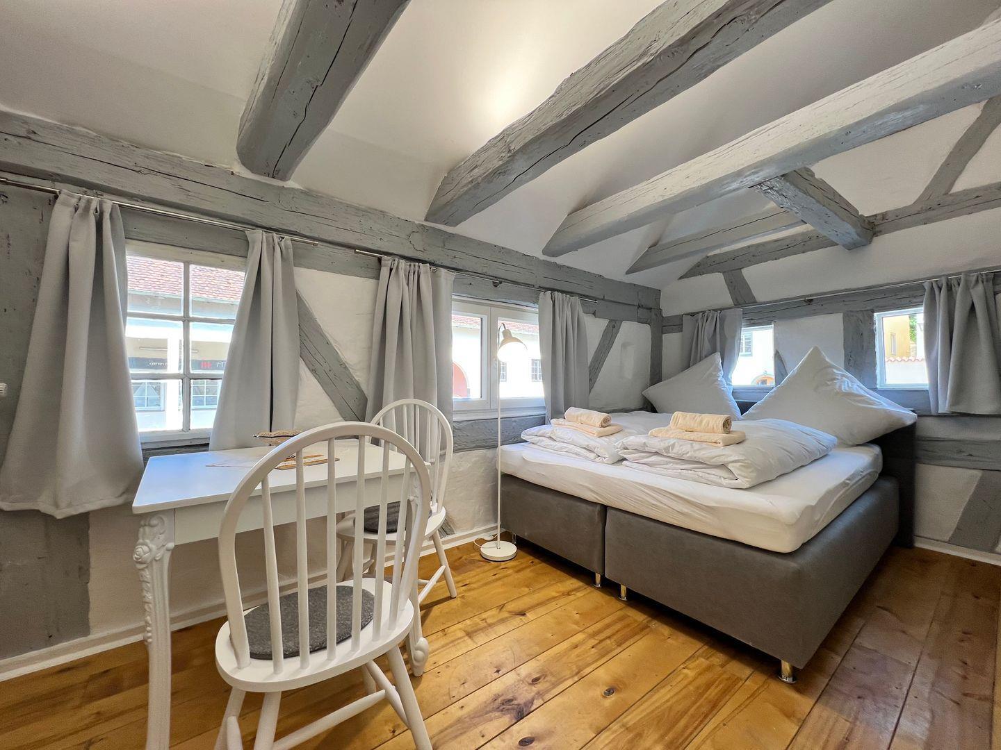 Die helle 1-Zimmer-Ferienwohnung bietet ein komfortables Doppelbett (Liegefläche 160x200 cm) für bis zu zwei Personen. Die Ferienwohnung befindet sich in einem denkmalgeschützten Patrizierhaus und vereint modernste Ausstattung mit ausgefallenem Vintage-Design. Charmant verbindet sich das rustikale Ambiente des historischen Gebäudes mit zeitgemäßem Komfort und neuwertiger Ausstattung. Eine harmonische Kombination aus natürlichem Landhausstil und stilvollem Shabby-Chic unterstreichen die Gemütlichkeit dieser Ferienunterkunft.