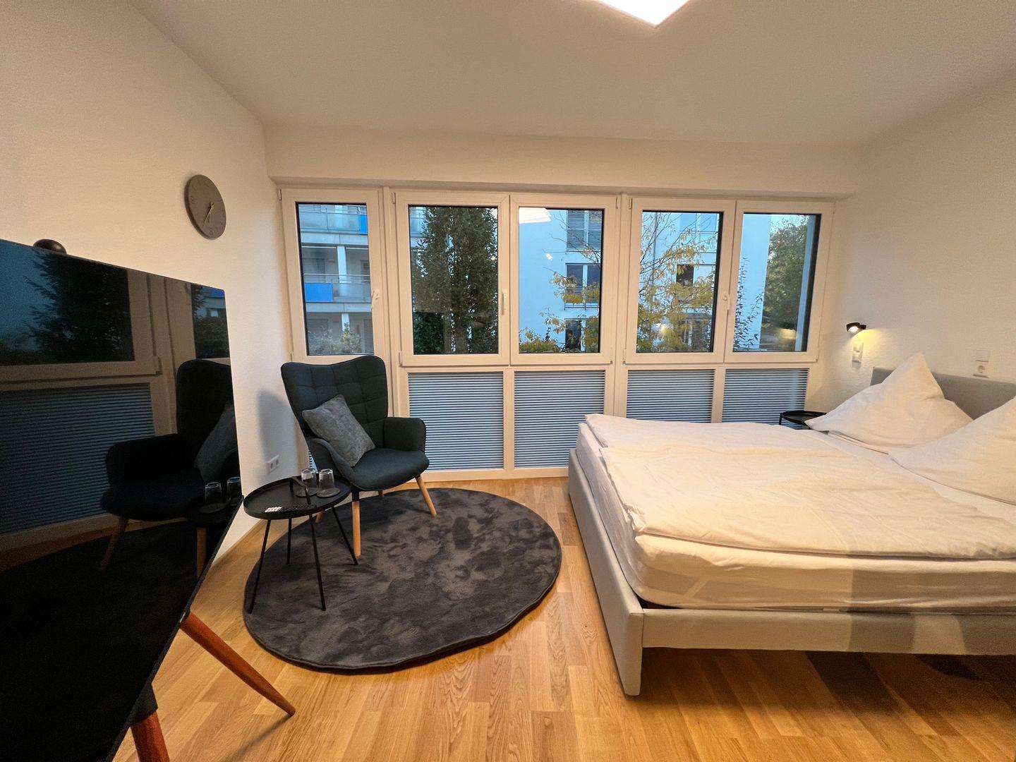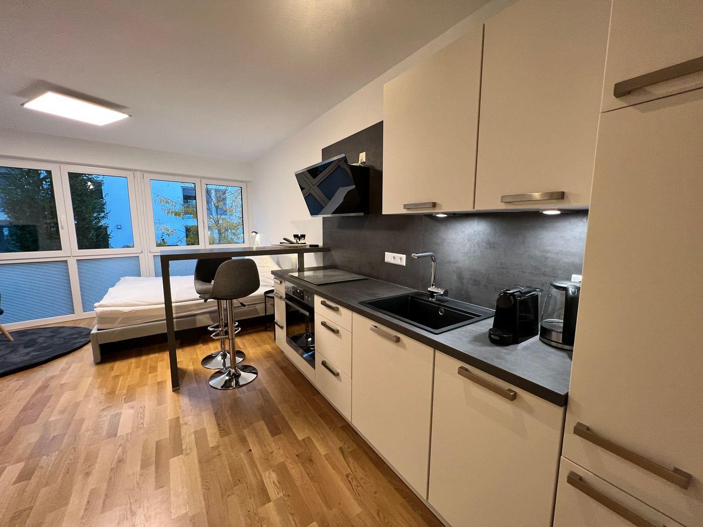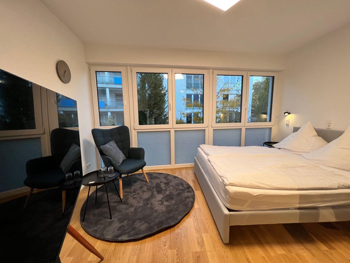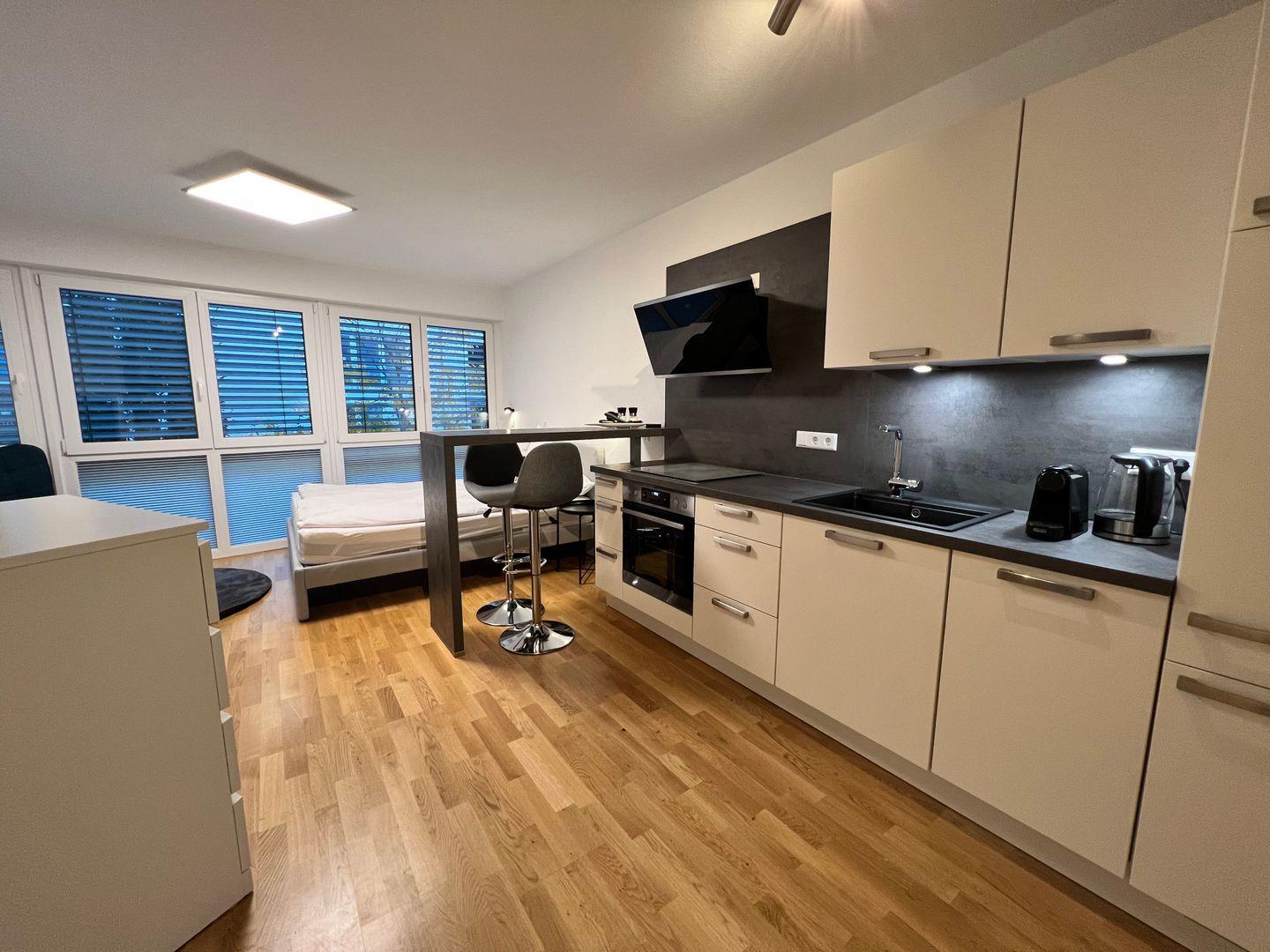 Der Wohn- und Schlafbereich beeindruckt durch ein gemütliches Doppelbett (160x200 cm) und einem 55 Zoll Smart-TV. Der geräumige Einbauschrank im Eingangsbereich sorgt für Ordnung und ausreichend Stauraum. Die offene Küchenzeile ist darauf ausgerichtet, Ihnen einen komfortablen und genussvollen Aufenthalt zu bieten. Die Küche verfügt über Spülmaschine, Induktionsherd und Backofen, Kühlschrank mit Gefrierfach, Nespresso-Kaffeemaschine und Milchaufschäumer sowie Wasserkocher. Die Küche ist vollständig mit hochwertigem Geschirr, Besteck, Gläsern, Töpfen und Pfannen ausgestattet, um sicherzustellen, dass Sie alle Annehmlichkeiten einer durchdachten Küche nutzen können.