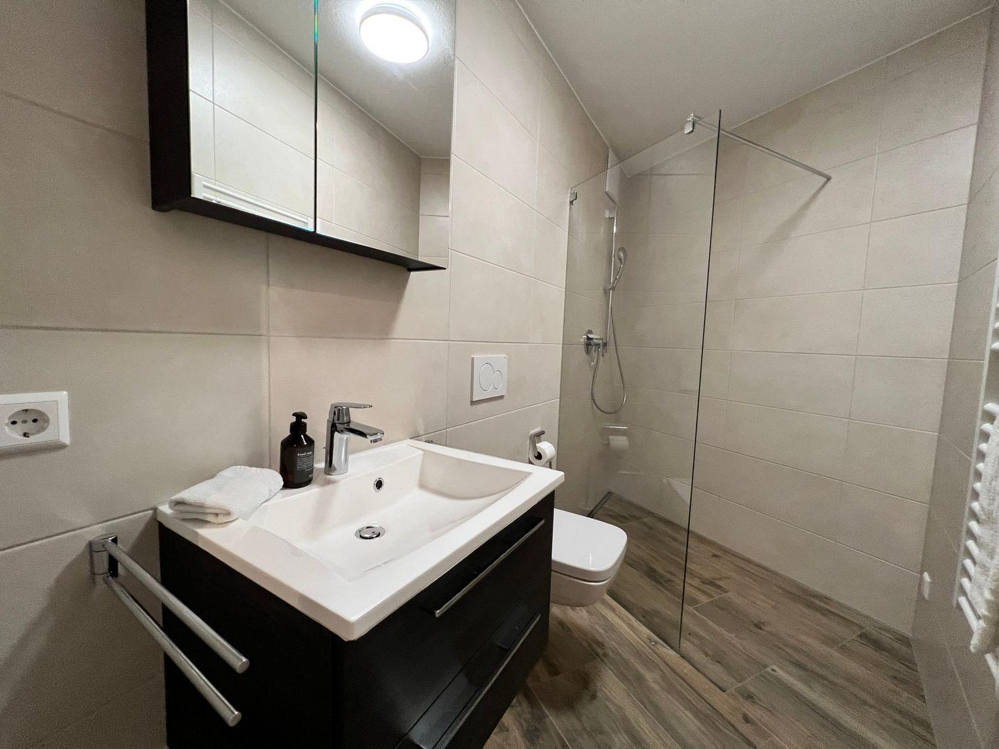 Das Badezimmer besteht aus Dusche, Waschtisch und WC und ist mit hochwertigen Materialien ausgestattet, um Ihnen ein modernes und komfortables Ambiente zu bieten. Die großzügige offene Dusche ermöglicht ein angenehmes Duscherlebnis. Ein Föhn steht für unsere Gäste zur Verfügung.