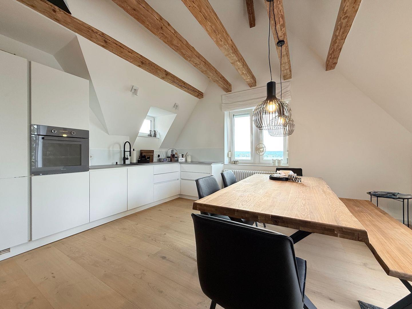 Im Mittelpunkt des Wohnbereichs steht das offene Wohnzimmer mit Parkettboden, Sofaecke und mehreren Sitzmöglichkeiten wie Sesseln und Esstisch. Durch die offene Gestaltung zur modernen Einbauküche entsteht eine einladende Atmosphäre, ideal für gemeinsame Mahlzeiten und gesellige Abende. Die Küchenausstattung lässt keine Wünsche offen: Induktionsherd, Elektro-Backofen, Kühlschrank mit Gefrierfach, Spülmaschine, Kaffeemaschine, Wasserkocher, Toaster, Mixer, umfassende Küchenutensilien sowie Geschirr und Besteck stehen Ihnen zur Verfügung. Dem Komfort dienen außerdem Geschirrhandtücher und Reinigungsmittel. Die Wohnräume bieten neben einem modernen Ambiente auch praktische Details wie Garderobe, Schuhschrank, Kommode, Schreibtisch sowie einen Ganzkörperspiegel.