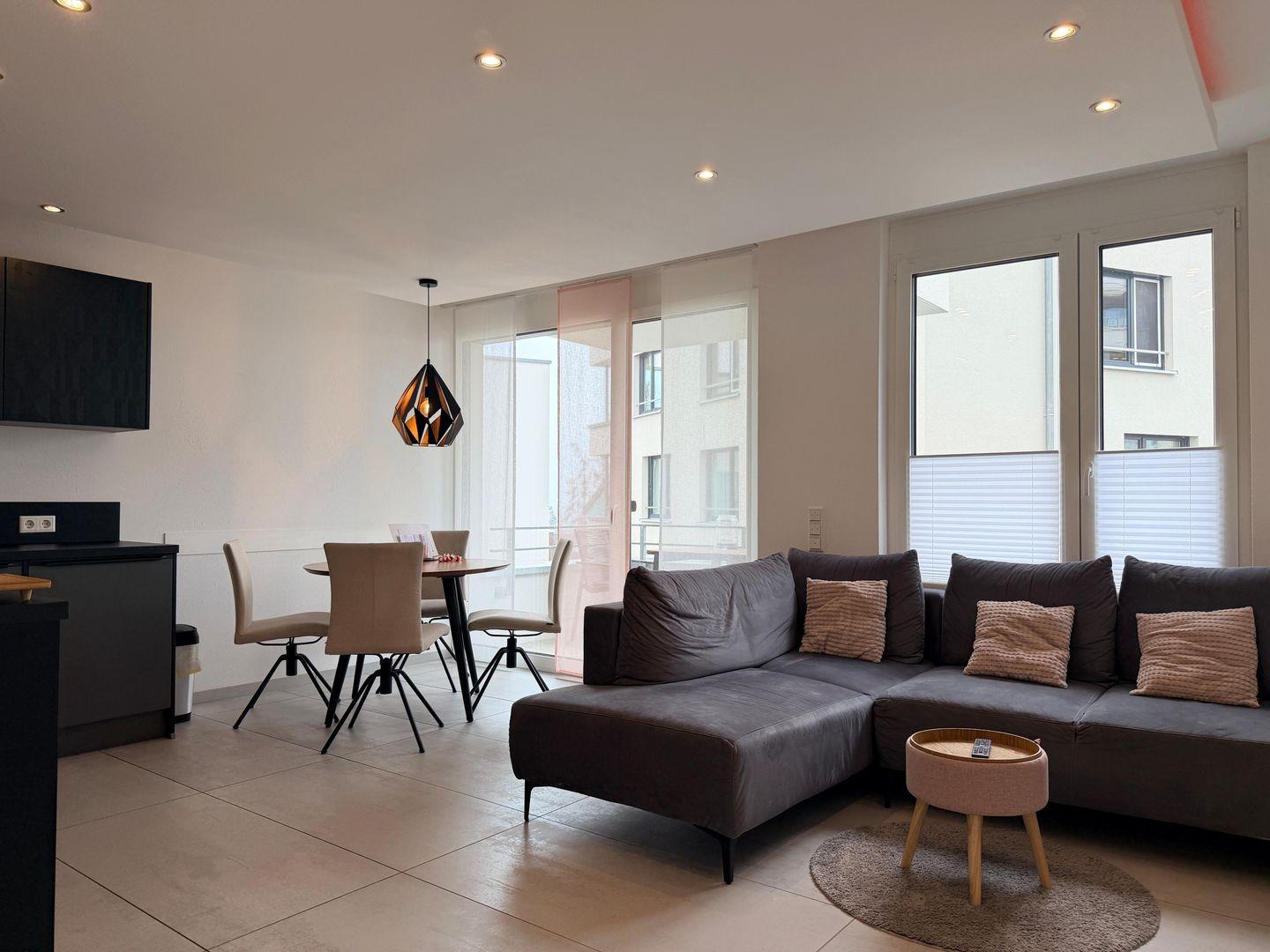 Die Ferienwohnung bietet ein gemütliches Wohnzimmer mit seitlichen Blick auf den Bodensee sowie offener Küche und Essbereich. Das liebevoll eingerichtete Wohnzimmer ist mit einem 55’ Fernseher ausgestattet und kann durch das ausziehbare Schlafsofa noch 1-2 zusätzliche Schlafmöglichkeiten schaffen.