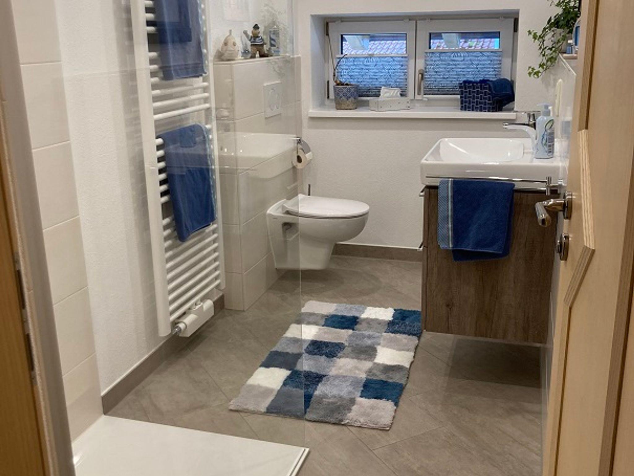 • Das moderne Badezimmer verfügt über eine begehbare Dusche, WC, Handtücher, Fön, Fußbodenheizung und Handtuchheizkörper.