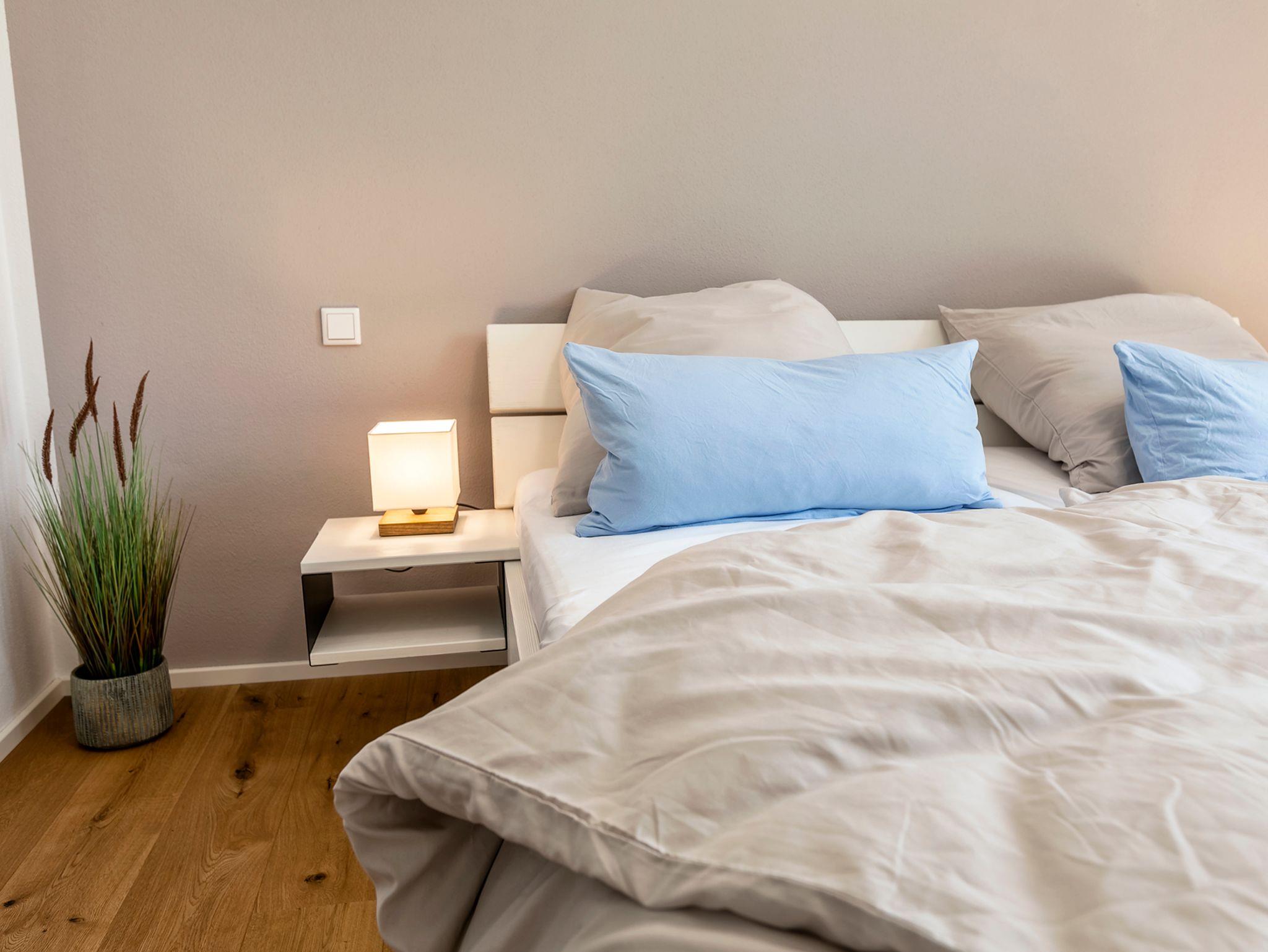 Wir haben ein gemütliches Schlafzimmer mit einem Doppelbett mit Zugang zur Terrasse. Gerne können wir Ihnen ein Beistellbett für ein Baby dazu stellen.