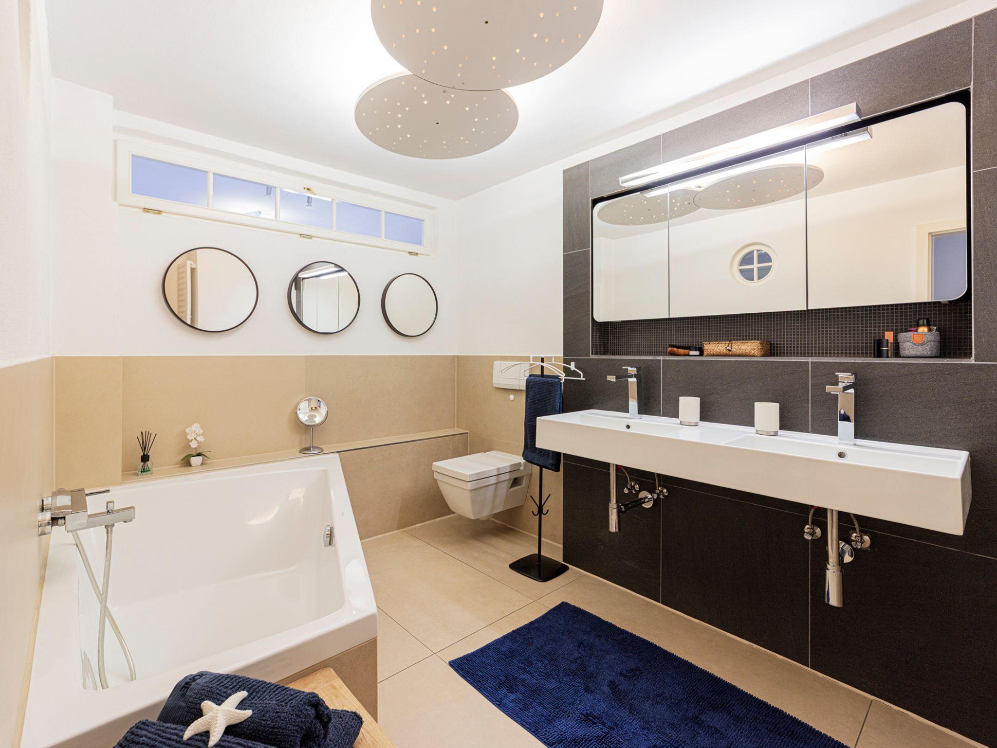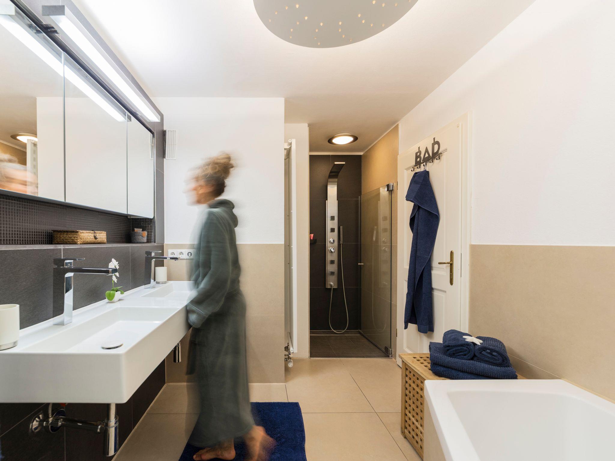 In der umfangreich ausgestatteten Küche mit Westbalkon macht das Kochen Spaß! Das moderne Bad mit seiner Regendusche und Doppelbadewanne lädt zum Entspannen ein. Im Schlafzimmer finden Sie ein großes, gemütliches 180-Doppelbett und viel Stauraum in den Schränken. Direkt nebenan befindet sich das Kinderzimmer mit Stockbett (90x200) und Kinderspielsachen. Privater Parkplatz direkt vor der Tür.