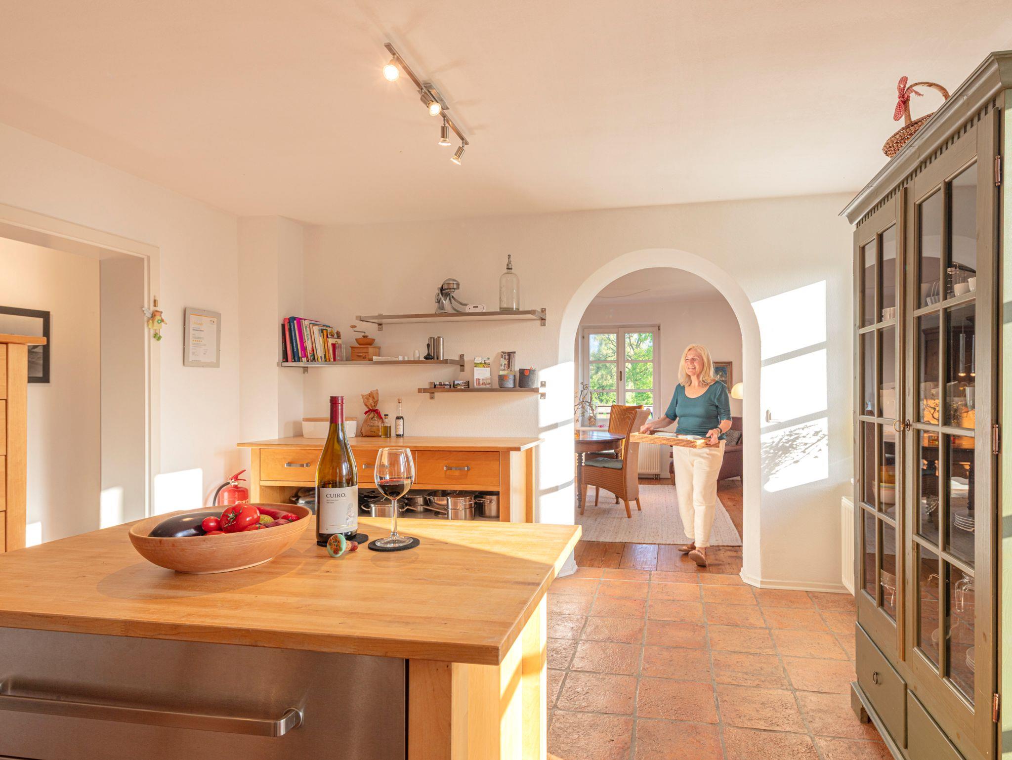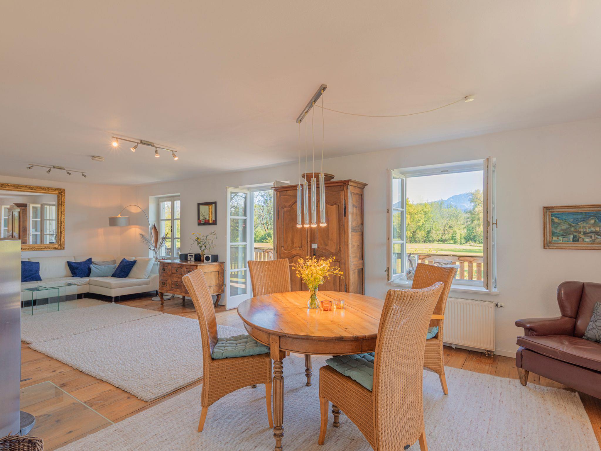 Der sonnige Wohn- Essbereich bietet eine gelungene Mischung aus antiken und modernen Möbeln. Direkt vom Wohnzimmer aus gelangen Sie auf den 20 m2 großen Holzbalkon. Für die kühleren Jahreszeiten schafft ein Kaminofen Behaglichkeit.