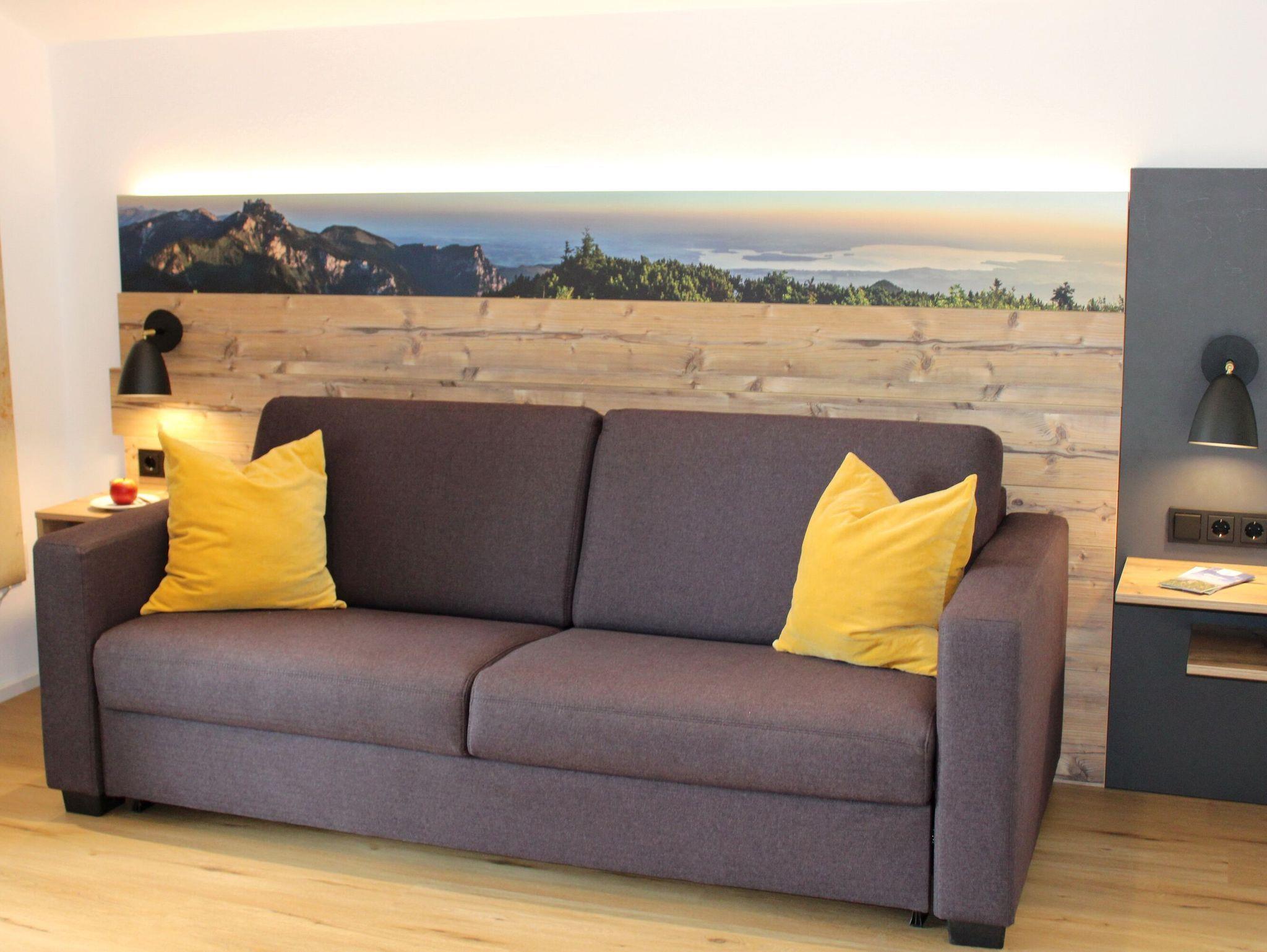 Sie verfügt über ein Schlafzimmer mit Doppelbett, ein Wohnzimmer mit hochwertigem Schlafsofa (echte Matratze), einen offenen Wohn-/Essbereich mit voll ausgestatteter Küche sowie ein neues, modernes Bad mit Dusche, WC und Waschmaschine. Der große Südbalkon mit Bergblick, Sitzgruppe und Liegen ist vom Wohn- und Essbereich aus zugänglich. WLAN, Bettwäsche, Handtücher, Fahrradschuppen und ein Stellplatz vor dem Haus sind inklusive.