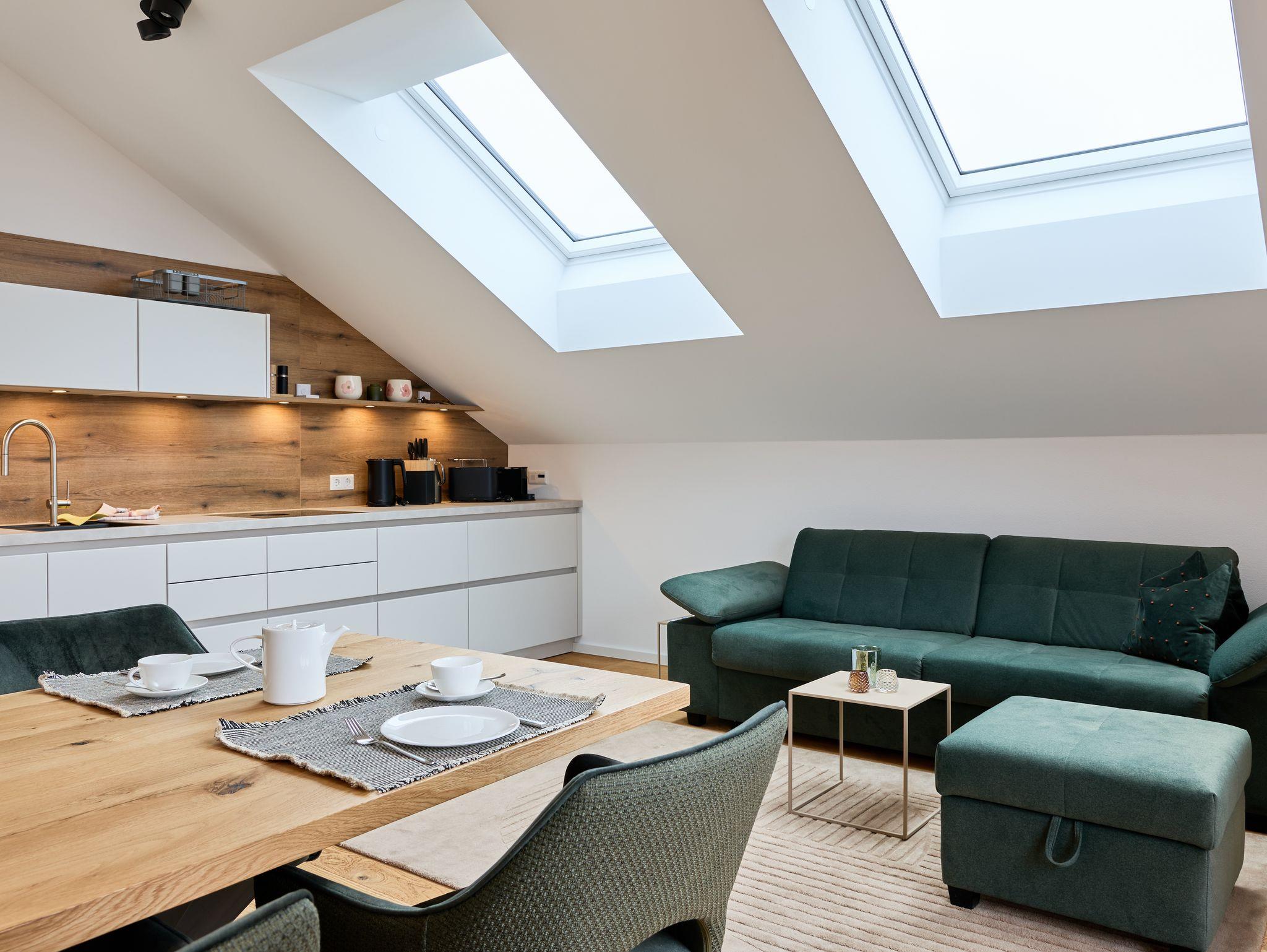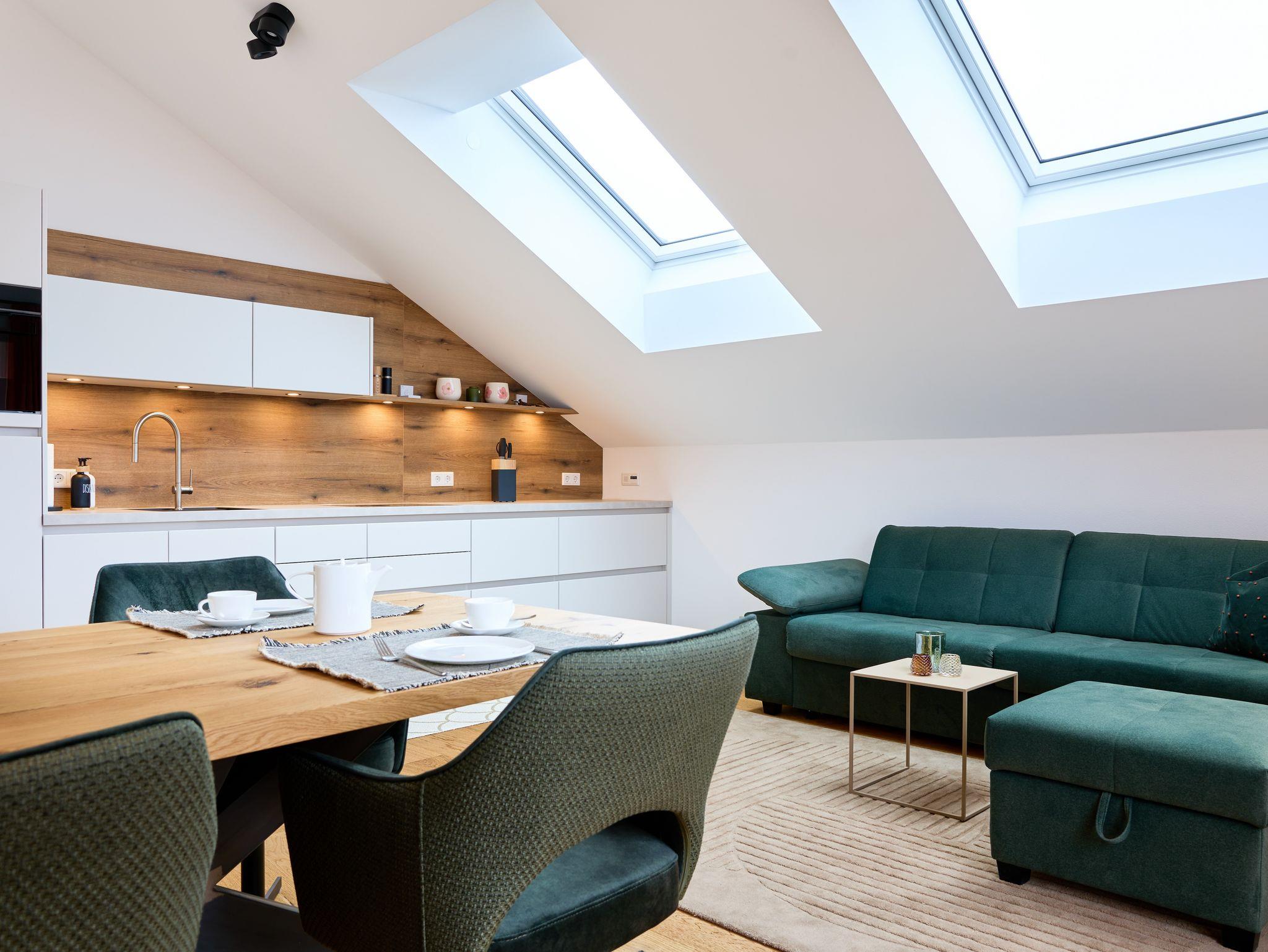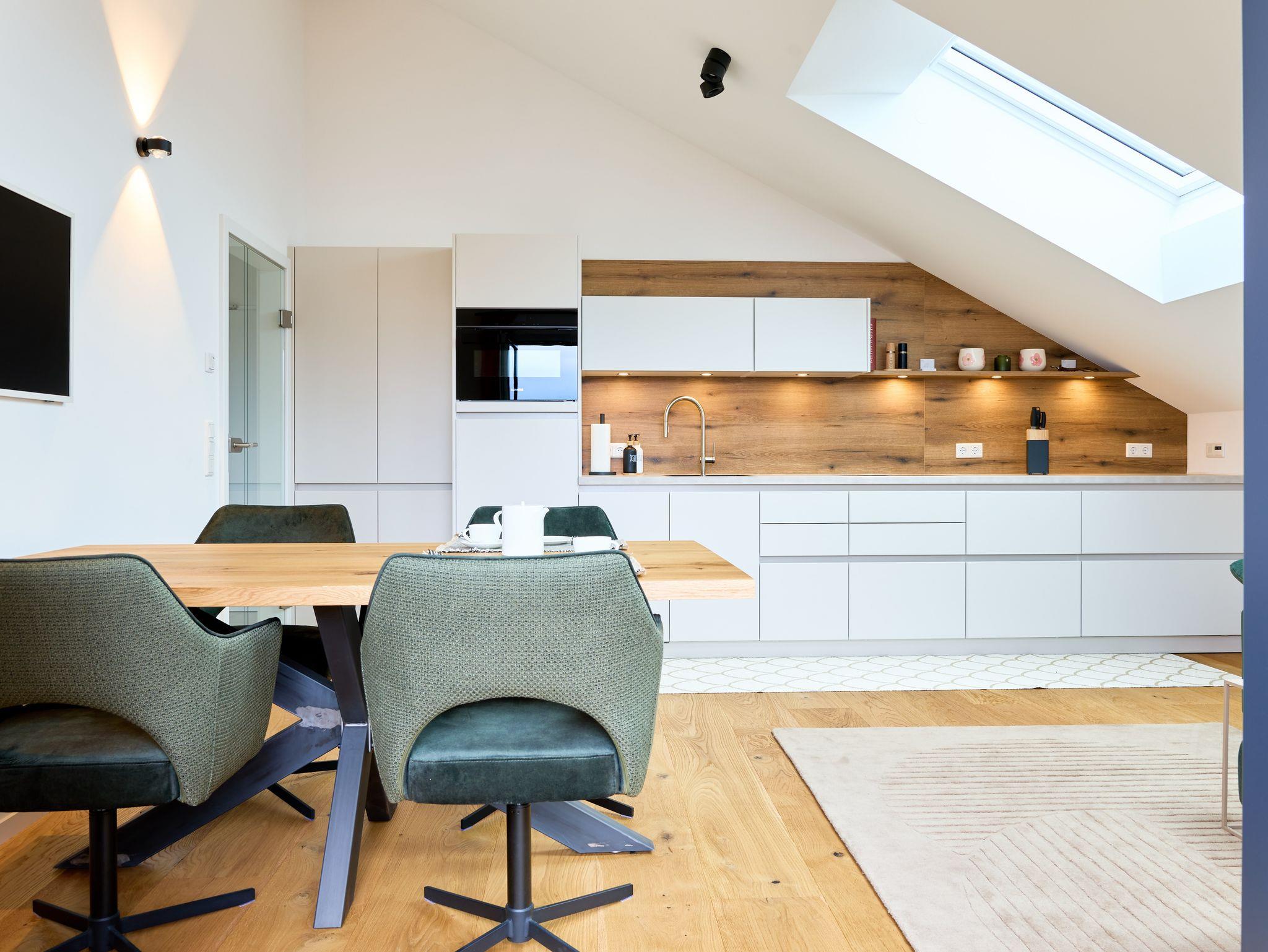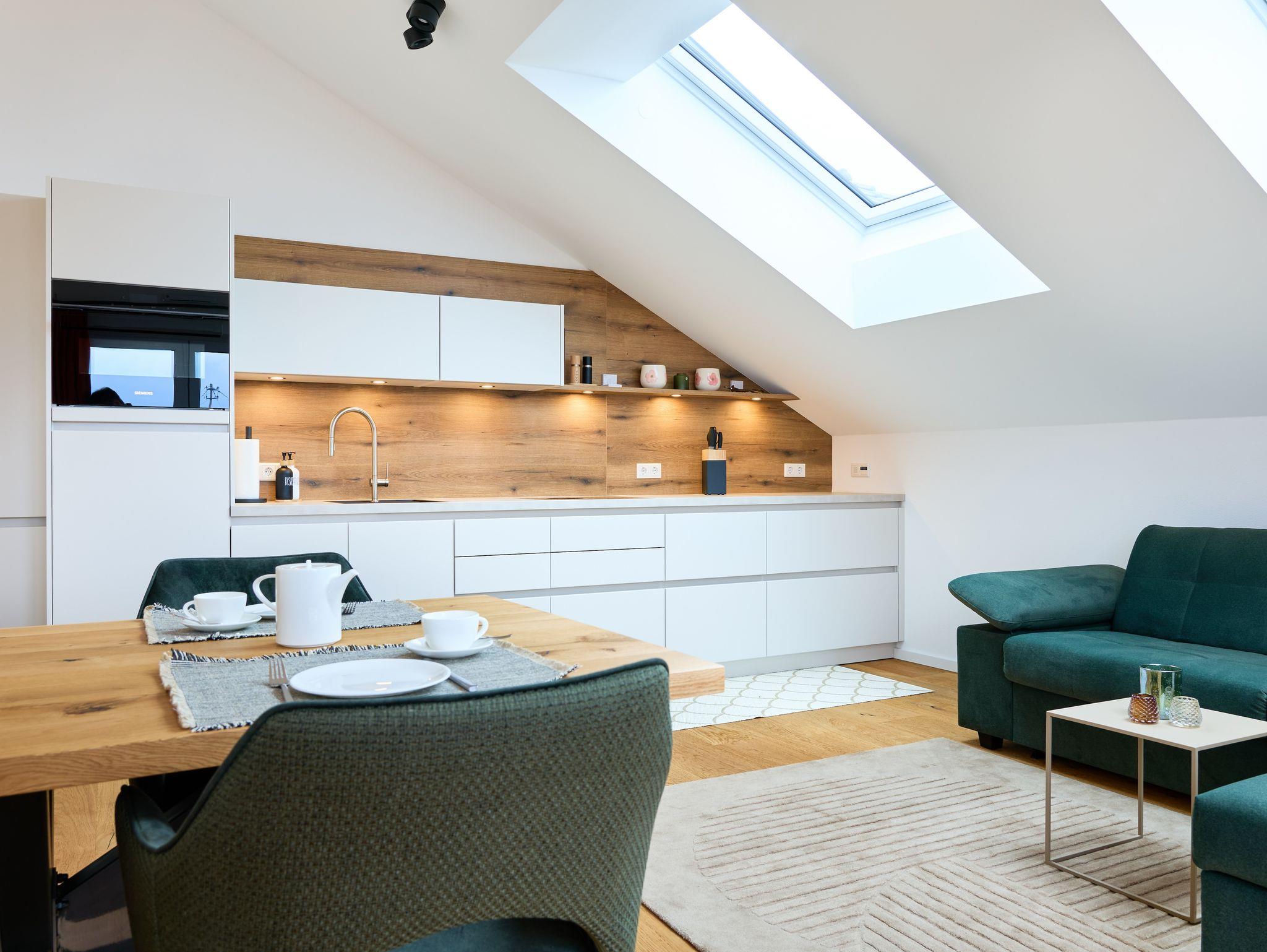 Hier ist nichts dem Zufall überlassen: Edler Parkettboden, maßgefertigte Schreinerküche, moderne Designerleuchten und fein ausgewählte Textilien schaffen eine Wohnatmosphäre, die sowohl puristisch als auch gemütlich ist. Ob am schönen Holz-Esstisch unter der offenen Dacharchitektur oder am Sommerabend auf dem Balkon – hier fühlst du dich sofort wie zuhause (nur besser).