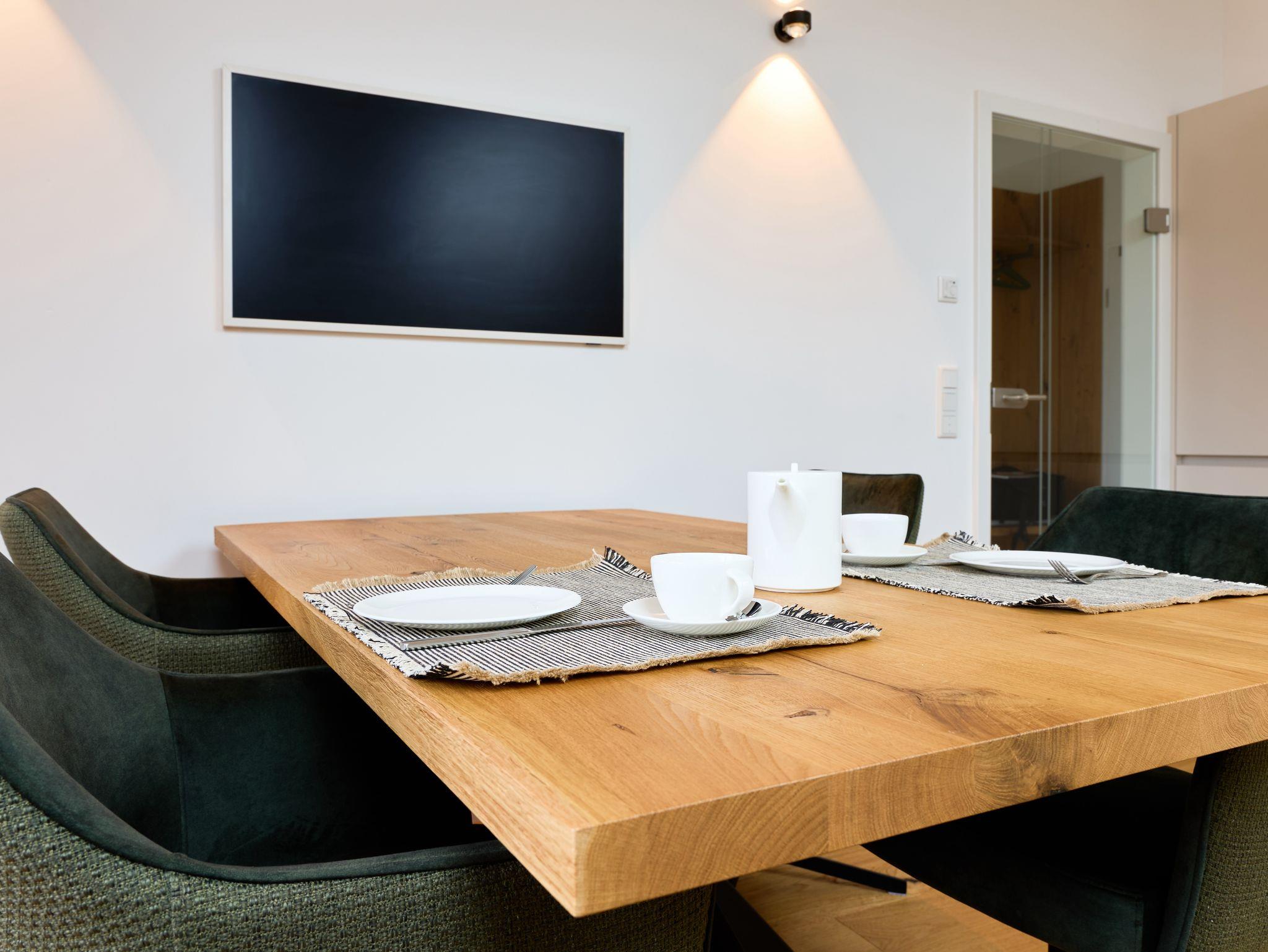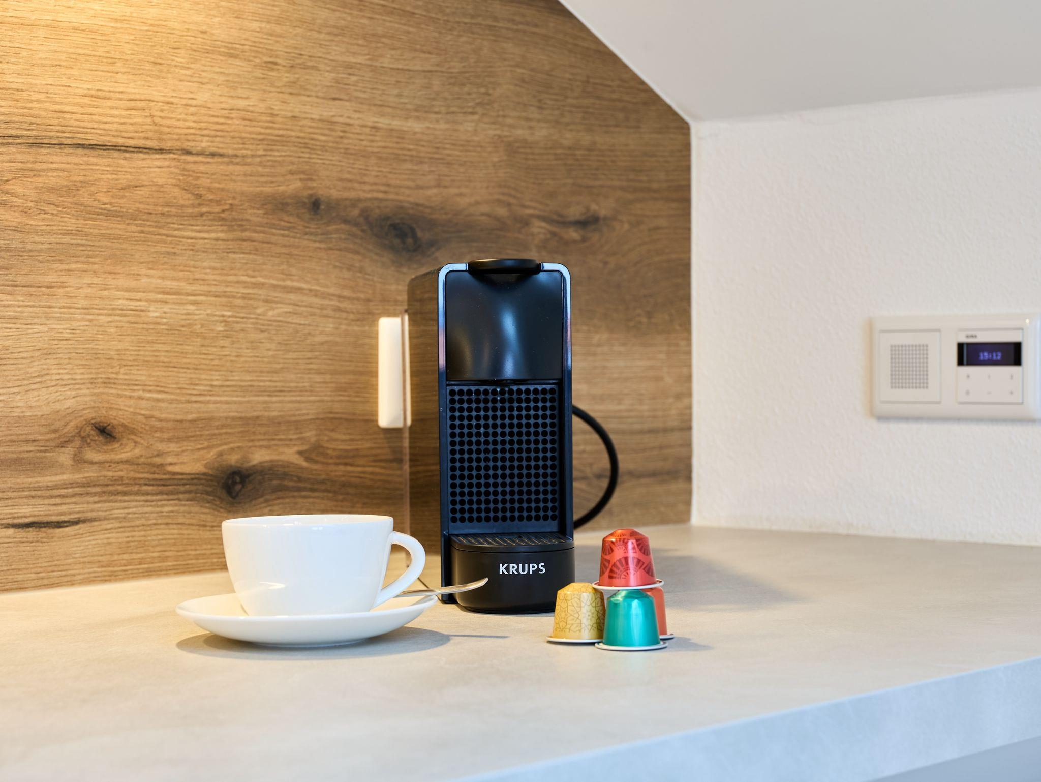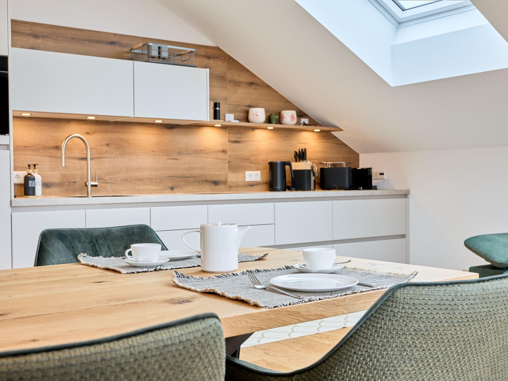 Die offene Wohnküche lässt keine Wünsche offen – mit modernen Geräten, stilvoller Ausstattung und liebevollen Details wie einer Espressomaschine für den ersten Kaffee mit Bergblick.