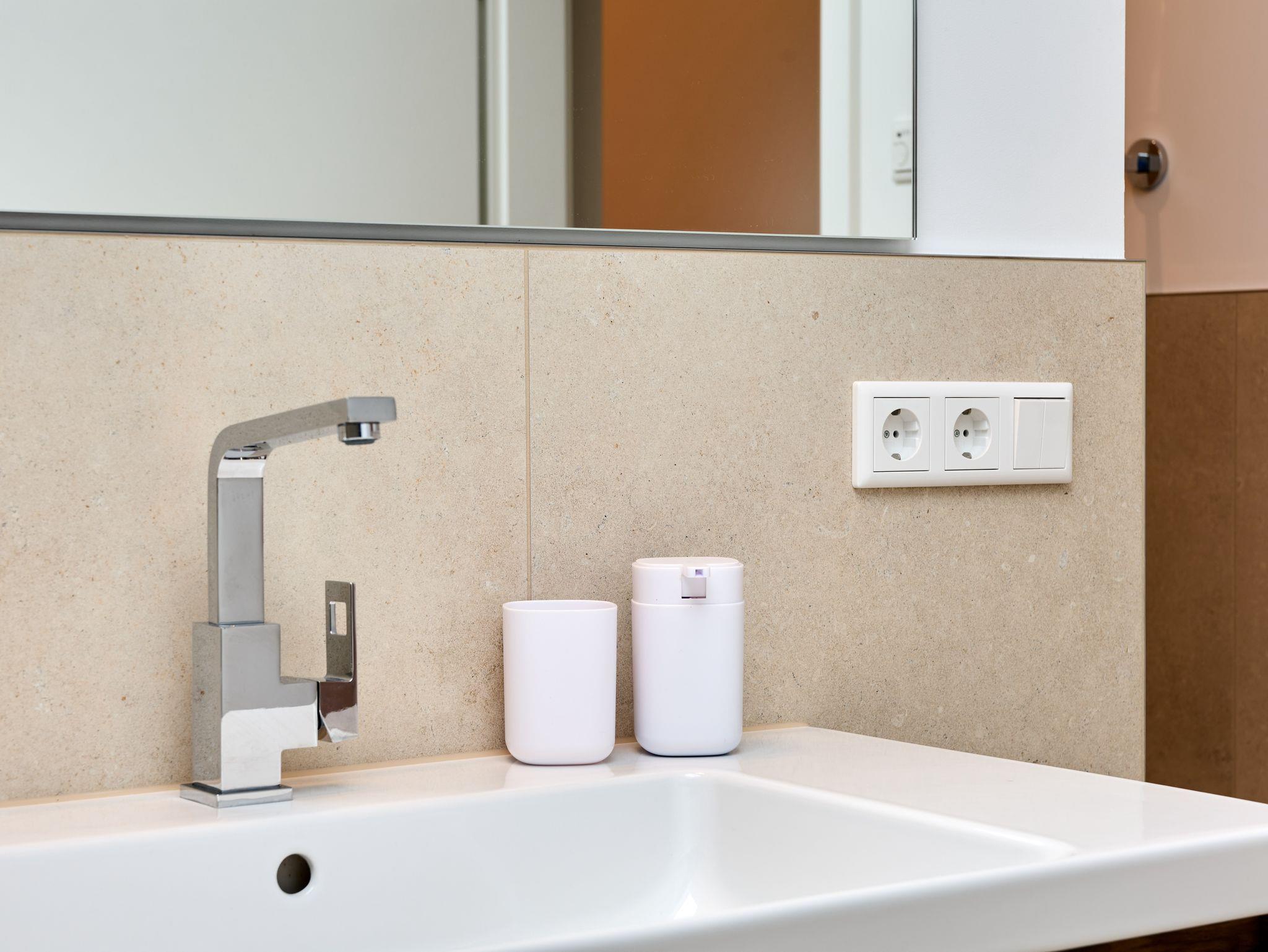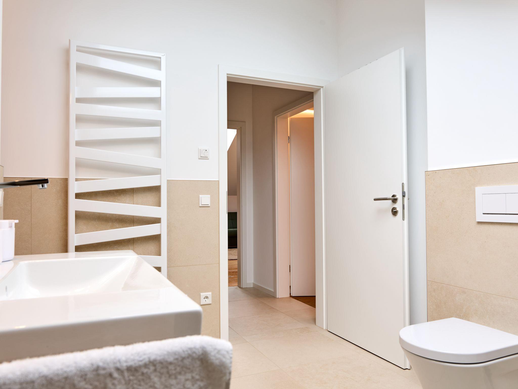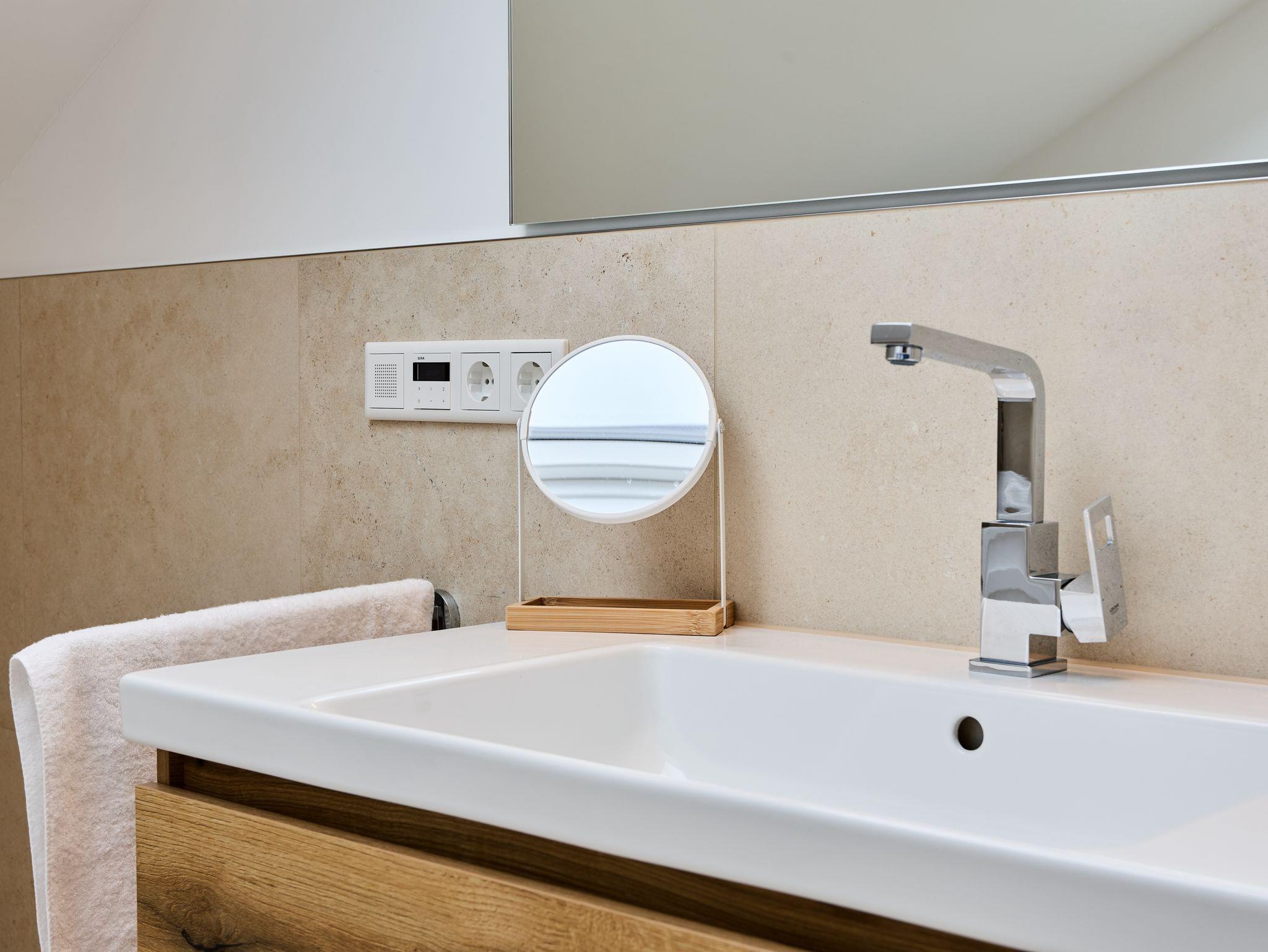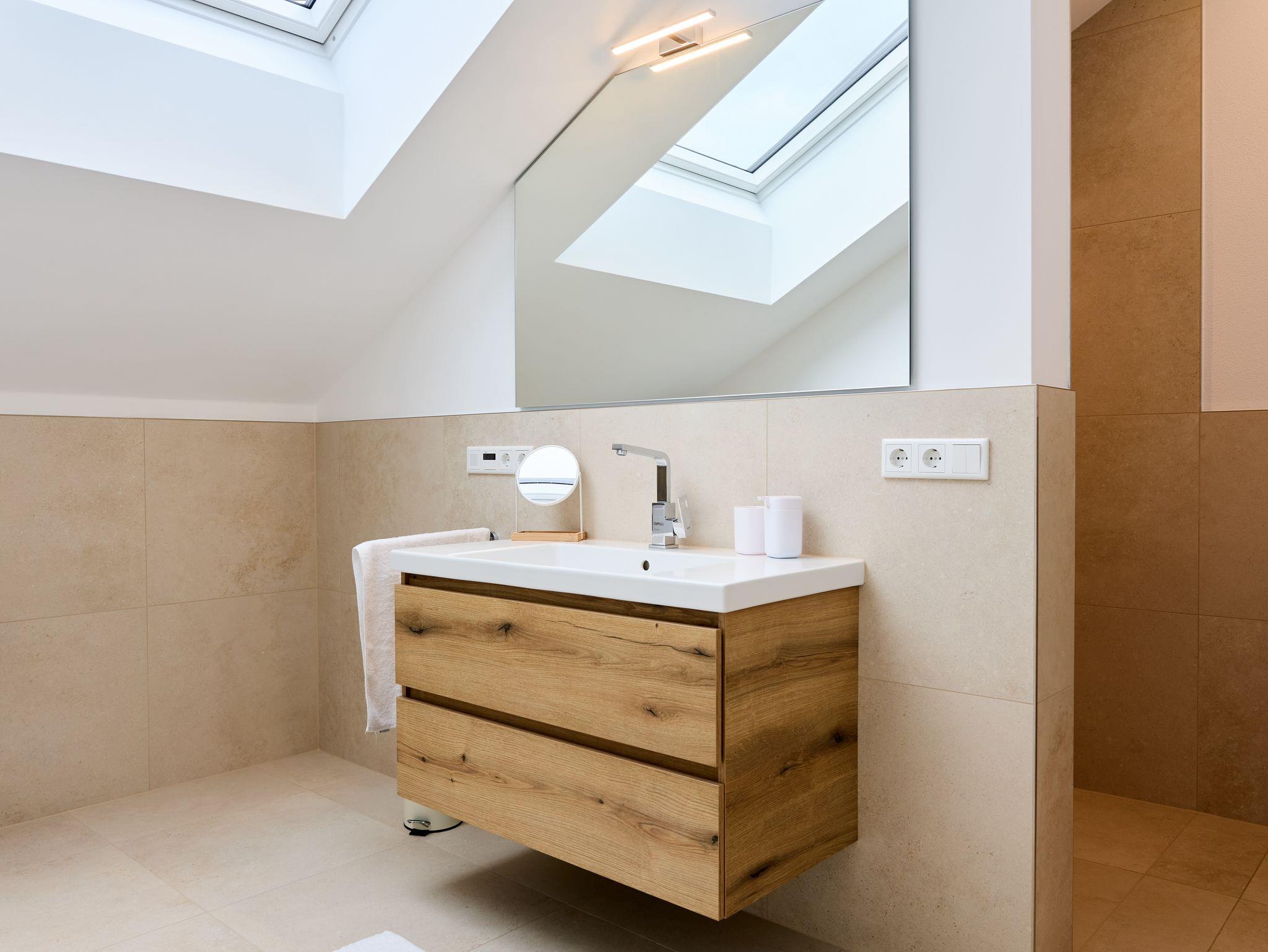 Auch das Badezimmer steht dem Rest in nichts nach: Mit viel Licht von oben, bodenebener Dusche, Waschmaschine und geschmackvollen Details ist es der perfekte Ort für einen entspannten Start in den Tag.
