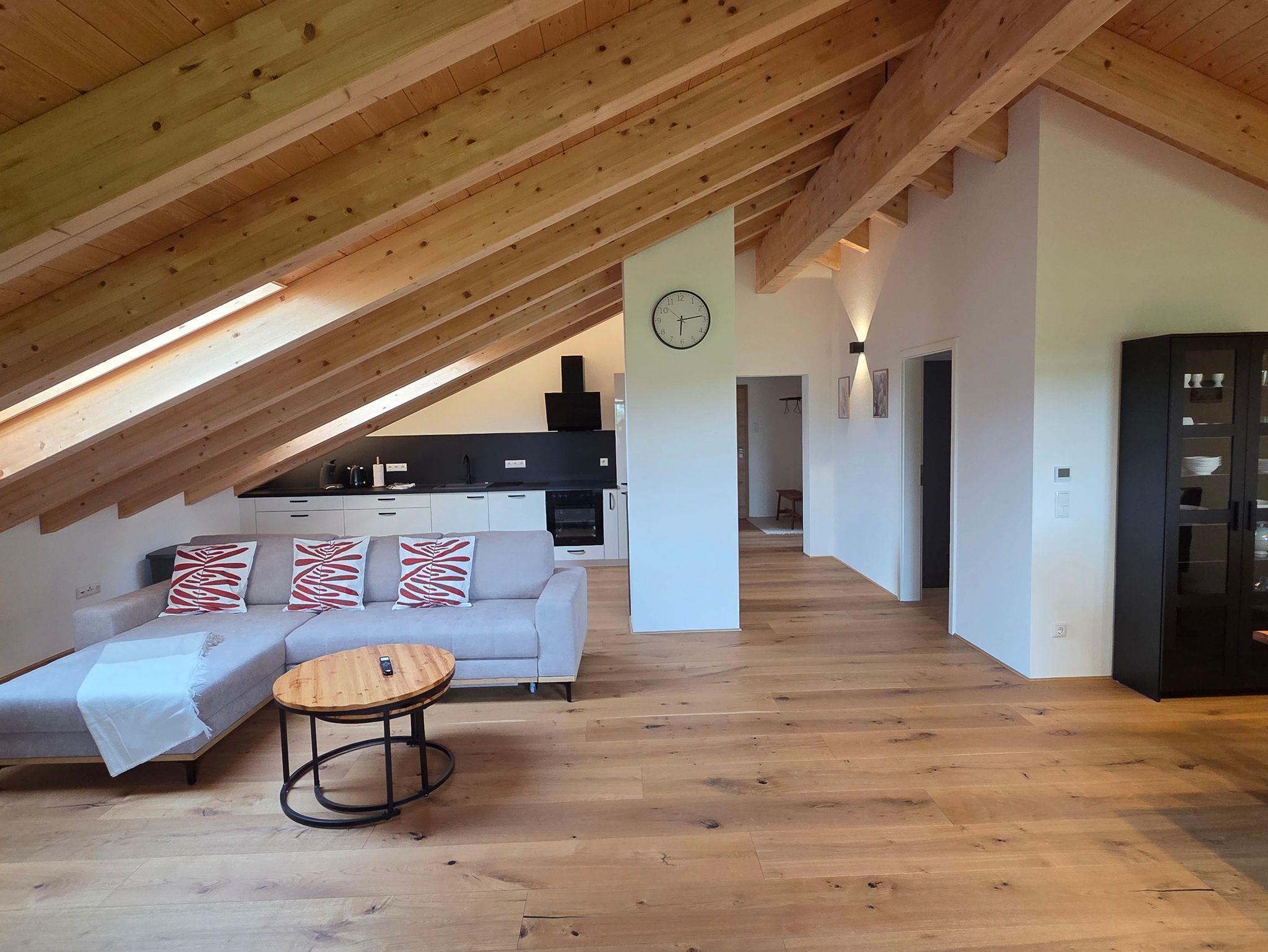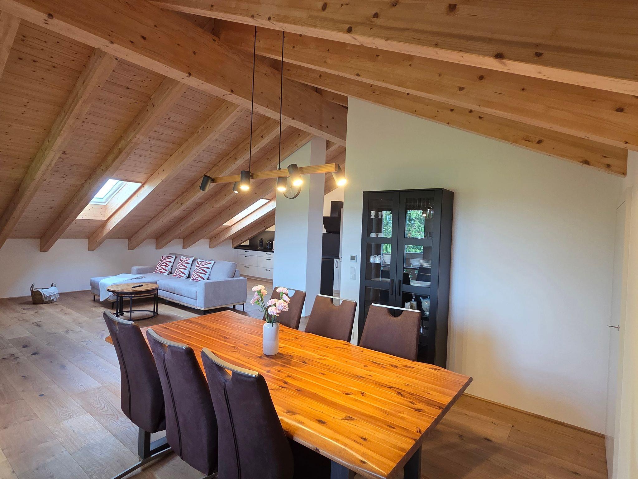 Die Wohnung überzeugt durch hochwertige Ausstattung und eine klare, moderne Gestaltung mit viel Holz, darunter Eichen-Echtholzdielen in den Wohn- und Schlafbereichen sowie ein sichtbarer Dachstuhl mit Dachfenstern, der für ein helles und natürliches Ambiente sorgt.