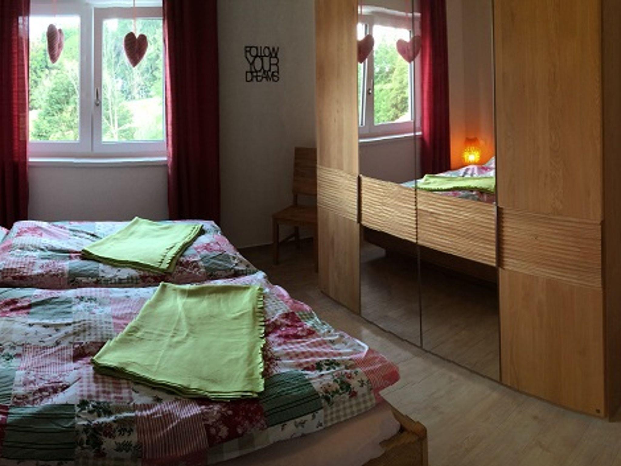 Das Schlafzimmer ist komfortabel mit Musterring Holzmöbeln ausgestattet und verfügt über ein großes Doppelbett und genügend Stauraum in dem 2 Meter Schrank mit Spiegeltüren.