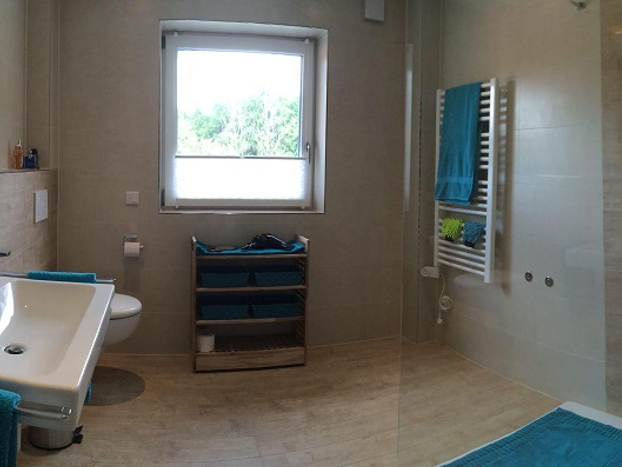 Das große Badezimmer wurde mit einer extragroßen, barrierefreien Dusche ausgestattet, Handtuchwärmer und großem Waschbecken mit beleuchtetem Spiegel. Ein Abstellraum verfügt über eine Waschmaschine, Wäschegestell, Staubsauger und Stauregale.