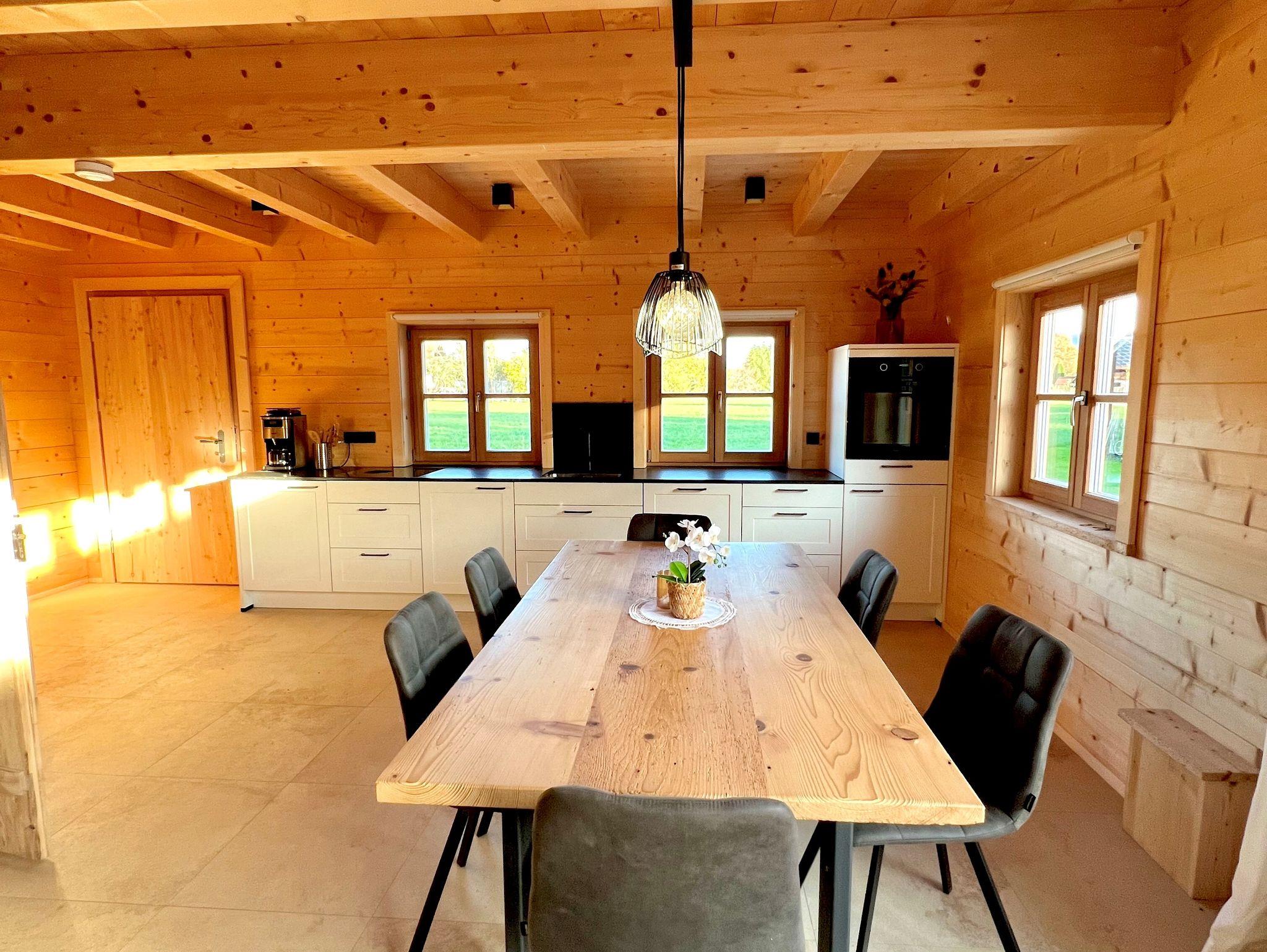 Das Holzhaus umfasst 90 qm Wohnfläche. Der Wohnbereich verfügt über eine voll ausgestattete Küche mit Essbereich, eine Schlafcouch und einen Flachbildfernseher. Vom Wohnbereich aus gelangt man auf die große Ost-Südterrasse und in den Garten. Es gibt zwei Schlafzimmer: Eins ist mit einem 180 cm x 200 cm Boxspringbett ausgestattet, das andere mit zwei 90 cm x 200 cm massiven Einzelbetten aus Holz. Das Bad verfügt über eine ebenerdige Dusche und WC. Als Extra ist ein Gäste-WC vorhanden.