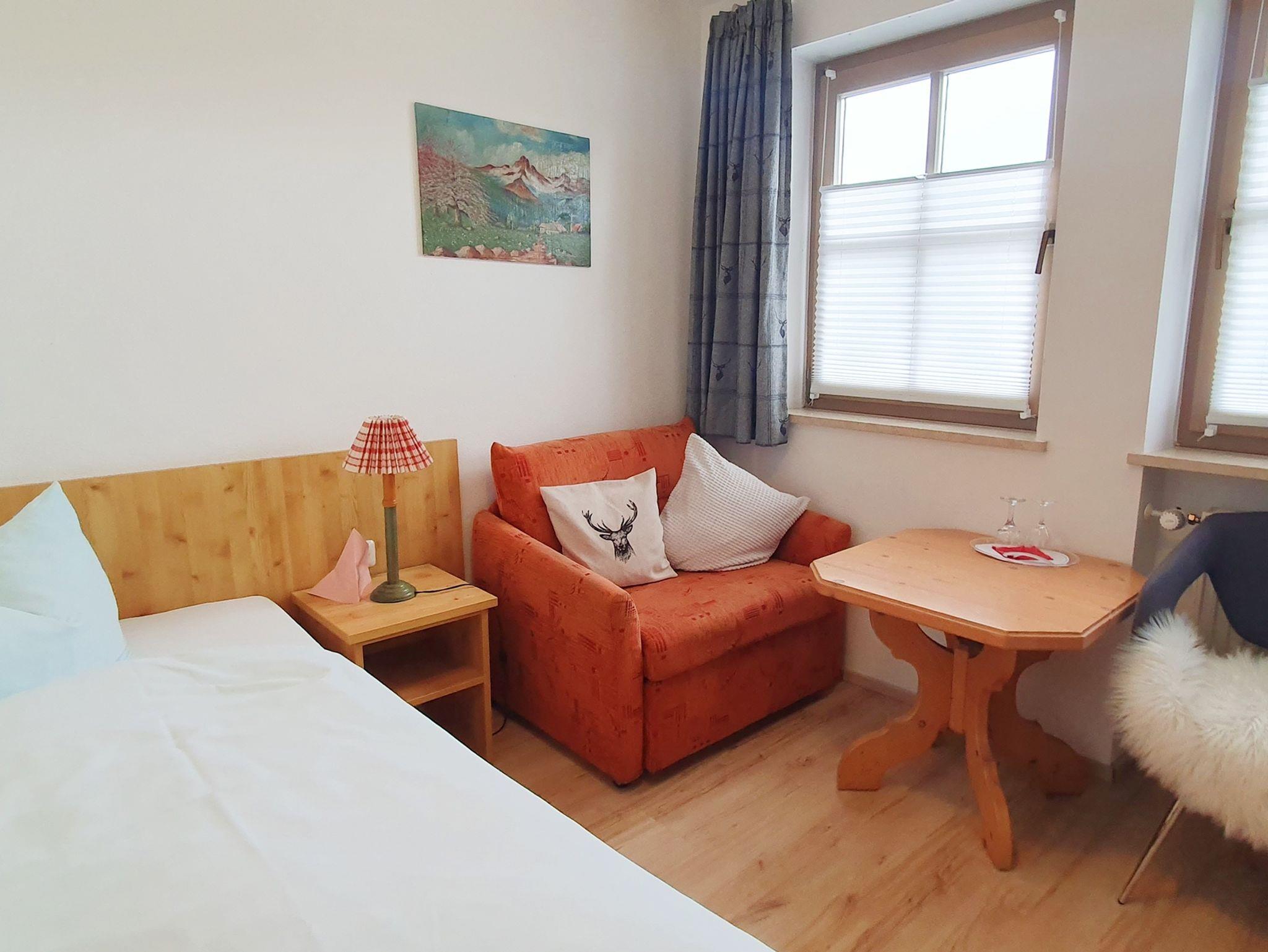 Unser komfortables Vierbettzimmer bietet Platz für bis zu vier Personen und ist ideal für Familien oder kleine Gruppen. Die Ausstattung umfasst ein gemütliches Doppelbett, ein Einzelbett sowie eine praktische Schlafcouch. Das Zimmer verfügt über ein eigenes Badezimmer mit Dusche und WC.