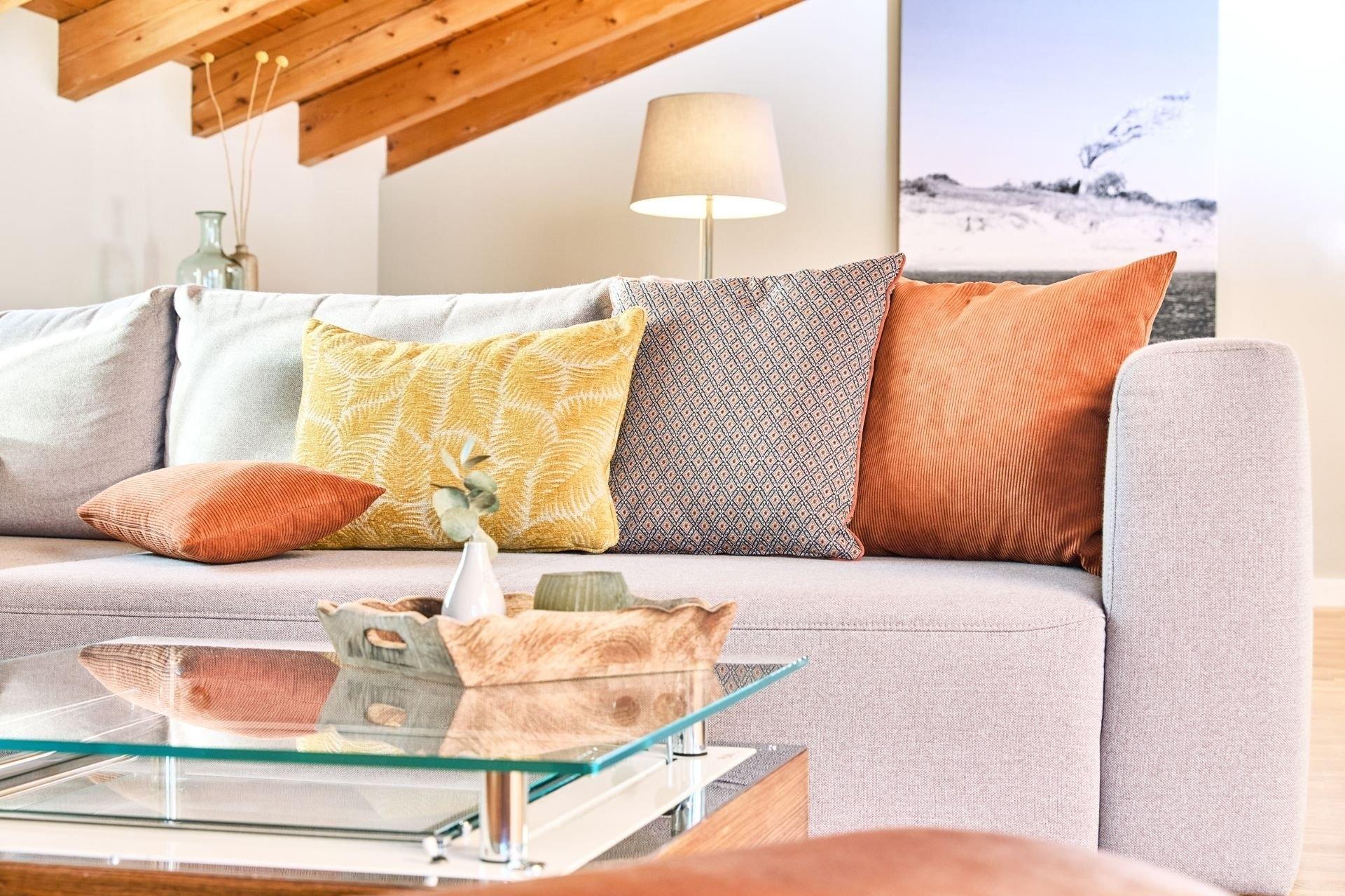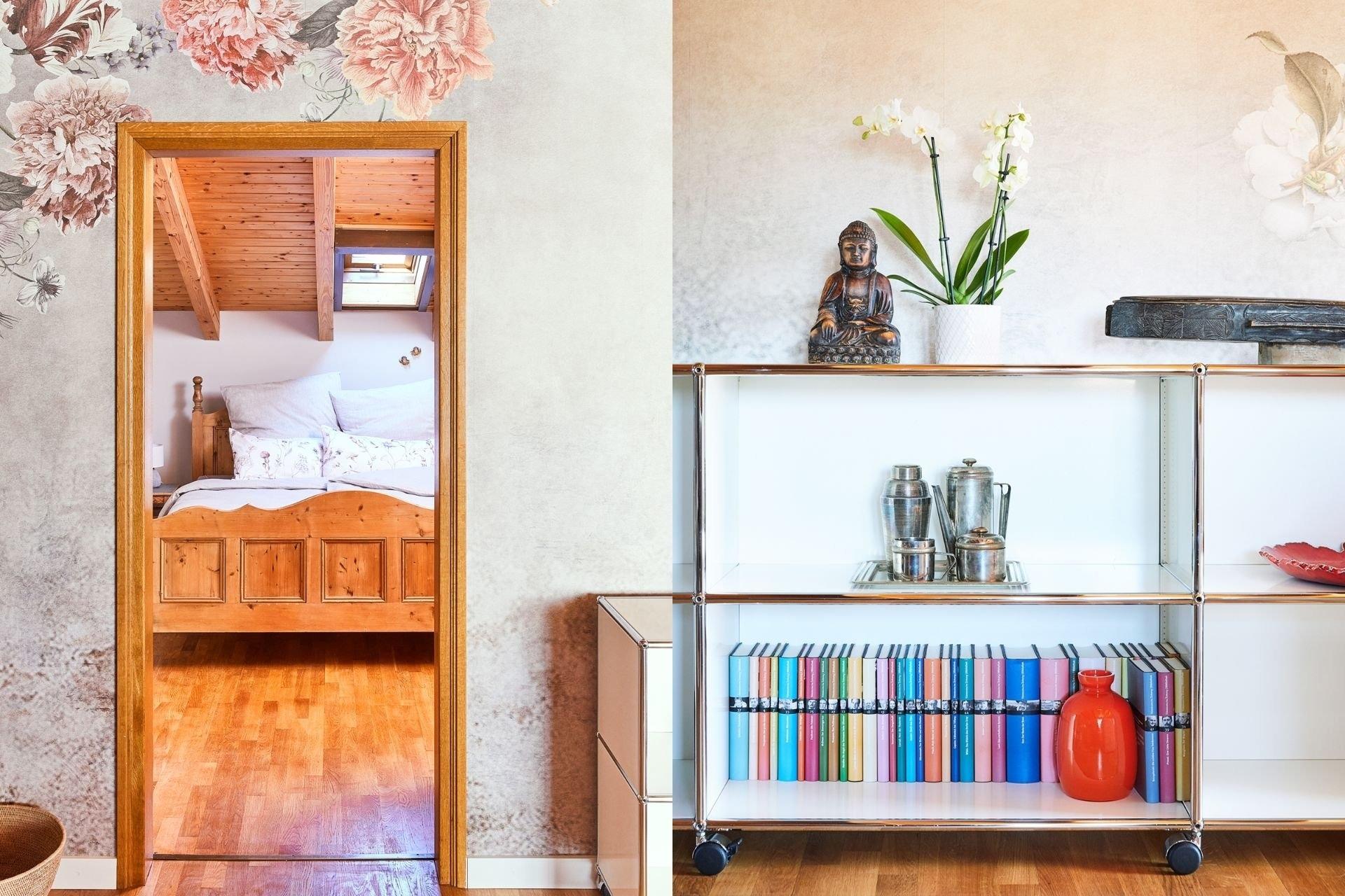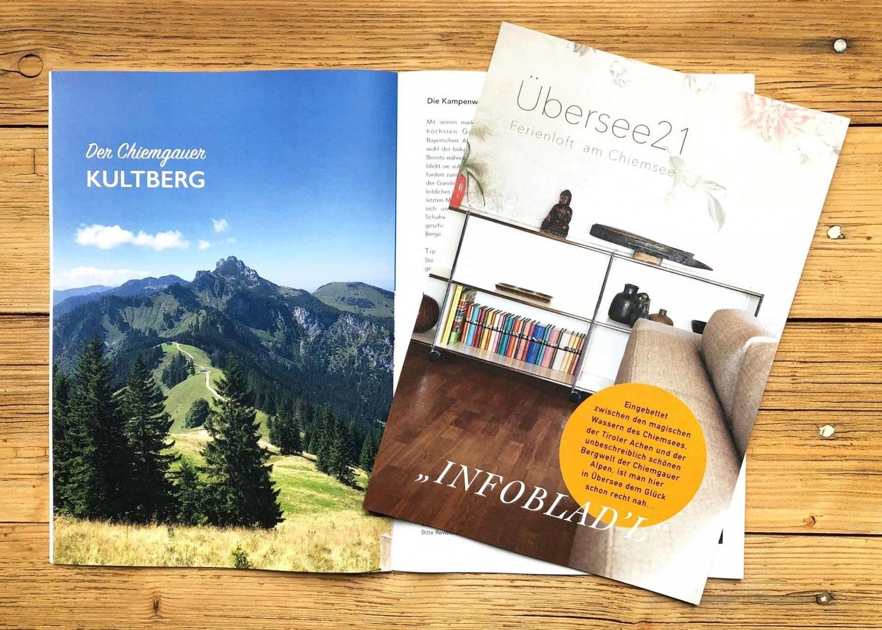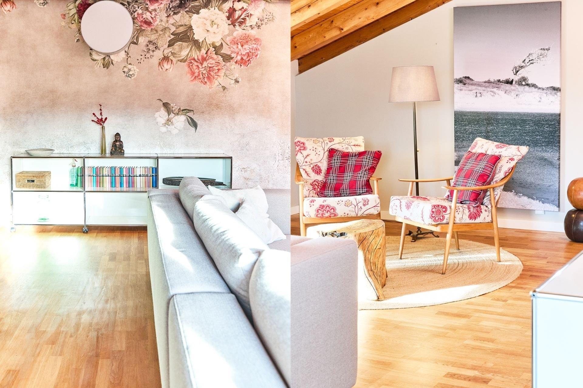 Die unverwechselbare Einrichtung im modernen Cottage-Stil und die komfortable Ausstattung sowie die gute Erreichbarkeit von See, Wander- und Radrouten und der nahegelegene Ausflugsziele macht das 4*Ferienloft Übersee21 zum idealen Ort für Paare, die Erholung suchen, sich eine Auszeit gönnen, einen Aktivurlaub planen oder sich ganz der Kultur hingeben wollen.Die gepflegte ca. 75 m² große DG-Ferienwohnung befindet sich im 1. Stock eines Zweifamilienhauses in einem Wohngebiet, ausserhalb der Ortsmitte des Luftkurortes Übersee und wenige Minuten vom Chiemsee entfernt. Die liebevolle Einrichtung im modernen Cottage-Stil besticht durch die kreative Zweckentfremdung origineller und hochwertiger Gegenstände für den Alltagsgebrauch. Jede Ecke erzählt eine Geschichte.Der großzügige Wohnraum mit bequemen Sofa-Chaiselounge-Kombination und Leseecke wird durch die außergewöhnliche Pfingstrosen-Tapete stilvoll abrundet. Das Regal mit der kleinen Bibliothek aus Büchern und Magazinen lädt zum Stöbern ein.In dem offenen Wohn-Essbereich befindet sich auch die gut ausgestattete Küche mit hochwertigen Küchenutensilien und Kaffeemaschine. Der große massive Holztisch mittendrin lädt zum gemeinsamen Essen, für Unterhaltungen oder auch zum Arbeiten ein.Genießen Sie die Morgensonne auf dem wettergeschützten, großzügigen Süd-Balkon mit Blick auf die Chiemgauer Alpen und beginnen Sie den Tag mit einem entspannten Frühstück.Das separate Schlafzimmer gewährt liegend einen Blick in den oberbayerischen Sternenhimmel mit Option auf Sternschnuppen oder Verdunkelung für erholsamen Schlaf! Massivholzböden in allen Wohnräumen, außer im Badezimmer und Flur, runden die hochwertige Innenausstattung ab.Umgebung: Die gut ausgebaute Infrastruktur des Luftkurorts Übersee verfügt über einen Bahnhof /Autobahnanschluß mit direkter Verbindung nach Salzburg und München, div. Ärzte, Apotheke, Supermärkte, Bioladen, Bäckereien, Restaurants ect... Zum See und Hafen, dem Strandbad inkl. Strandbar mit sandigem Badestrand, einem Hochseilparcour, Kanu - und SUP Verleih, Restaurants, Kiosks ect. gelangen Sie fußläufig, per Fahrrad oder auch mit dem PKW.Bitte beachten Sie: Die Ferienwohnung ist für Babys und Kinder ungeeignet | Es handelt sich um eine Nichtraucherwohnung, das Rauchen ist im gesamten Haus und Aussenbereich nicht gestattet | Tiere können leider nicht mitgebracht werden | Keine Drogen/Partys/DatingWir freuen uns darauf, Sie schon bald als unsere Gäste begrüßen zu dürfen!