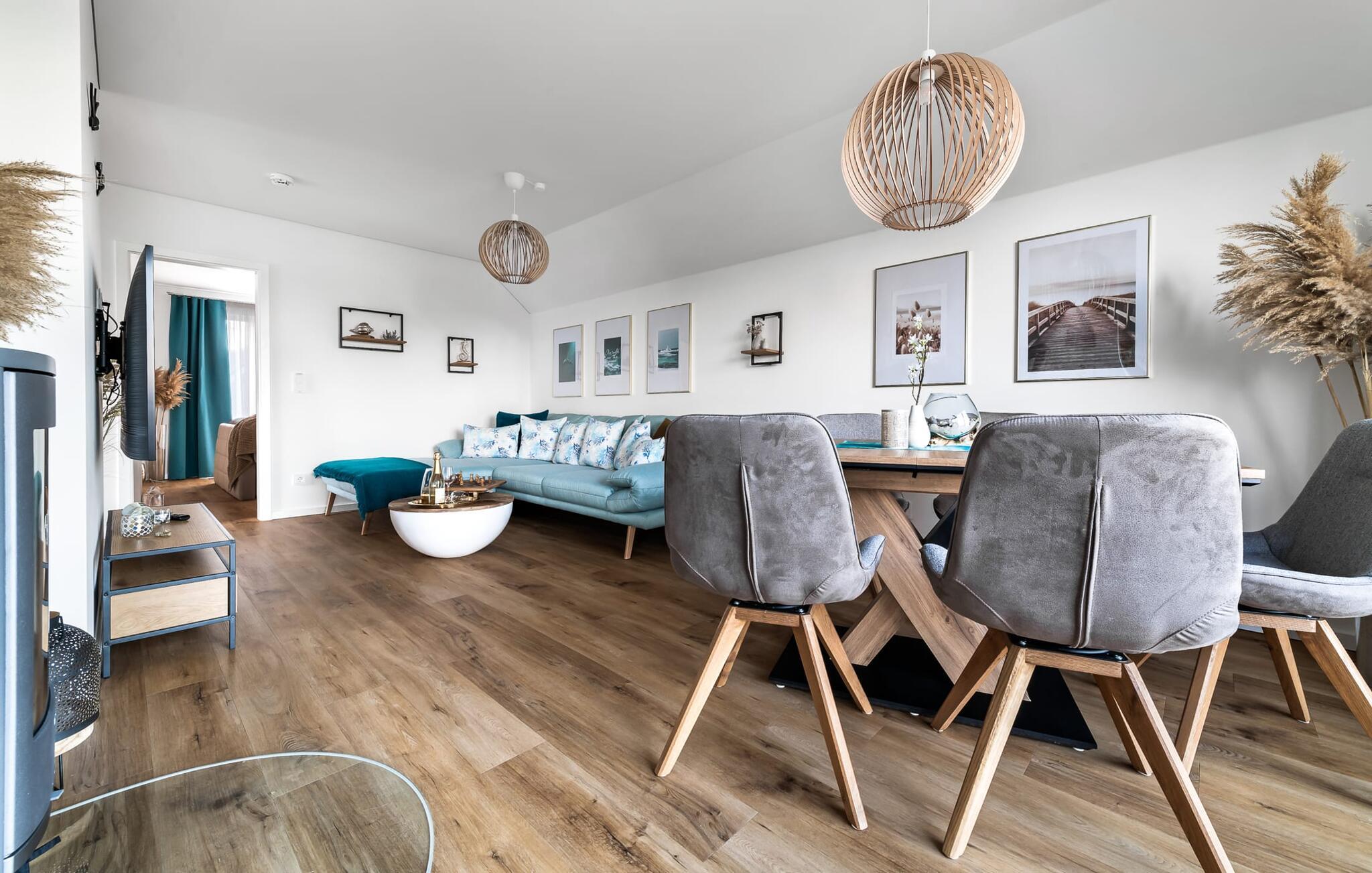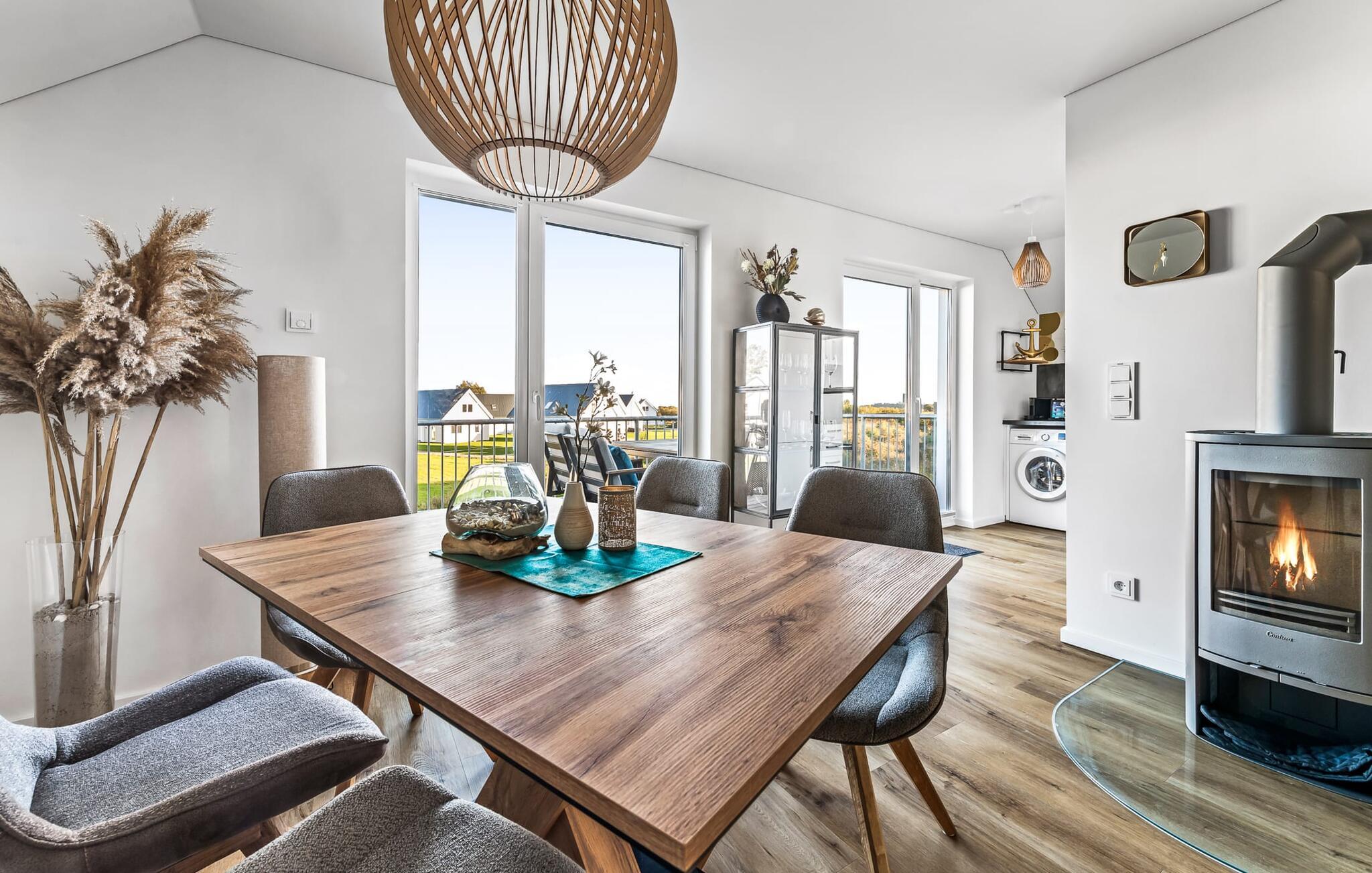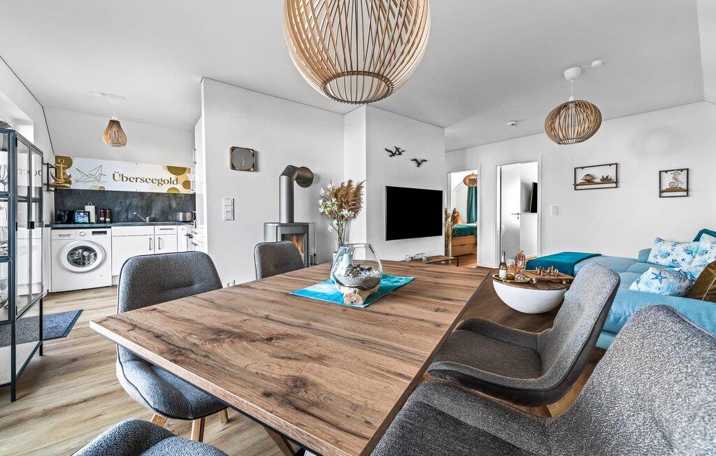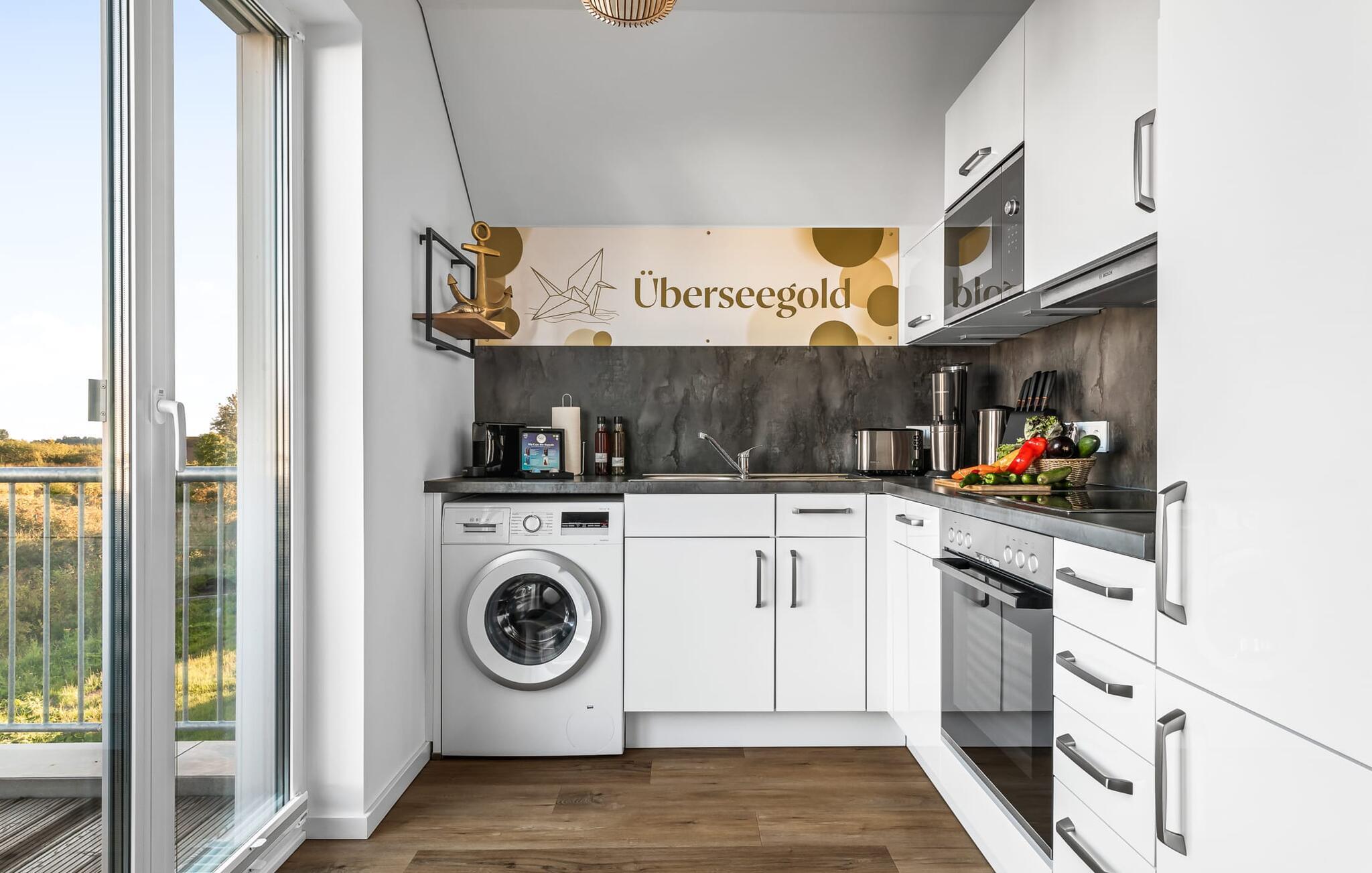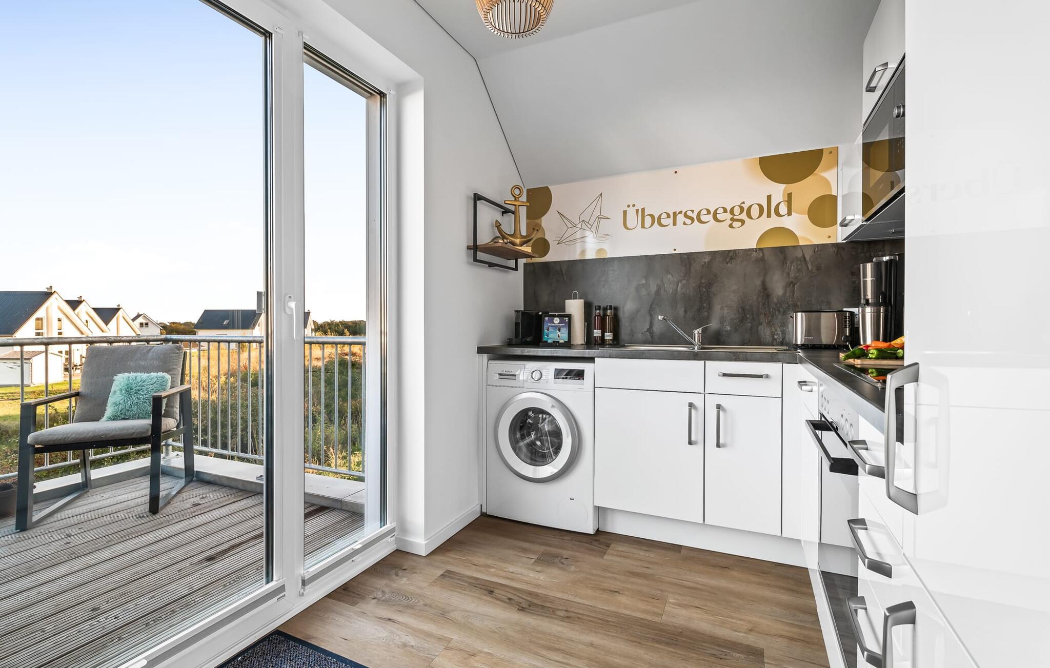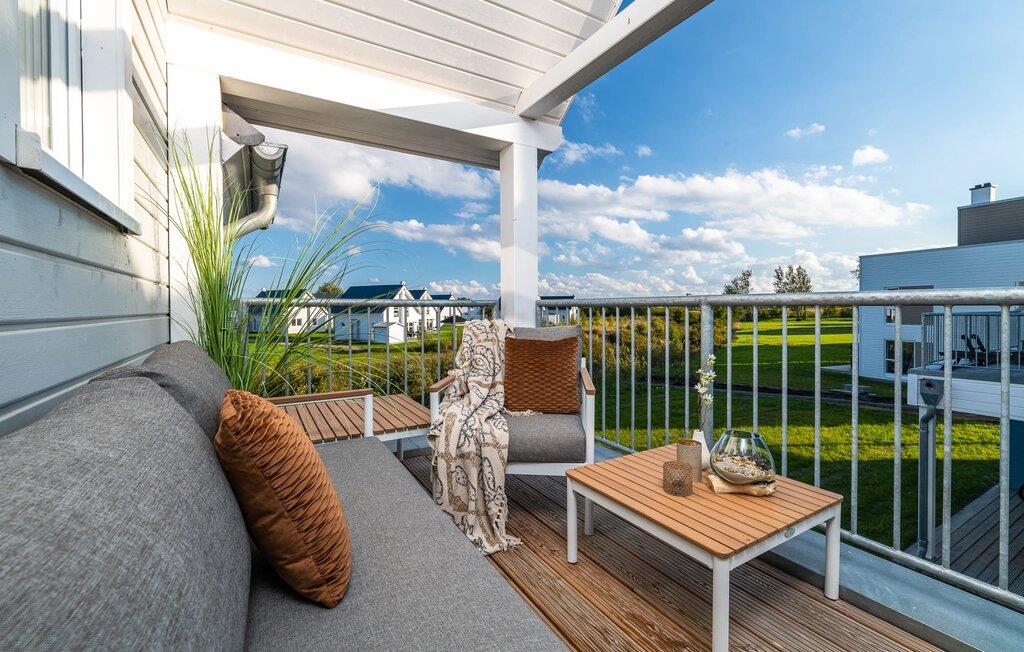 Velkommen til Überseegold! Møbler af høj kvalitet i maritim stil venter jer her. Den rummelige ferielejlighed på øverste etage scorer med en rummelig følelse, en terrasse til solbadning og plads til op til 5 personer. Her kan I nyde jeres ferie og glemme hverdagen. En anden lille terrasse ved indgangen giver en ekstra feriefølelse. Sandstranden Weidefelder med kiosk, restaurant og strandstole ligger i gåafstand og er et attraktivt rejsemål på alle tider af året. Minigolfbanen med maritimt tema ligger også i umiddelbar nærhed og glæder både store og små. Den livlige havnepromenade med indkøbsmuligheder og lystbådehavnen er også i nærheden. Med sine gulv-til-loft-vinduer og den store tilstødende terrasse er den åbne stue/spisestue hjertet af Überseegold. Den stilfulde indretning og den hyggelige opholdsstue skaber en afslappet atmosfære og inviterer jer til at slappe af. Ren afslapning! Skulle vejret nogensinde vise sin nordiske side, sørger pejsen og den infrarøde sauna (varmekabinen) for hyggelig varme og komfort. Når solen skinner, venter terrassen allerede på jer. Nyd dagen her i den friske Østersøluft eller ring ind til en grillaften sammen. Det åbne køkken er ideelt udstyret og vil få amatørkokkenes hjerter til at slå hurtigere. To soveværelser er tilgængelige til afslapning om natten. Det ene soveværelse er udstyret med en stor dobbelt boxmadras, mens det andet soveværelse har to store enkeltsenge (140x200). I opholdsstuen kan sofaen omdannes til endnu et soverum med få enkle trin. Efter en travl feriedag giver badeværelset med brusebad på gulvniveau og en infrarød sauna beroligende øjeblikke. En dag på Østersøen kunne ikke ende bedre. For at give en hel feriekomfort finder I jeres egen parkeringsplads og et aflåseligt cykelskur foran ferielejligheden. Vores favoritsted: At tilbringe en hyggelig grillaften på terrassen efter en dag på stranden... Bemærk venligst: OstseeResort Olpenitz er meget populært, og der bygges fortsat i parken. Ikke desto mindre kan I se frem til en 5-stjernet standard og et førsteklasses ophold. Byggeaktiviteterne kommer ikke til at forstyrre jer på ferien, og derfor gives der ikke yderligere afslag i prisen.