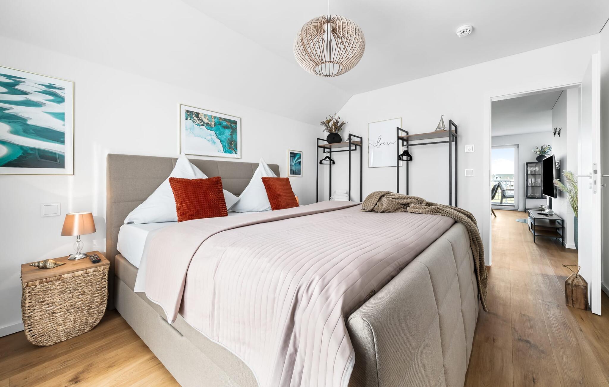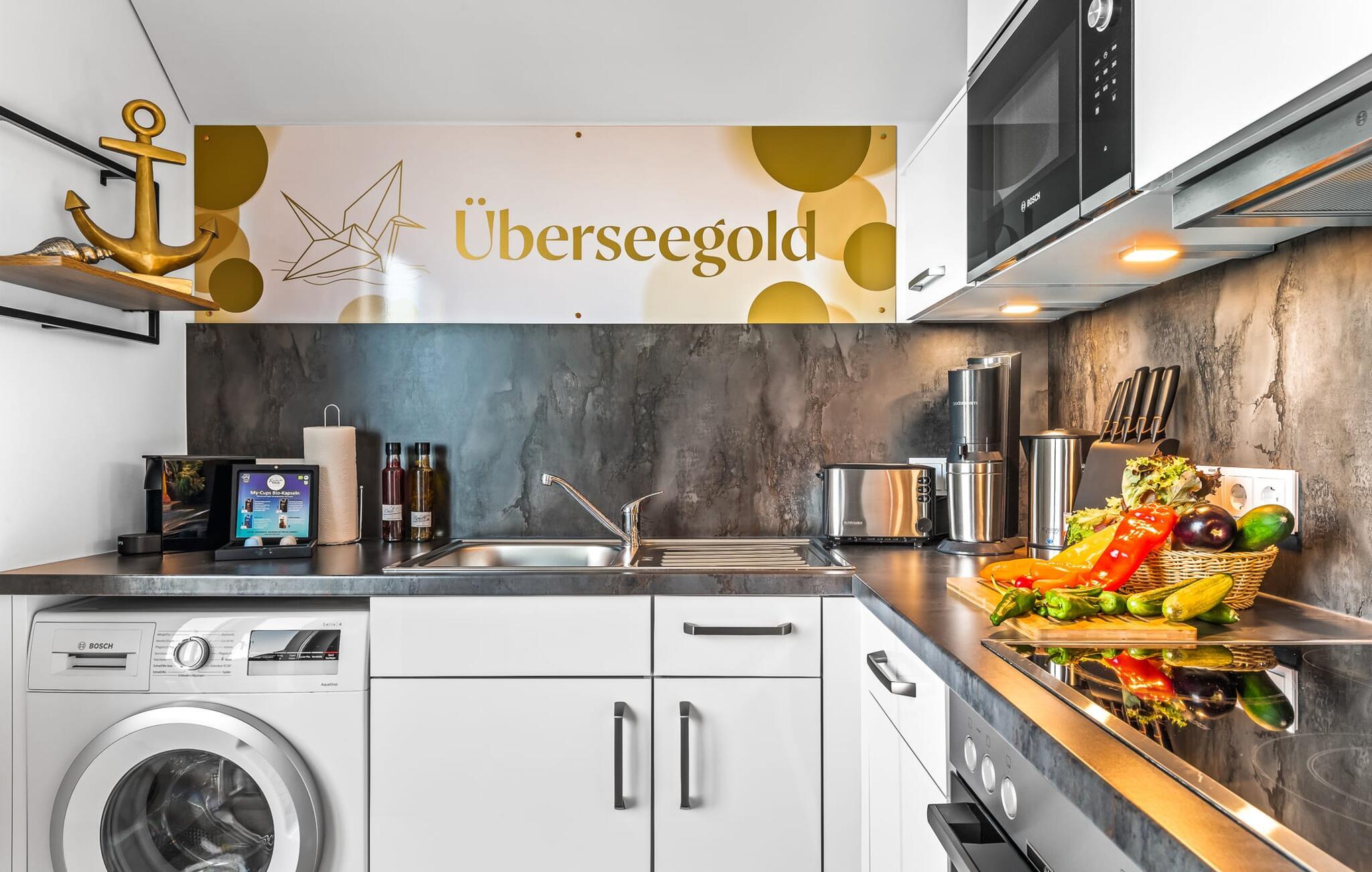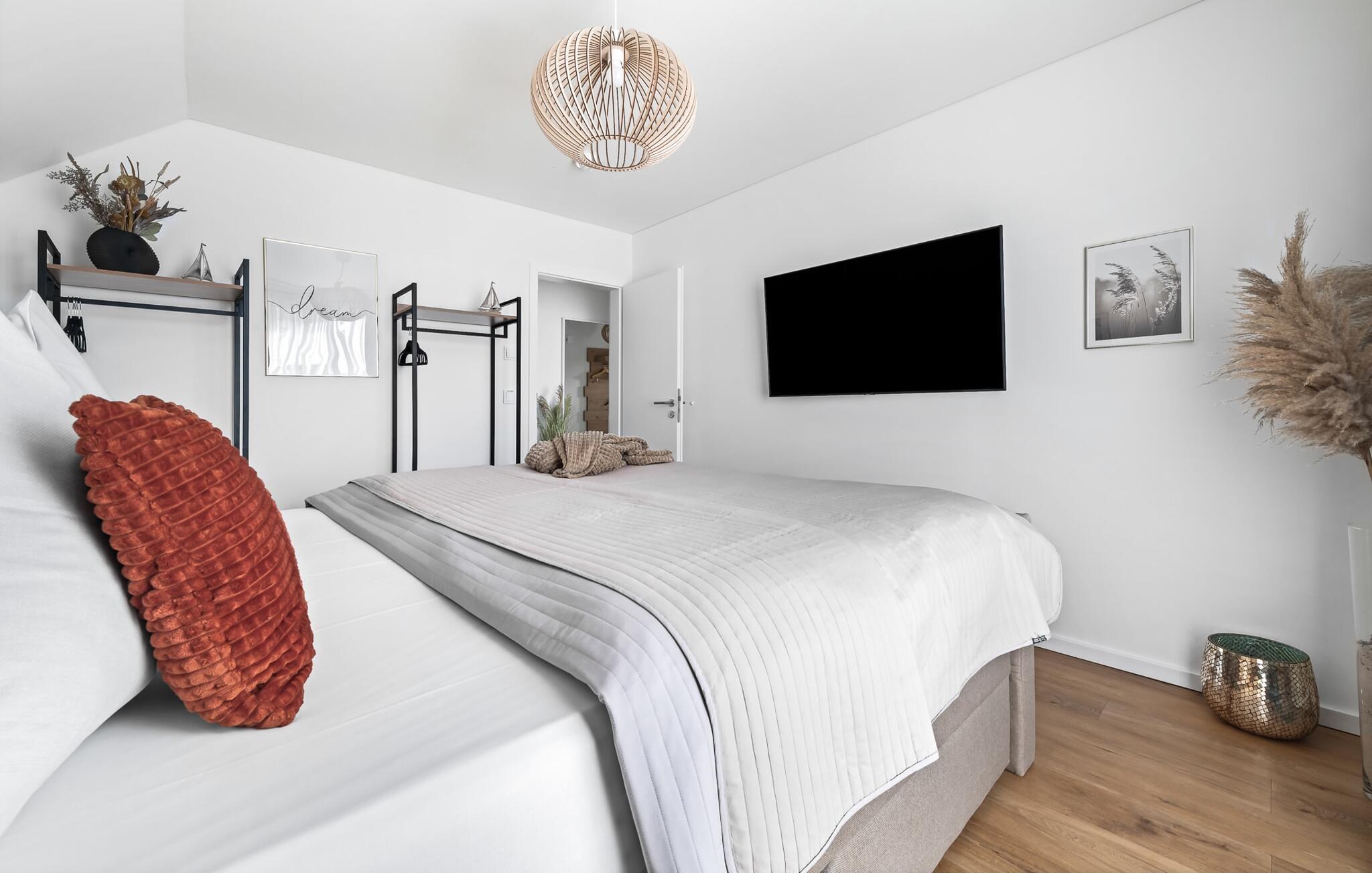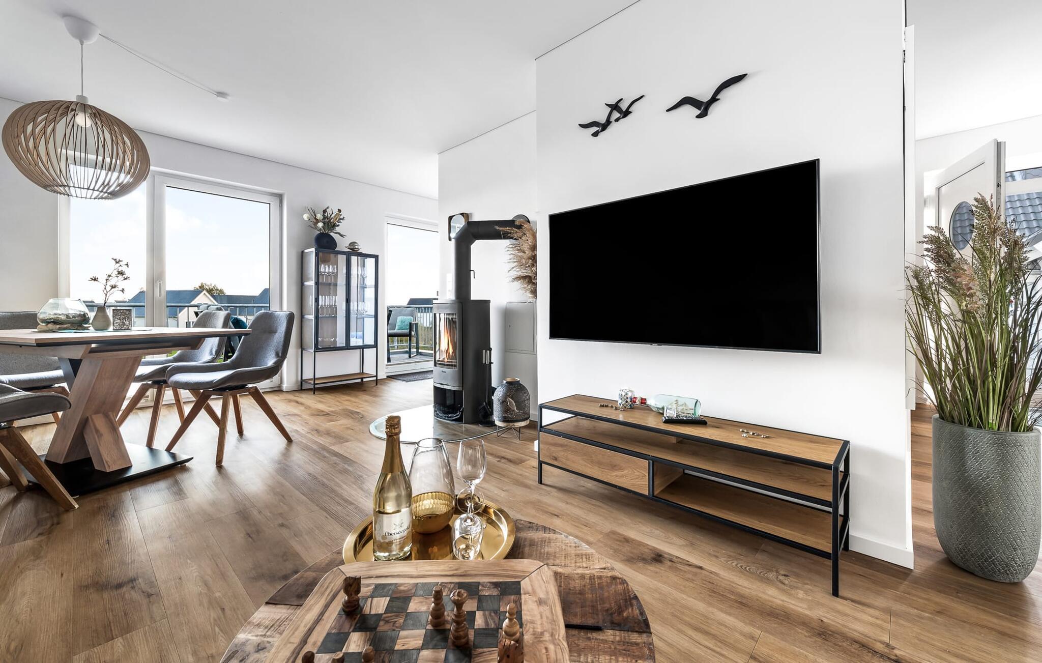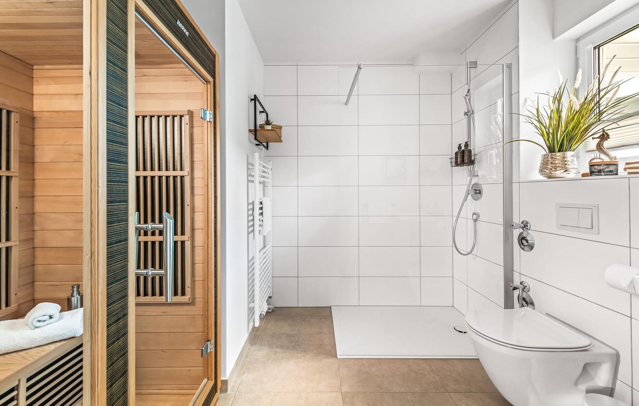 Velkommen til Überseegold! Møbler af høj kvalitet i maritim stil venter jer her. Den rummelige ferielejlighed på øverste etage scorer med en rummelig følelse, en terrasse til solbadning og plads til op til 5 personer. Her kan I nyde jeres ferie og glemme hverdagen. En anden lille terrasse ved indgangen giver en ekstra feriefølelse. Sandstranden Weidefelder med kiosk, restaurant og strandstole ligger i gåafstand og er et attraktivt rejsemål på alle tider af året. Minigolfbanen med maritimt tema ligger også i umiddelbar nærhed og glæder både store og små. Den livlige havnepromenade med indkøbsmuligheder og lystbådehavnen er også i nærheden. Med sine gulv-til-loft-vinduer og den store tilstødende terrasse er den åbne stue/spisestue hjertet af Überseegold. Den stilfulde indretning og den hyggelige opholdsstue skaber en afslappet atmosfære og inviterer jer til at slappe af. Ren afslapning! Skulle vejret nogensinde vise sin nordiske side, sørger pejsen og den infrarøde sauna (varmekabinen) for hyggelig varme og komfort. Når solen skinner, venter terrassen allerede på jer. Nyd dagen her i den friske Østersøluft eller ring ind til en grillaften sammen. Det åbne køkken er ideelt udstyret og vil få amatørkokkenes hjerter til at slå hurtigere. To soveværelser er tilgængelige til afslapning om natten. Det ene soveværelse er udstyret med en stor dobbelt boxmadras, mens det andet soveværelse har to store enkeltsenge (140x200). I opholdsstuen kan sofaen omdannes til endnu et soverum med få enkle trin. Efter en travl feriedag giver badeværelset med brusebad på gulvniveau og en infrarød sauna beroligende øjeblikke. En dag på Østersøen kunne ikke ende bedre. For at give en hel feriekomfort finder I jeres egen parkeringsplads og et aflåseligt cykelskur foran ferielejligheden. Vores favoritsted: At tilbringe en hyggelig grillaften på terrassen efter en dag på stranden... Bemærk venligst: OstseeResort Olpenitz er meget populært, og der bygges fortsat i parken. Ikke desto mindre kan I se frem til en 5-stjernet standard og et førsteklasses ophold. Byggeaktiviteterne kommer ikke til at forstyrre jer på ferien, og derfor gives der ikke yderligere afslag i prisen.
