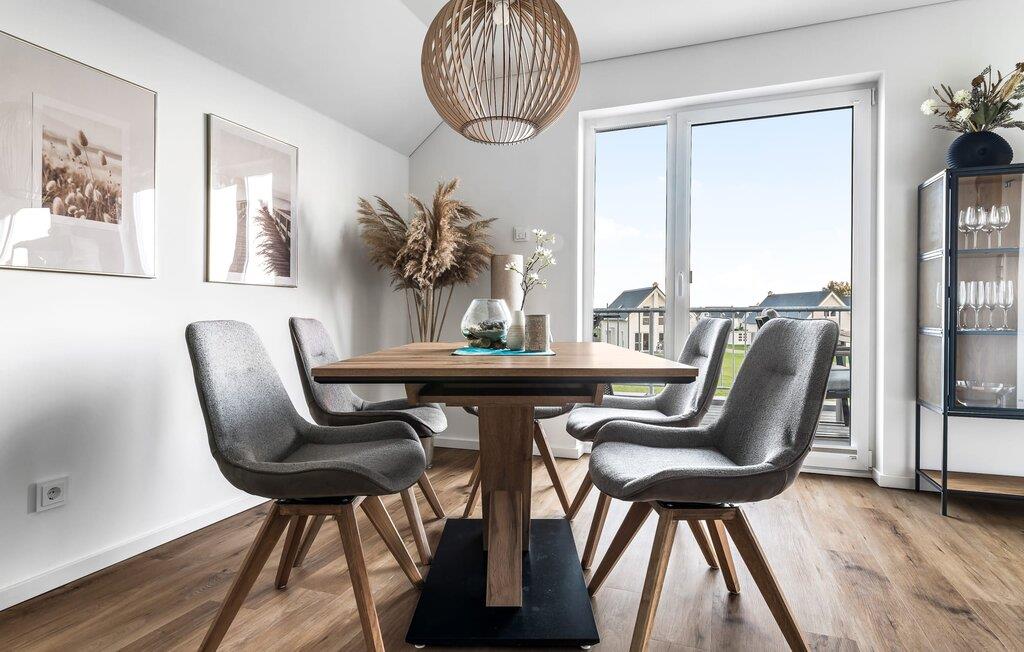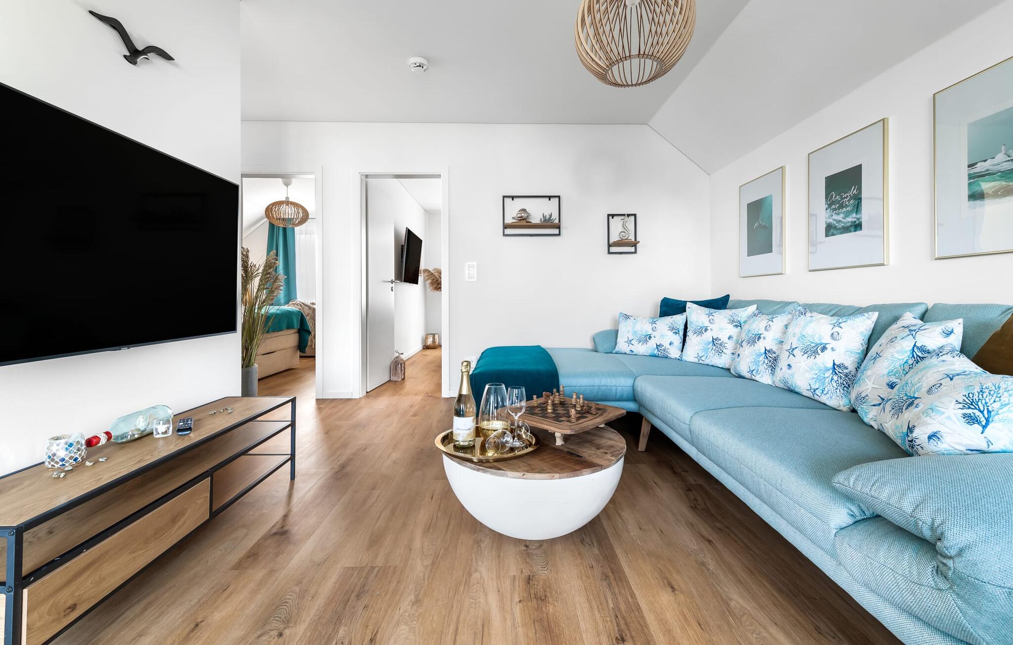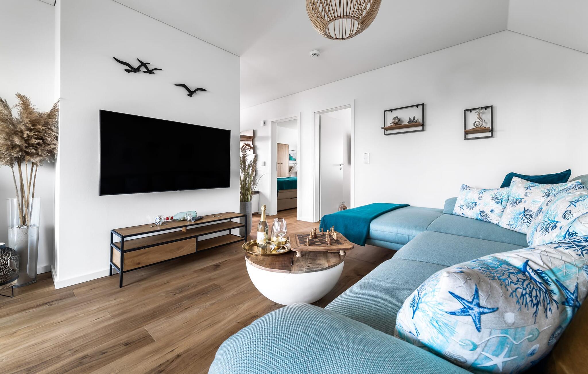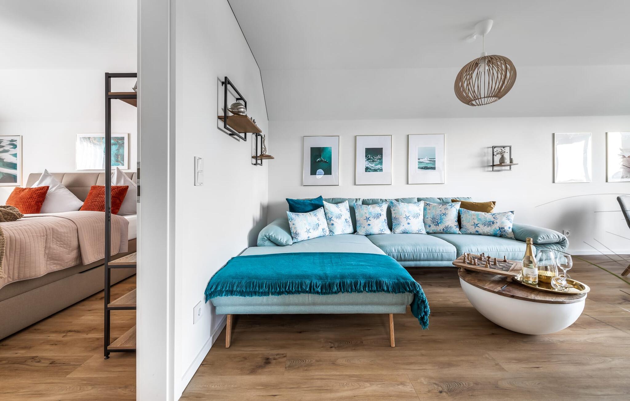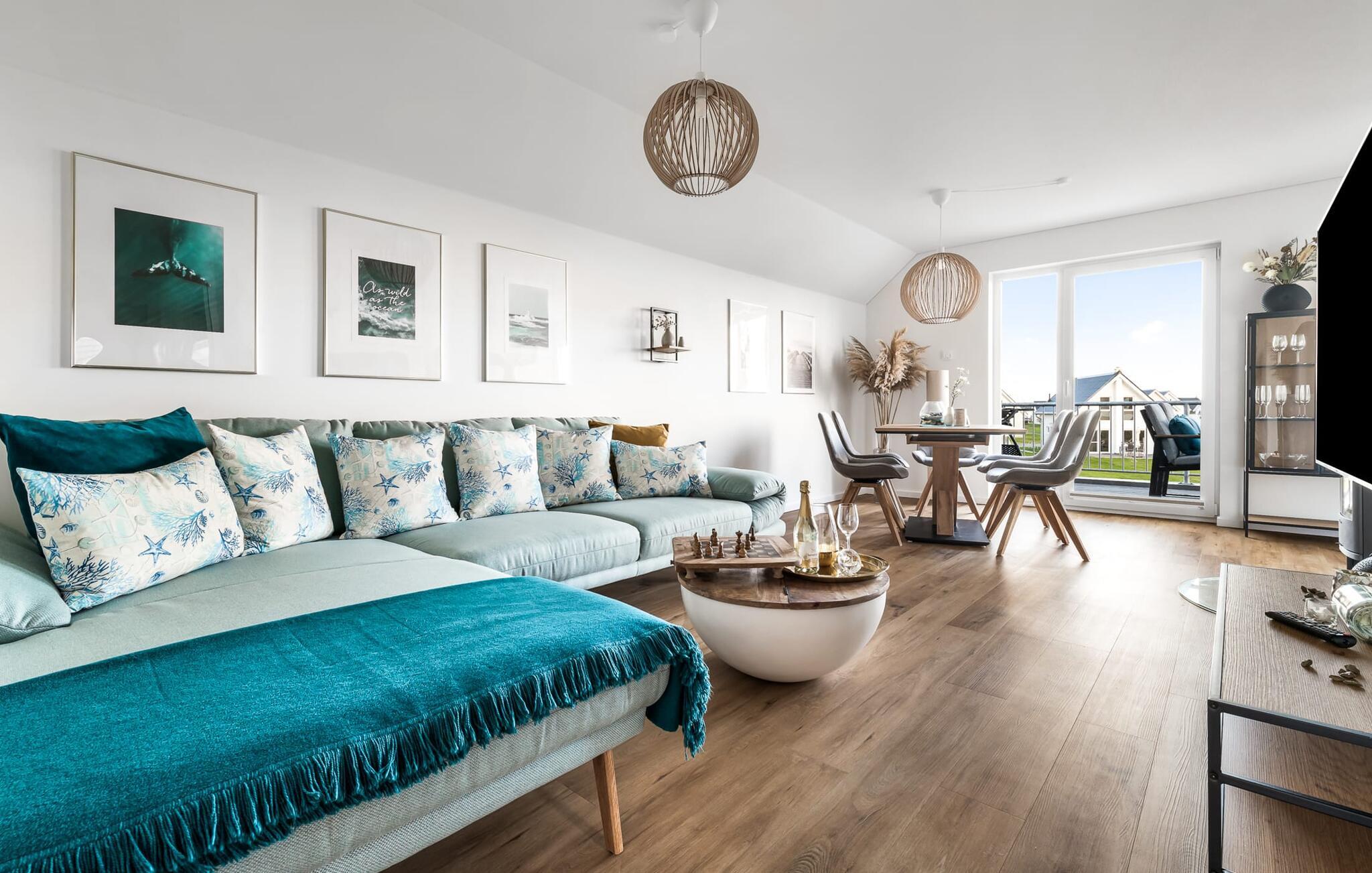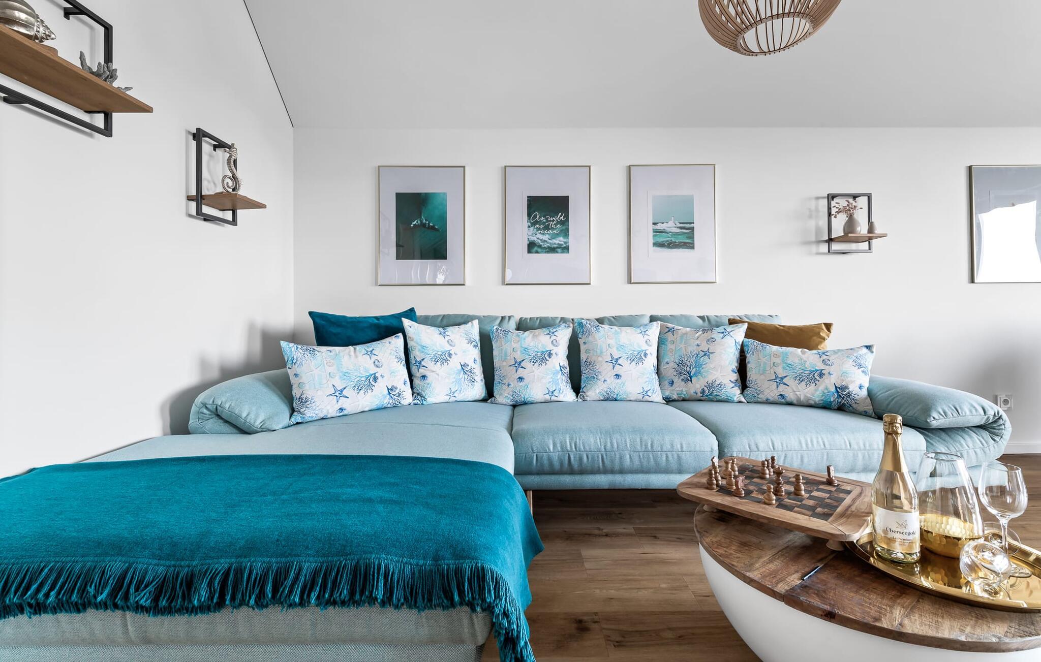 Velkommen til Überseegold! Møbler af høj kvalitet i maritim stil venter jer her. Den rummelige ferielejlighed på øverste etage scorer med en rummelig følelse, en terrasse til solbadning og plads til op til 5 personer. Her kan I nyde jeres ferie og glemme hverdagen. En anden lille terrasse ved indgangen giver en ekstra feriefølelse. Sandstranden Weidefelder med kiosk, restaurant og strandstole ligger i gåafstand og er et attraktivt rejsemål på alle tider af året. Minigolfbanen med maritimt tema ligger også i umiddelbar nærhed og glæder både store og små. Den livlige havnepromenade med indkøbsmuligheder og lystbådehavnen er også i nærheden. Med sine gulv-til-loft-vinduer og den store tilstødende terrasse er den åbne stue/spisestue hjertet af Überseegold. Den stilfulde indretning og den hyggelige opholdsstue skaber en afslappet atmosfære og inviterer jer til at slappe af. Ren afslapning! Skulle vejret nogensinde vise sin nordiske side, sørger pejsen og den infrarøde sauna (varmekabinen) for hyggelig varme og komfort. Når solen skinner, venter terrassen allerede på jer. Nyd dagen her i den friske Østersøluft eller ring ind til en grillaften sammen. Det åbne køkken er ideelt udstyret og vil få amatørkokkenes hjerter til at slå hurtigere. To soveværelser er tilgængelige til afslapning om natten. Det ene soveværelse er udstyret med en stor dobbelt boxmadras, mens det andet soveværelse har to store enkeltsenge (140x200). I opholdsstuen kan sofaen omdannes til endnu et soverum med få enkle trin. Efter en travl feriedag giver badeværelset med brusebad på gulvniveau og en infrarød sauna beroligende øjeblikke. En dag på Østersøen kunne ikke ende bedre. For at give en hel feriekomfort finder I jeres egen parkeringsplads og et aflåseligt cykelskur foran ferielejligheden. Vores favoritsted: At tilbringe en hyggelig grillaften på terrassen efter en dag på stranden... Bemærk venligst: OstseeResort Olpenitz er meget populært, og der bygges fortsat i parken. Ikke desto mindre kan I se frem til en 5-stjernet standard og et førsteklasses ophold. Byggeaktiviteterne kommer ikke til at forstyrre jer på ferien, og derfor gives der ikke yderligere afslag i prisen.