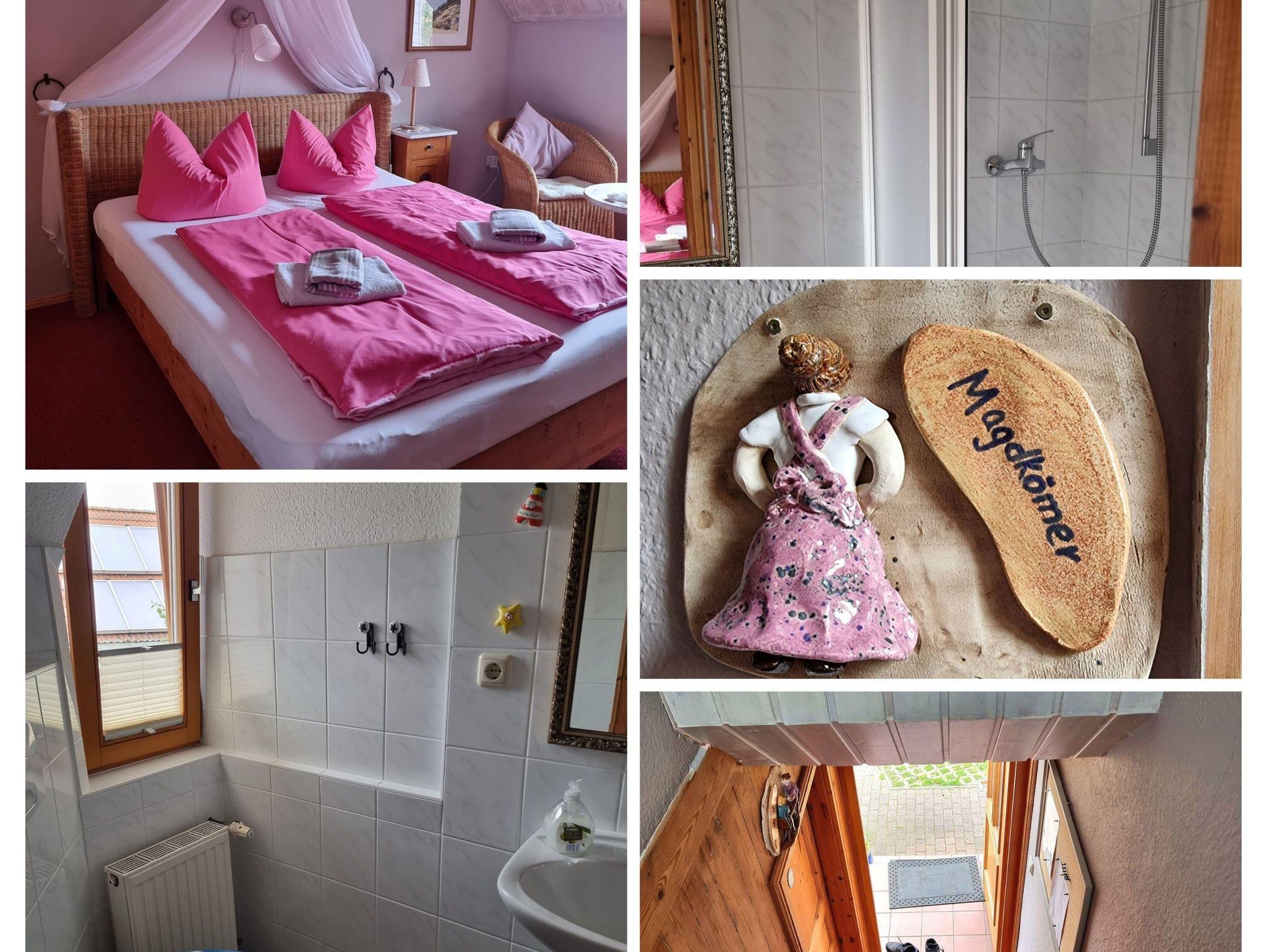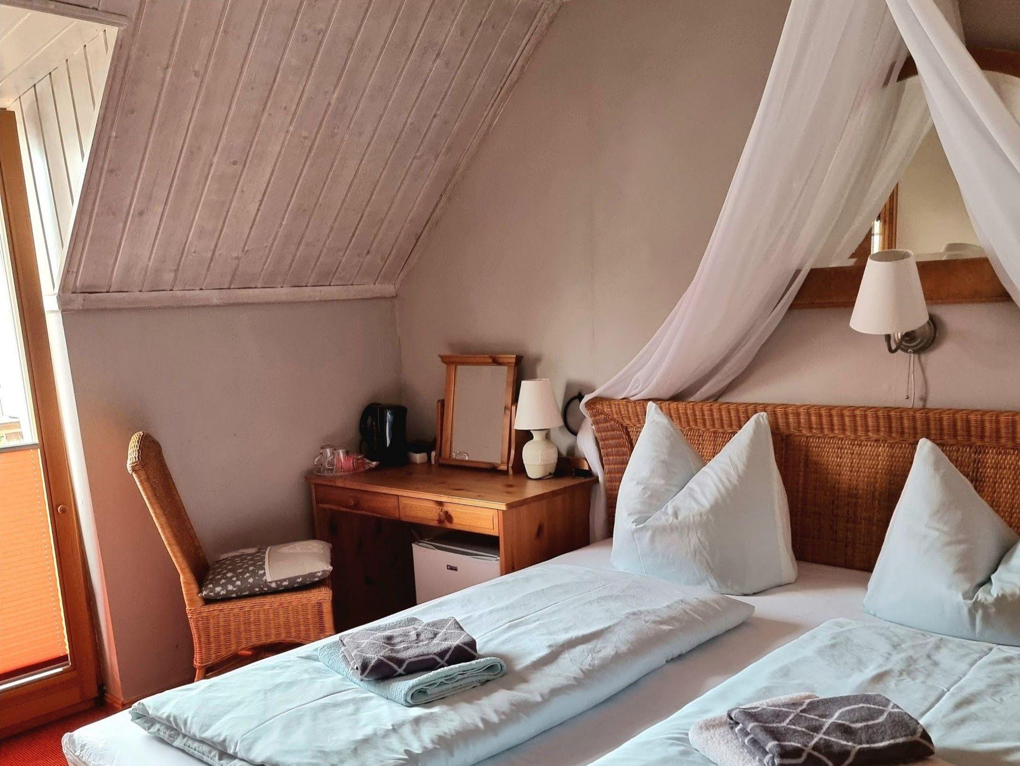 Unsere liebevoll und gemütlich eingerichtete Ferienwohnung befindet sich auf dem Grundstück des Dorfgasthofes Deutsches Haus in einem Nebengebäude im Erdgeschoss. Der Wohnbereich verfügt über eine kleine Sitzecke, Schlafcouch und eine Pantryküche (2-Platten-Kochfeld, Kühlschrank, Waschbecken). Im angrenzenden Schlafzimmer mit Zugang zum Bad befindet sich ein Doppelbett sowie ein Kleiderschrank. Zu der Wohnung gehört ebenso eine Terrasse mit Grillmöglichkeit und einer schattenspendenden Markise. Im Zimmerpreis enthalten sind bereits der Parkplatz sowie die Erstausstattung mit Bettwäsche und Handtüchern.