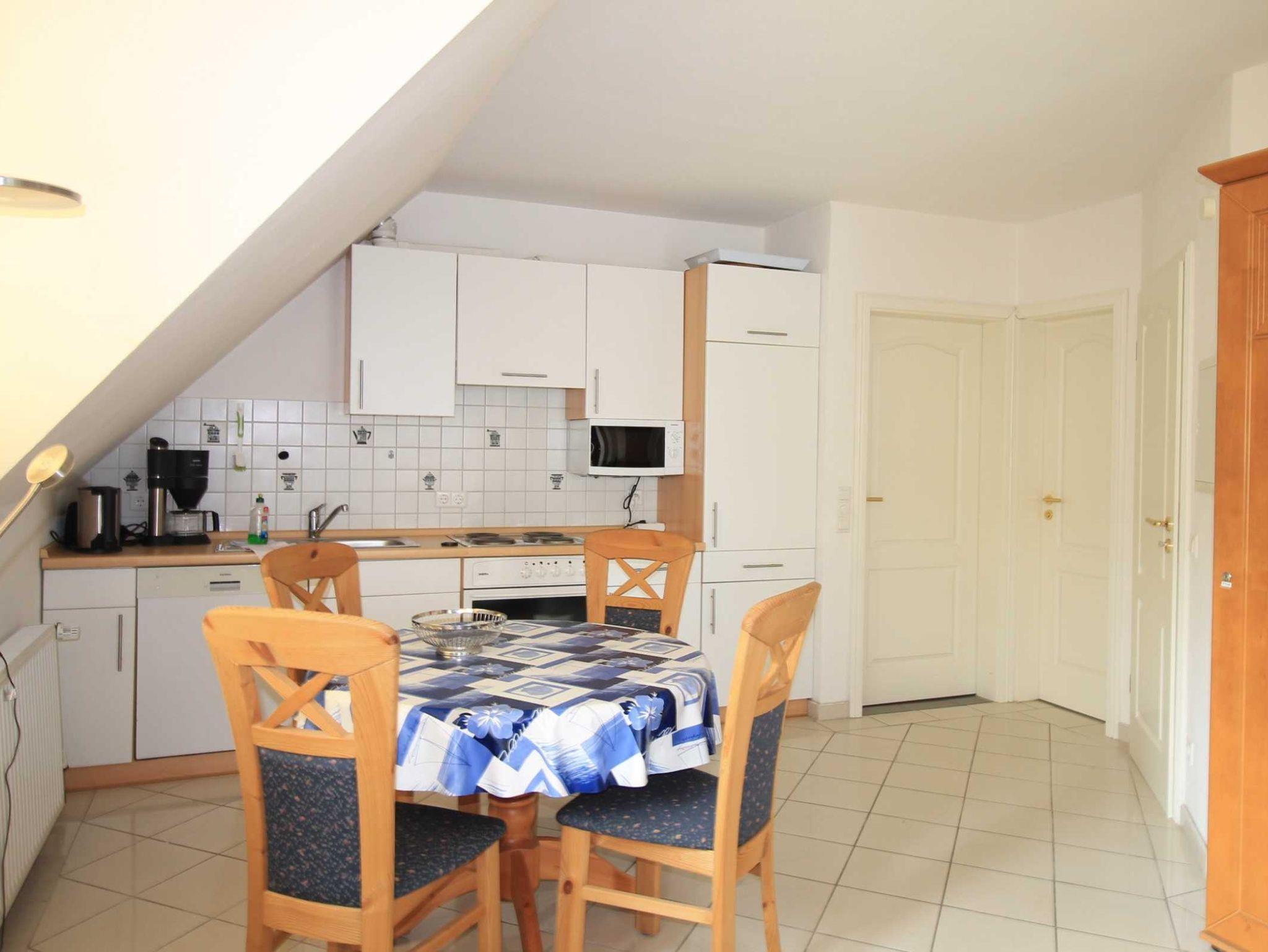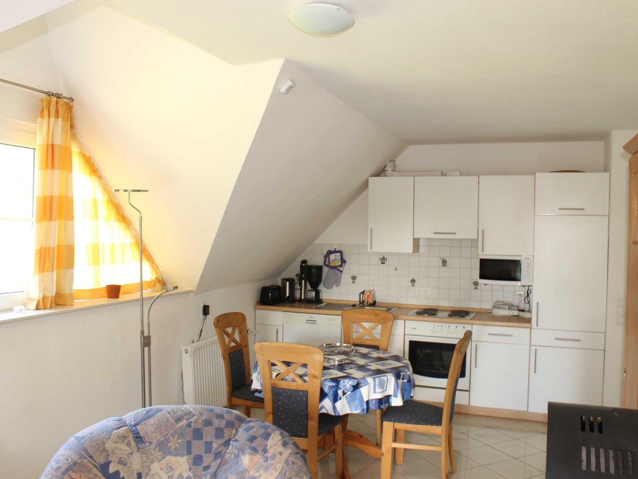 Die gemütliche 55 qm große 3-Raum-Ferienwohnung im 1. Obergeschoß verfügt über ein Wohnzimmer mit Kamin, LED-TV, Radio, Telefon und W-LAN. Die offene, moderne Küche mit Essplatz ist mit diversen Elektrogeräten, wie z.B. 4-Platten-Kochfeld, Backofen, Geschirrspüler, Mikrowelle, Kaffeemaschine, Wasserkocher, Toaster und Eierkocher ausgestattet. Es stehen Ihnen 2 getrennte Schlafzimmer, davon 1 mit Doppelbett und 1 mit 2 Einzelbetten und Kleiderschränke zur Verfügung. Das Badezimmer ist mit Dusche, Badewanne und WC, sowie mit einem Haartrockner ausgestattet. Die Wohnung ist komplett gefliest und verfügt über elektrische Jalousien. Die Erstausstattung Bettwäsche und Handtücher ist bereits inklusive. Ein möblierter Terrassenbereich steht Ihnen auf dem Grundstück mit Grillmöglichkeit zur Verfügung.