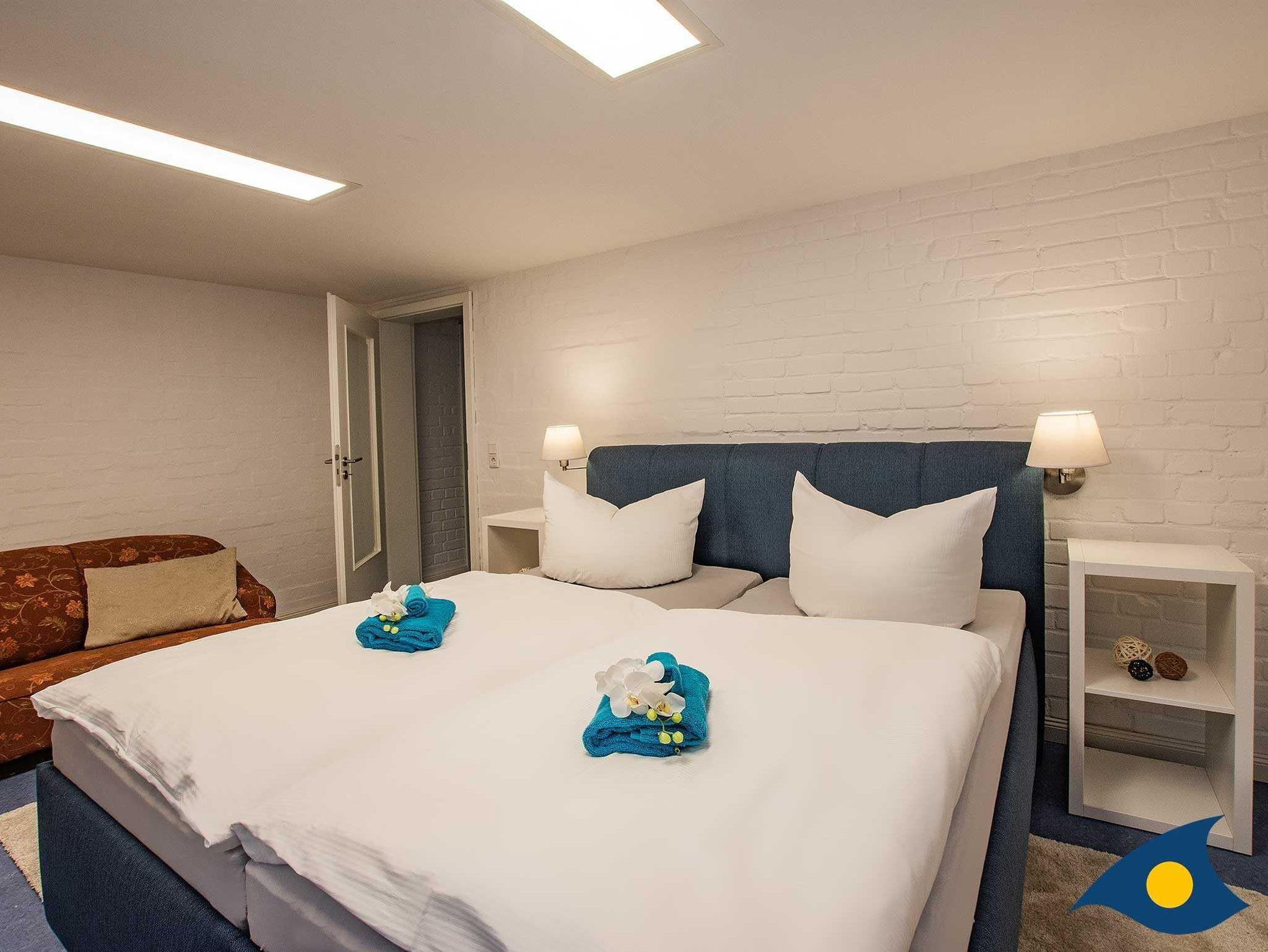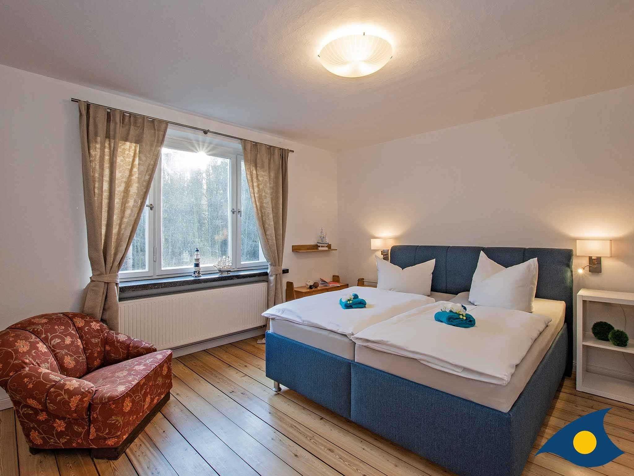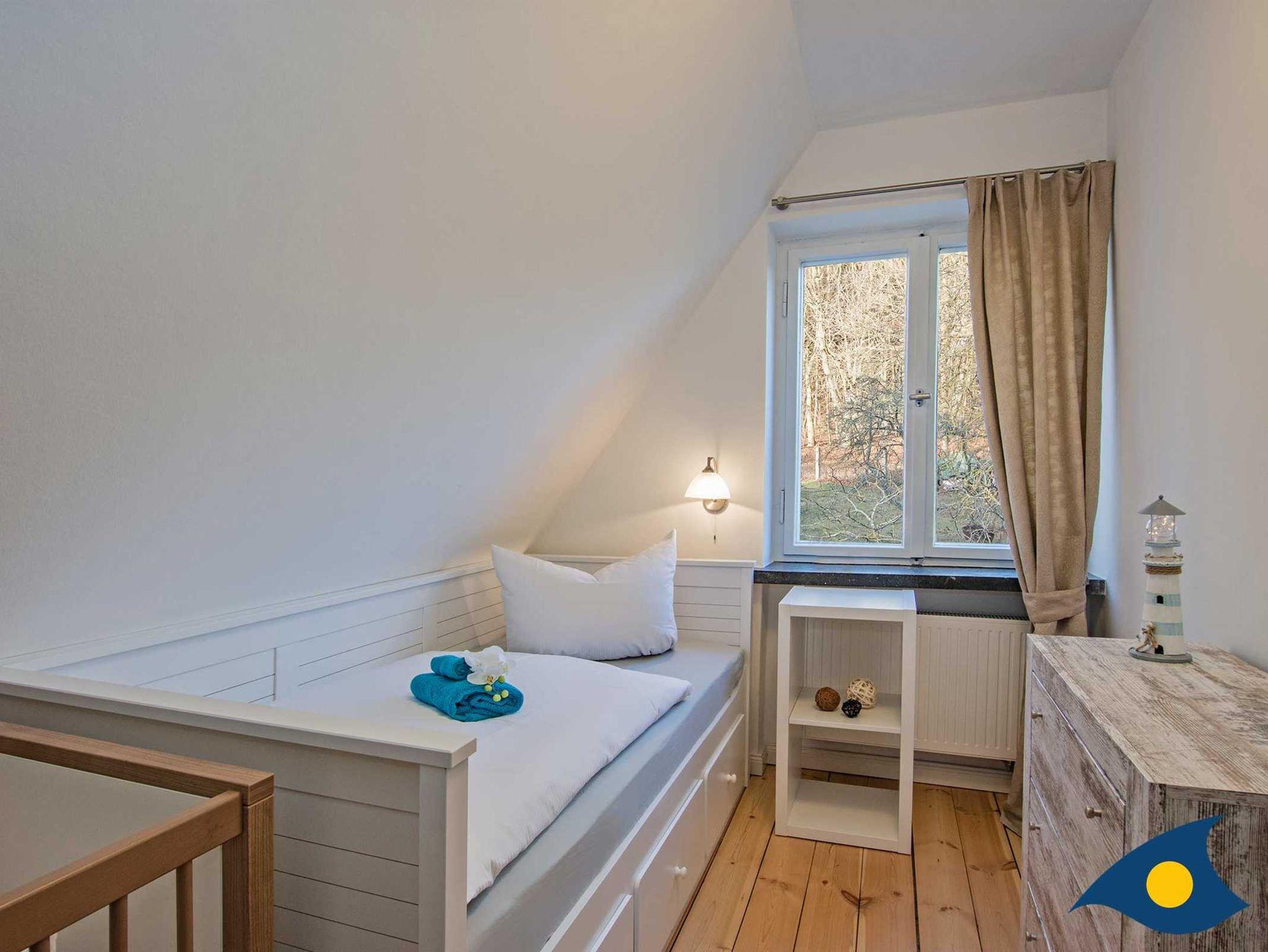 Im Obergeschoss stehen ein Doppelzimmer und zwei Einzelzimmern mit renoviertem Dielenboden zur Verfügung. In einem Einzelzimmer steht nach Wunsch auch ein Kinderbett zur Verfügung. Auch im Obergeschoss befindet sich ein hochwertiges Bad mit Dusche.