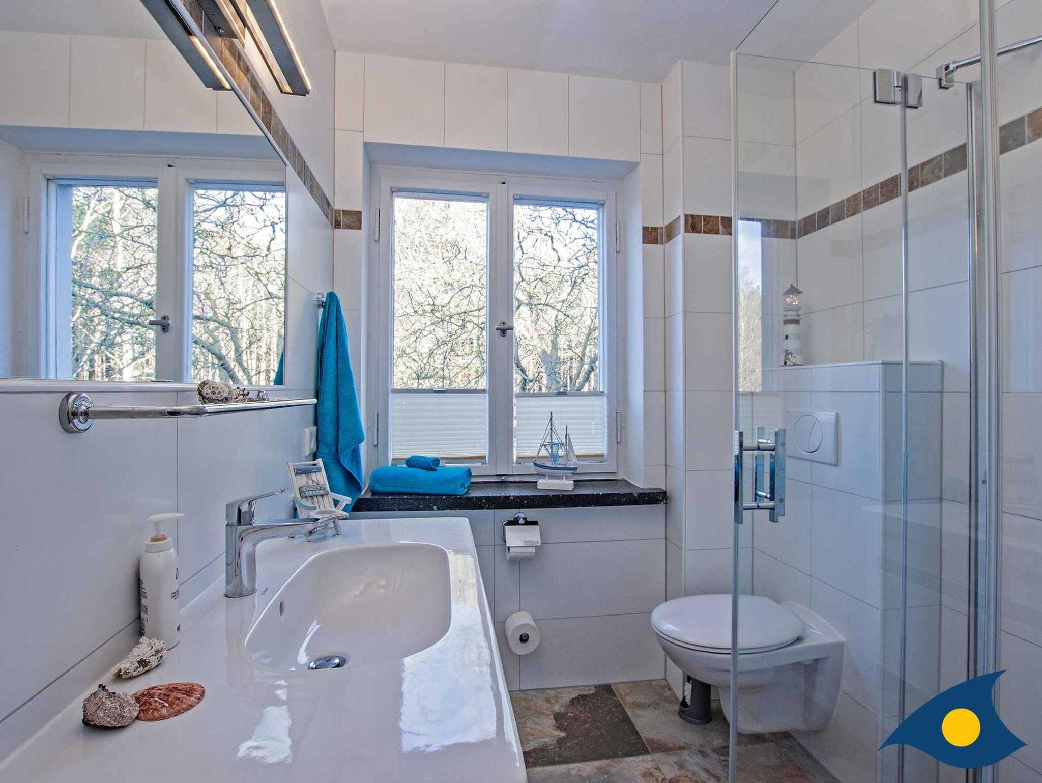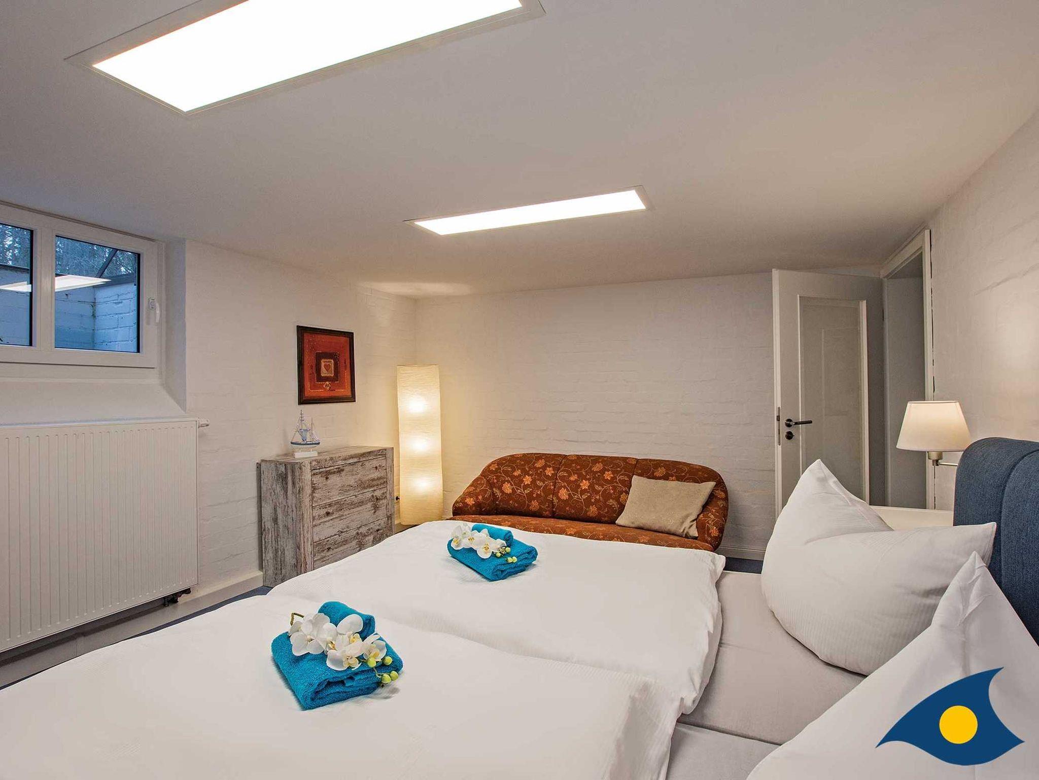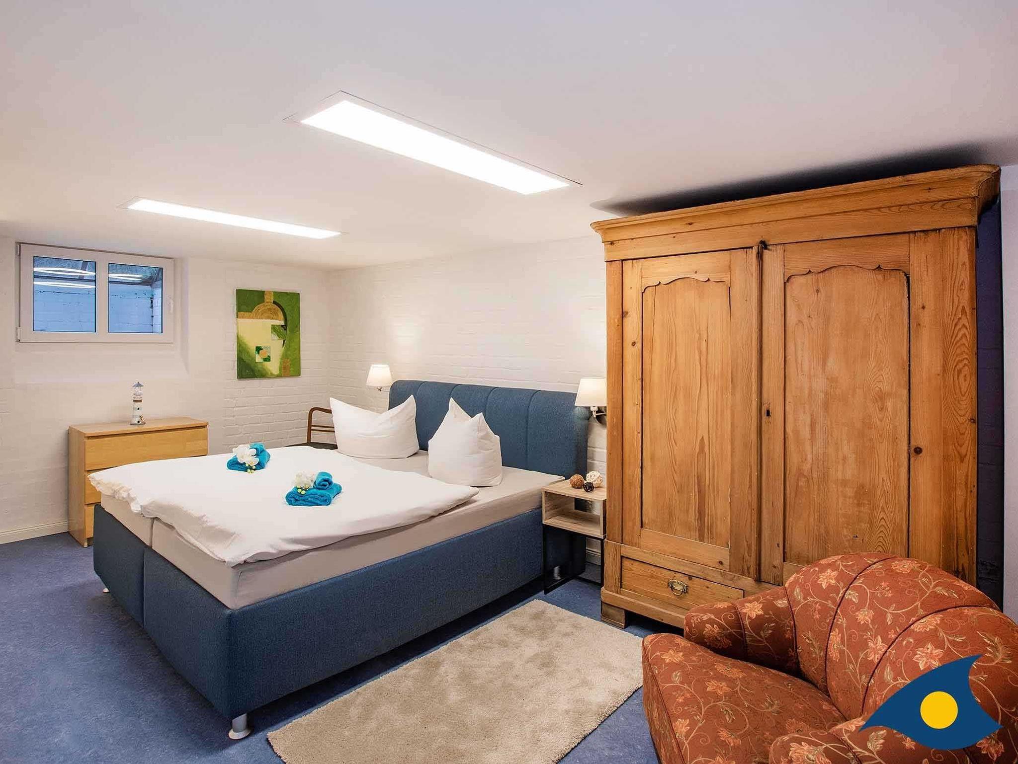 Im Obergeschoss stehen ein Doppelzimmer und zwei Einzelzimmern mit renoviertem Dielenboden zur Verfügung. In einem Einzelzimmer steht nach Wunsch auch ein Kinderbett zur Verfügung. Auch im Obergeschoss befindet sich ein hochwertiges Bad mit Dusche.