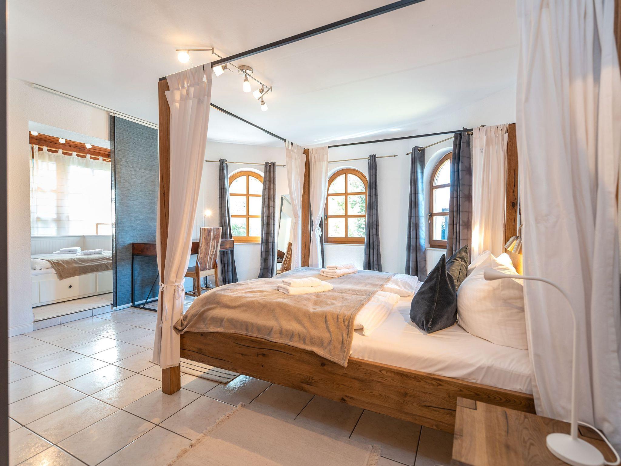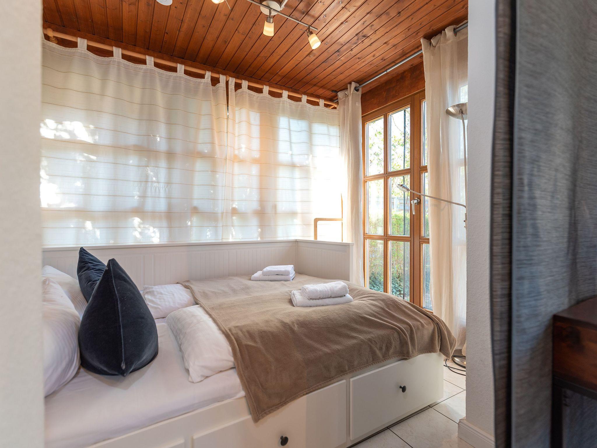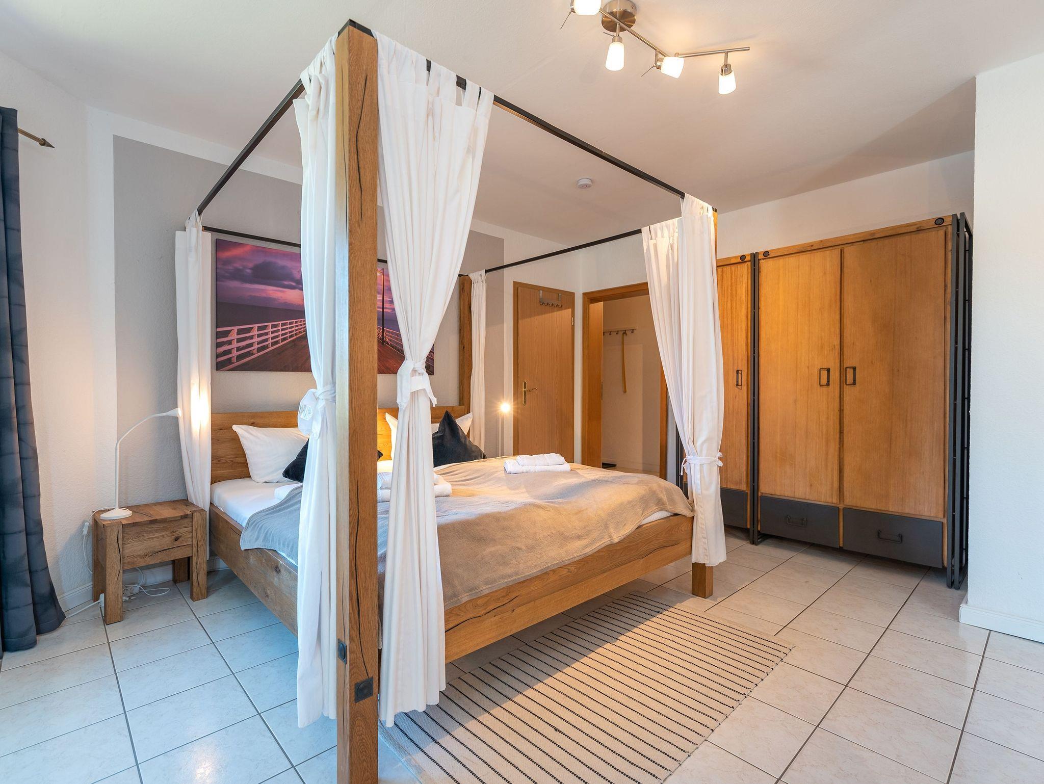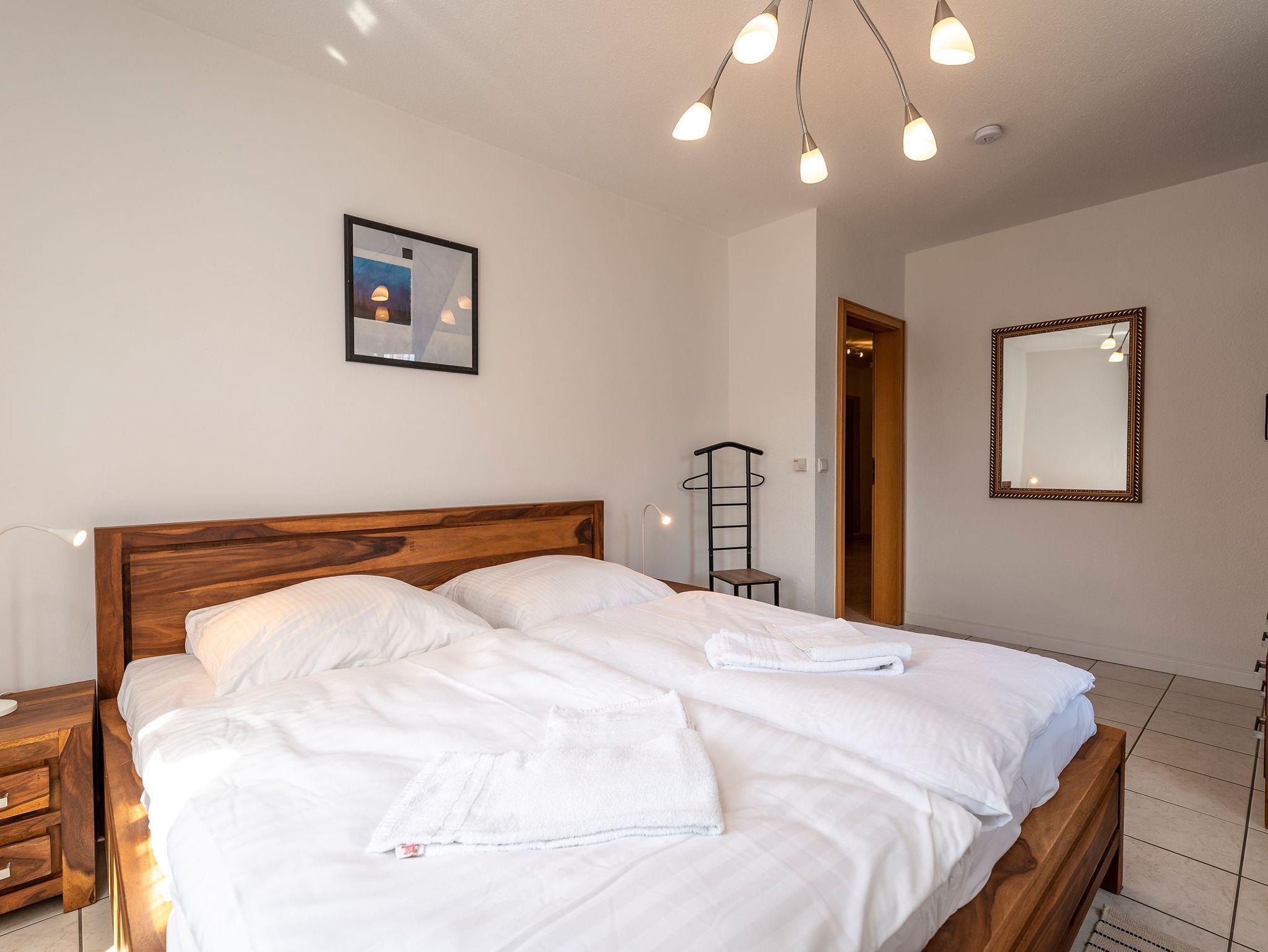 Insgesamt verfügt die Wohnung über drei Schlafzimmer, jedes mit einem Doppelbett und einem großen Kleiderschrank. Das zweite Schlafzimmer bietet zusätzlich ein Aufbettungszimmer mit einem ausziehbaren Hemnesbett, das Platz für zwei weitere Personen bietet, und Zugang zu einer eigenen kleinen Terrasse. Über dieses Schlafzimmer erreicht man auch das geräumige Badezimmer mit Dusche und Eckbadewanne, während ein zweites Badezimmer ebenso über eine Dusche verfügt.