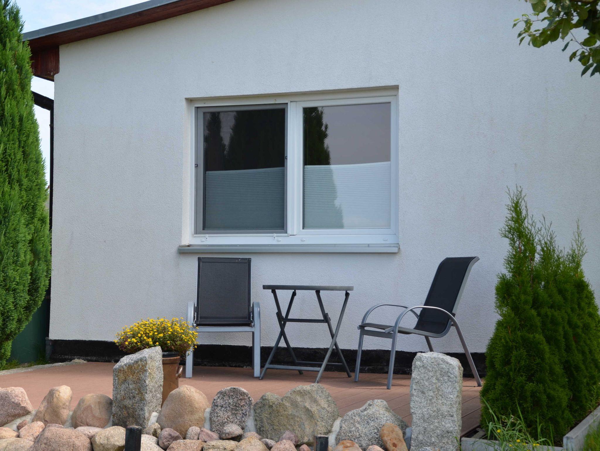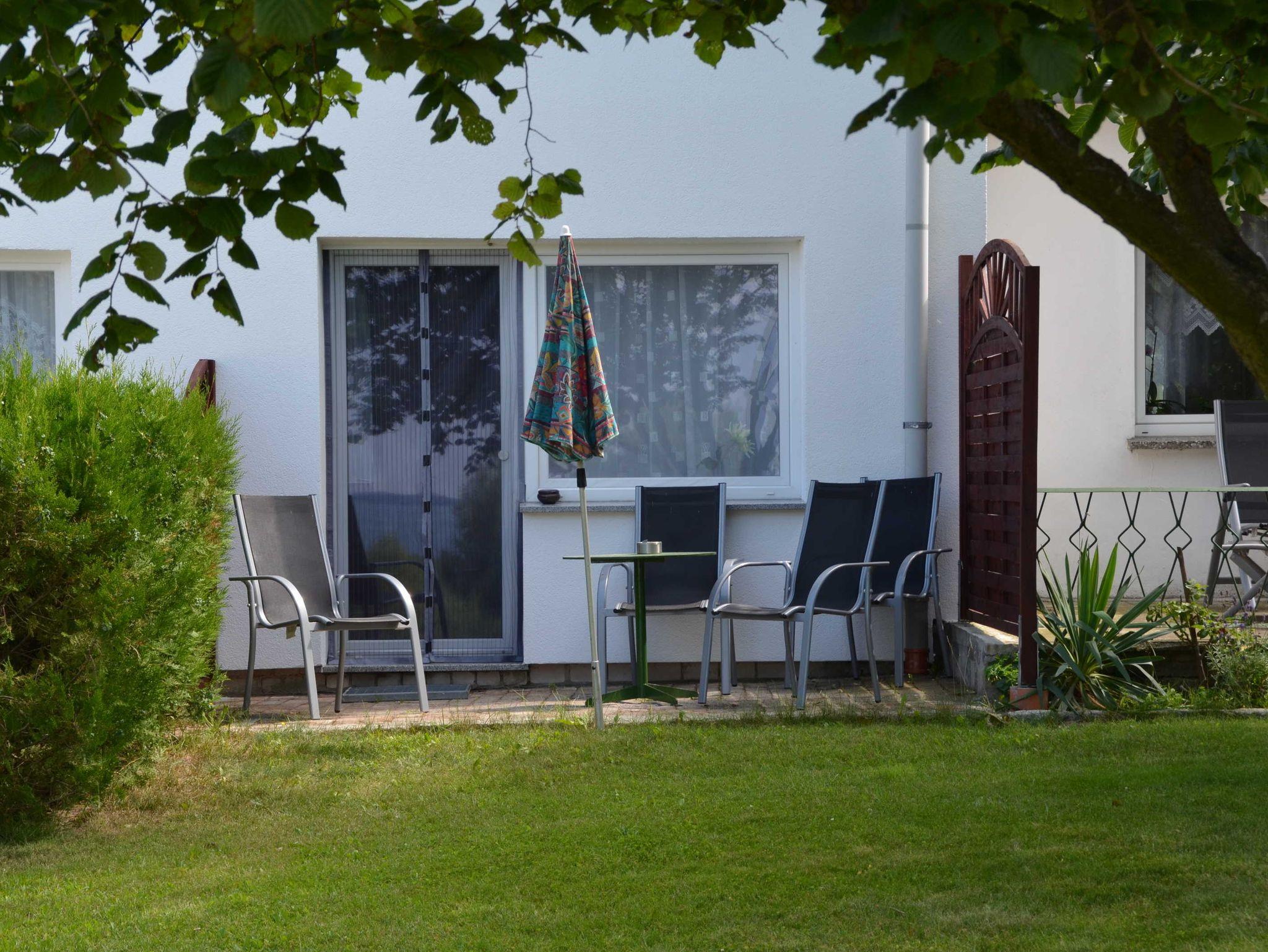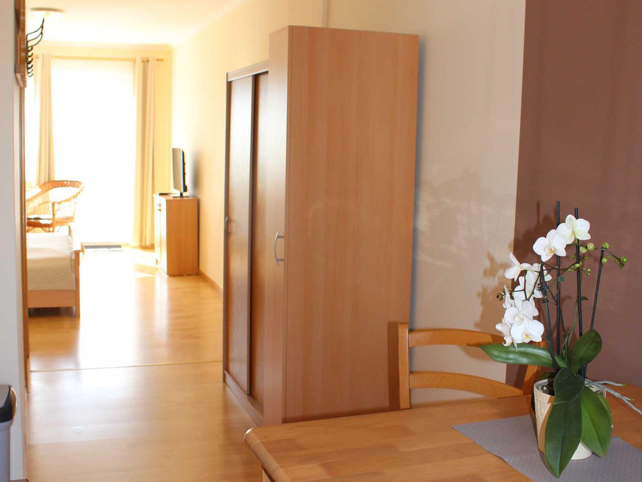 Die Ferienwohnung hat einen separaten Zugang und ist ebenerdig gelegen. Sie verfügt über einen kombinierten Wohn- und Schlafbereich mit Doppelbett mit Zugang zur eigenen Terrasse, einer Pantryküche mit üblicher Ausstattung, Sitzecke und Badezimmer (Du/WC).