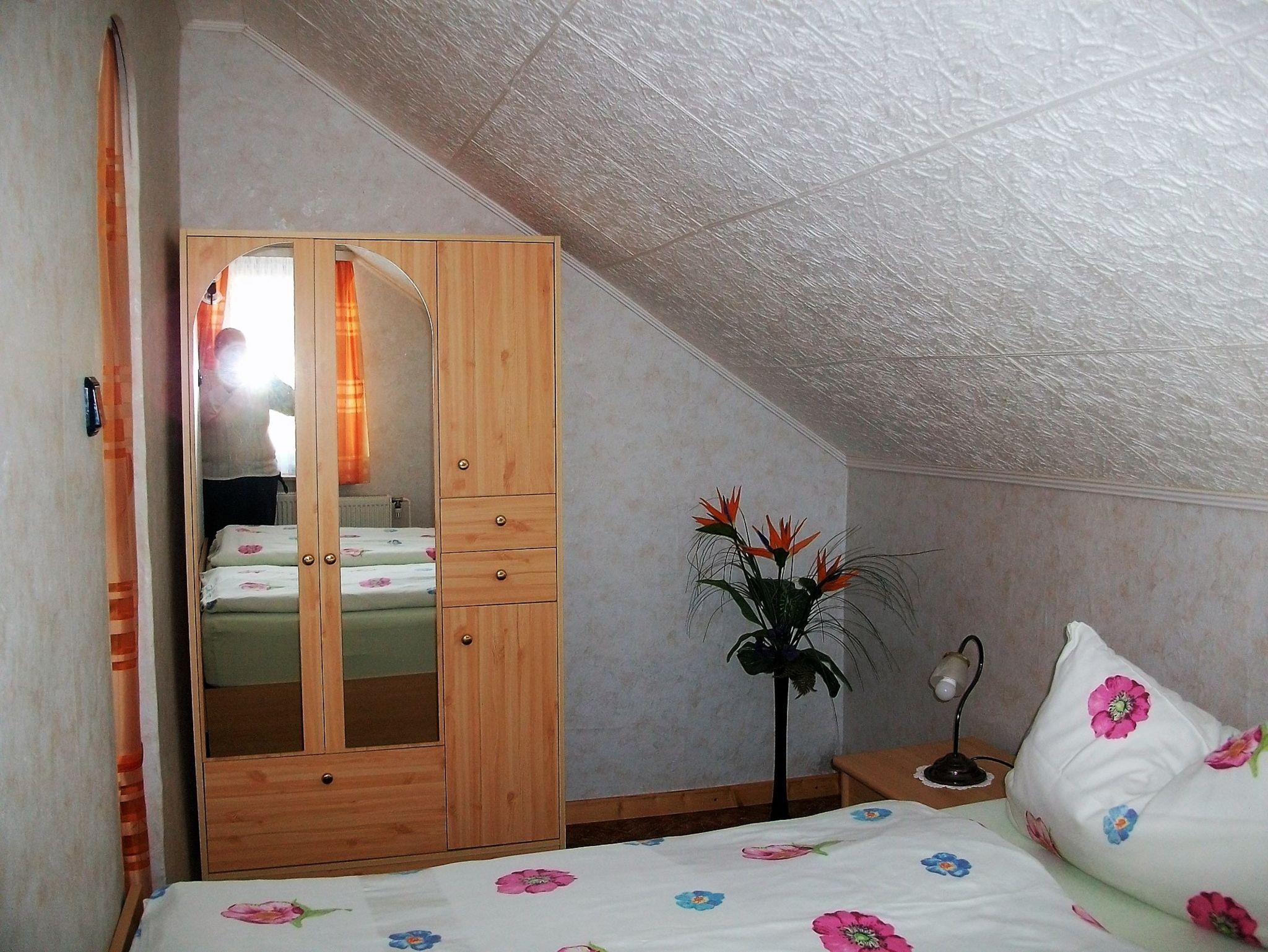 Die Ferienwohnung liegt in der oberen Etage. Durch die Treppe erreichen Sie die 30 qm große Ferienwohnung.