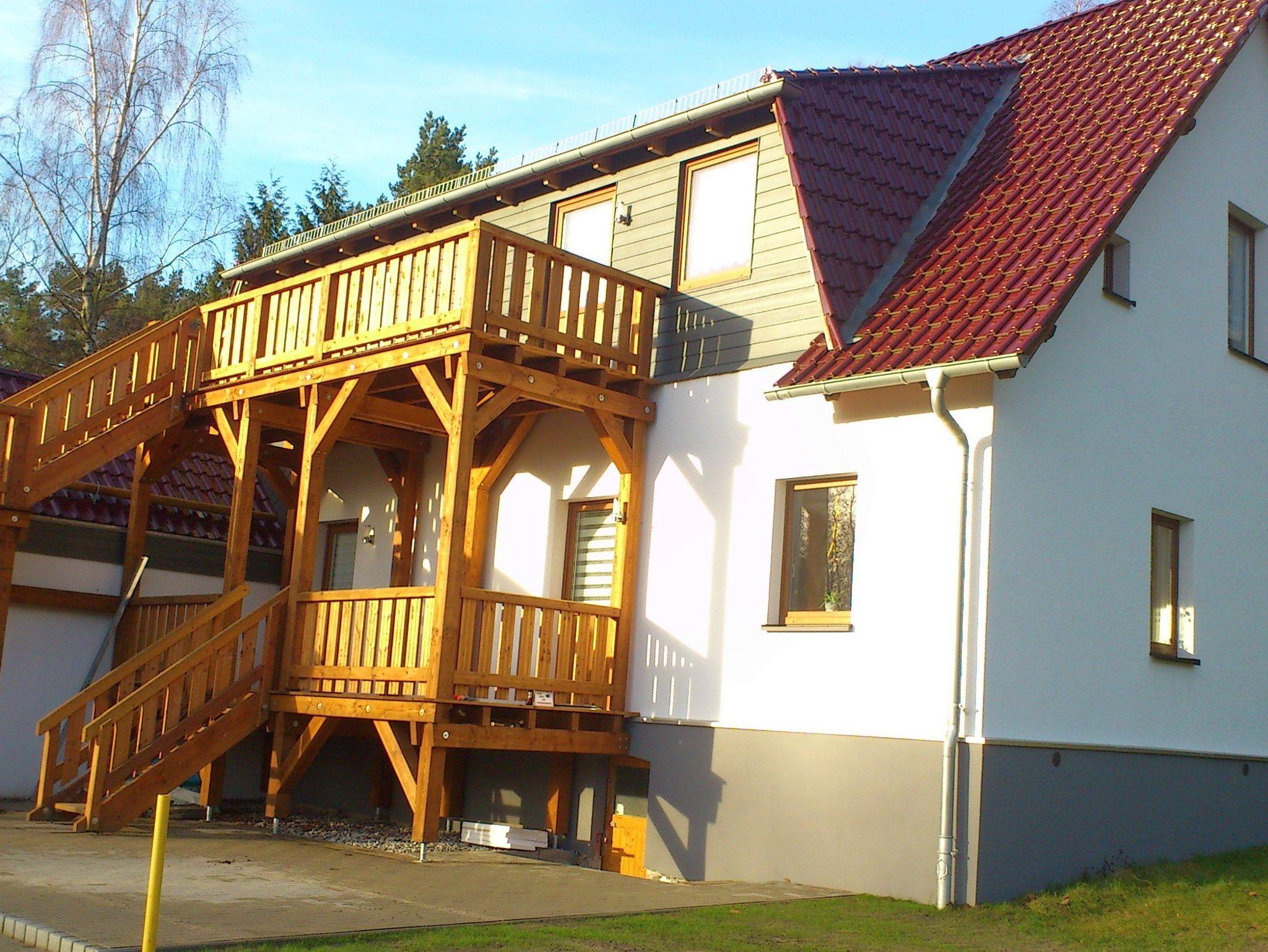 Über eine Außentreppe gelangt man auf den Balkon der dazugehörigen Wohnung, der auch gleichzeitig als Eingang dient.