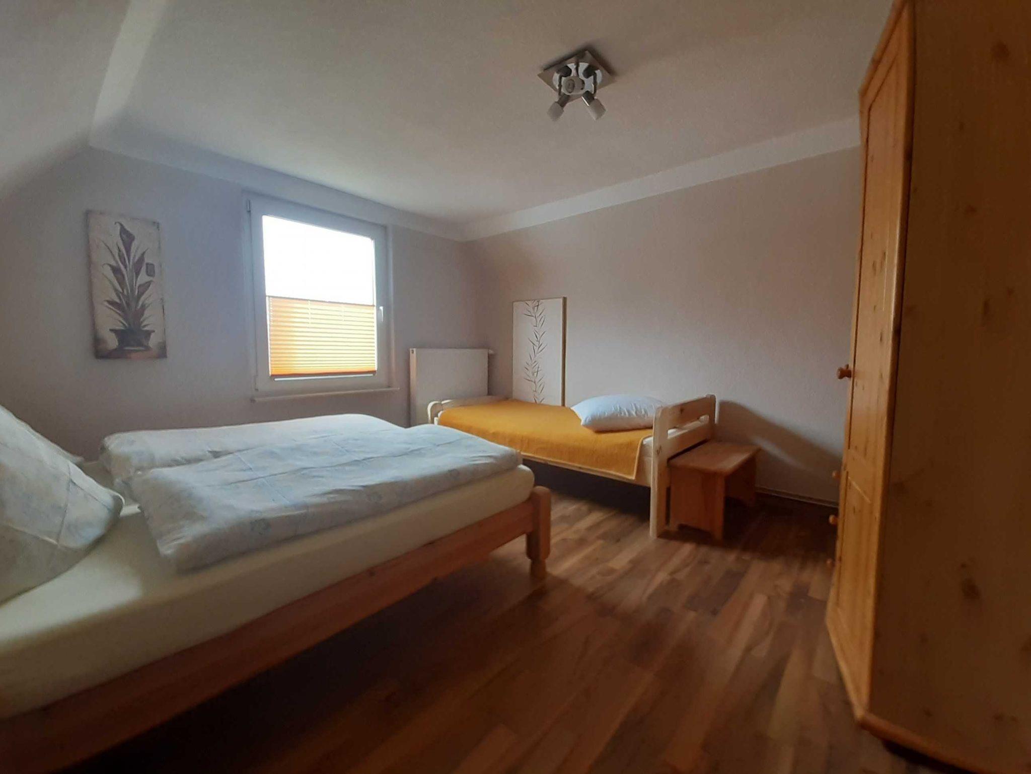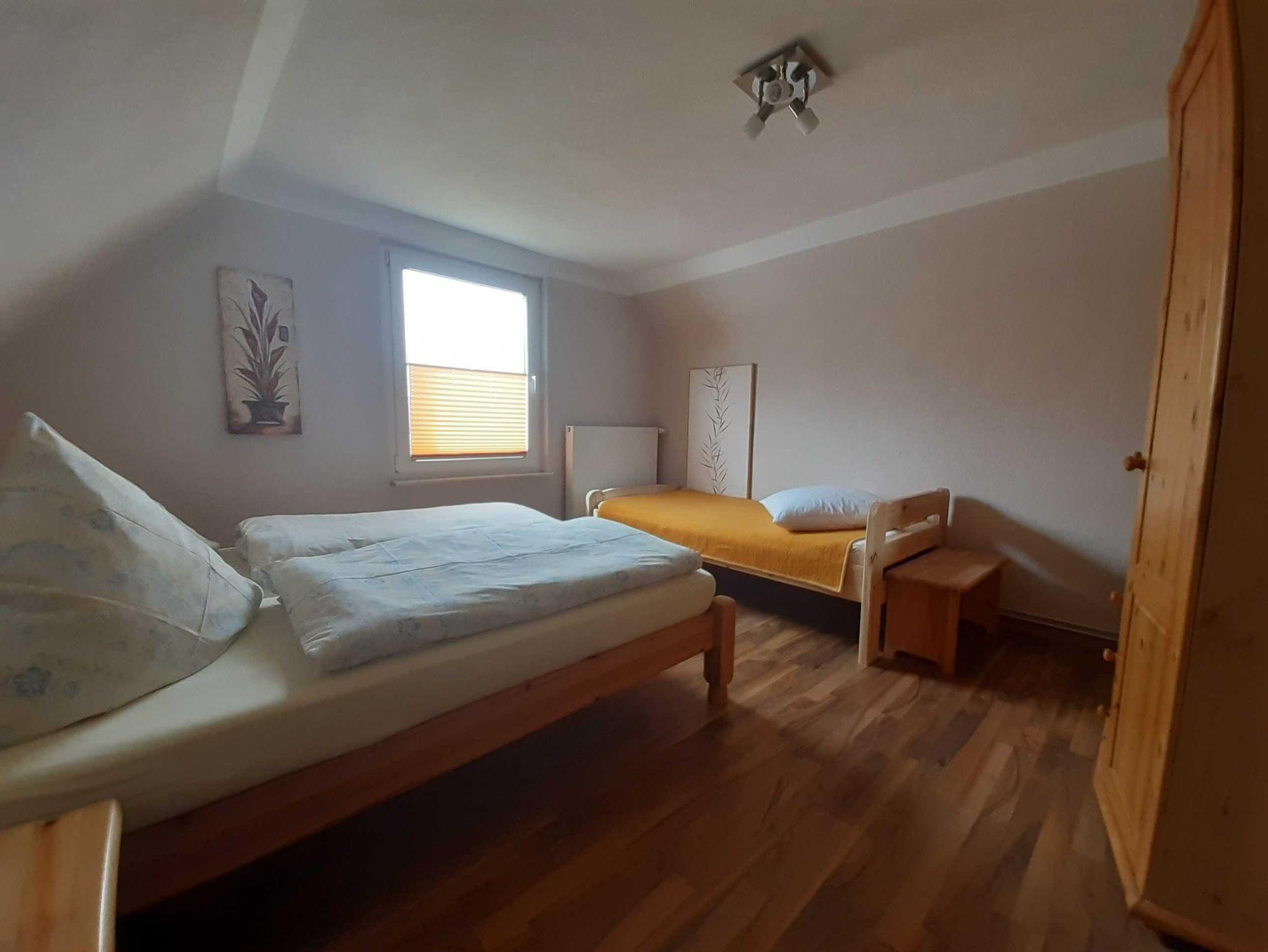 Im Obergeschoss befindet sich der Schlafraum für 3 Personen mit Doppelbett und Einzelbett, einem großen Kleiderschrank und anderen kleinen Ablagemöglichkeiten.