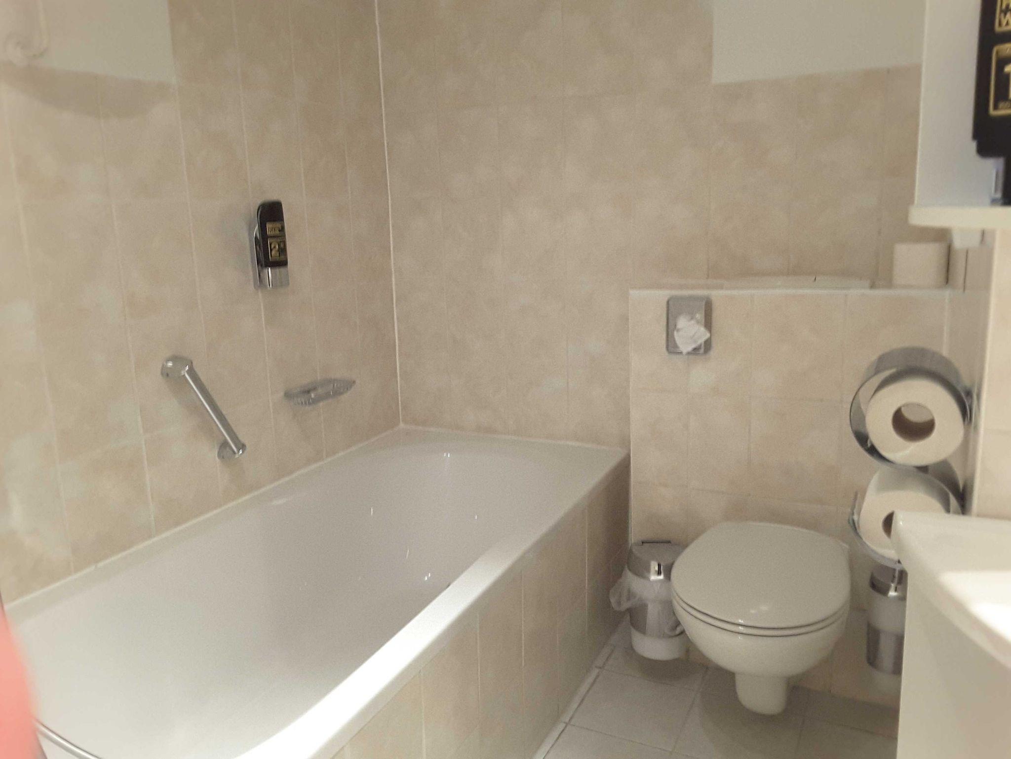 WC, Dusche , Badewanne und Sat – TV.