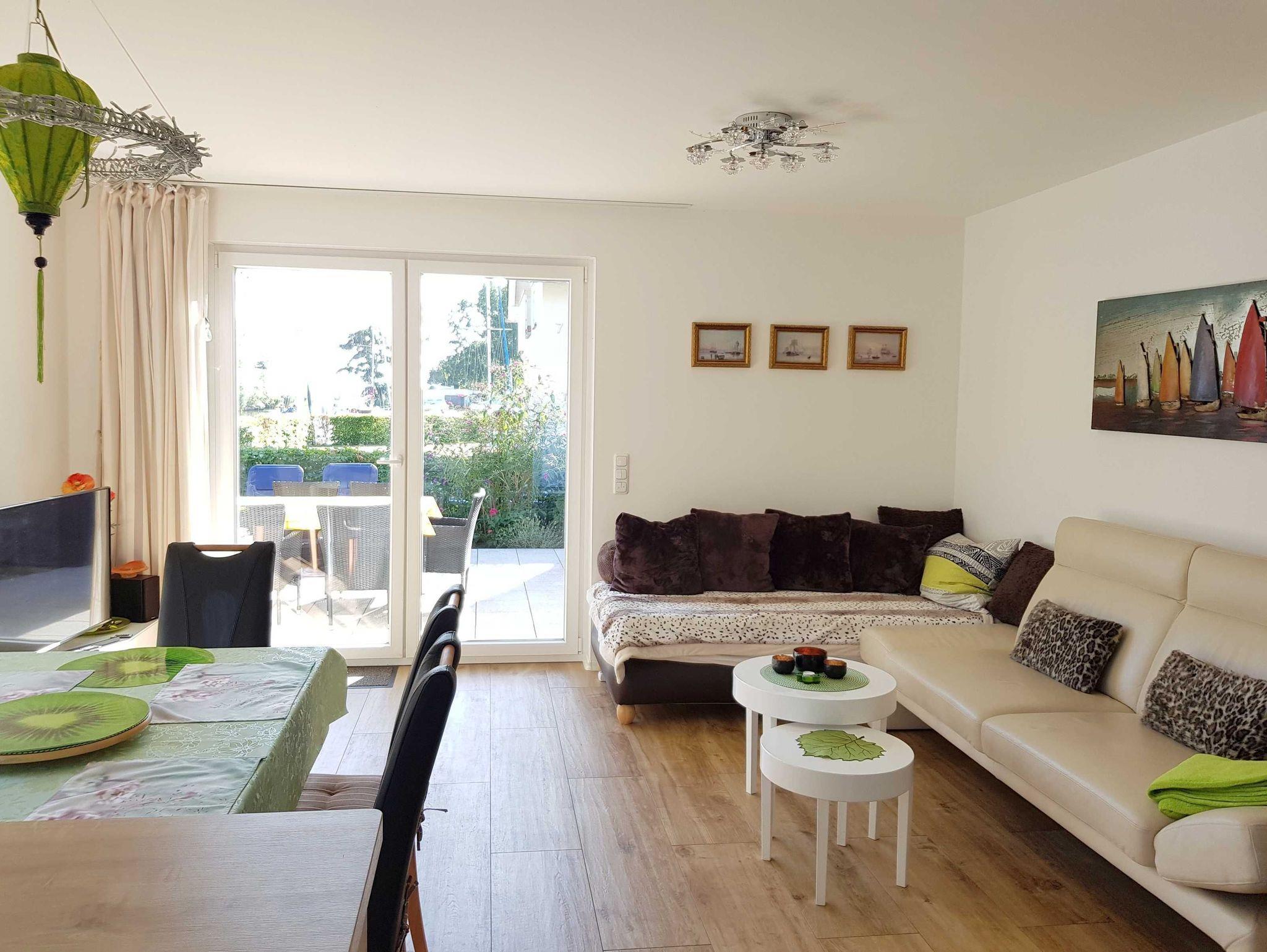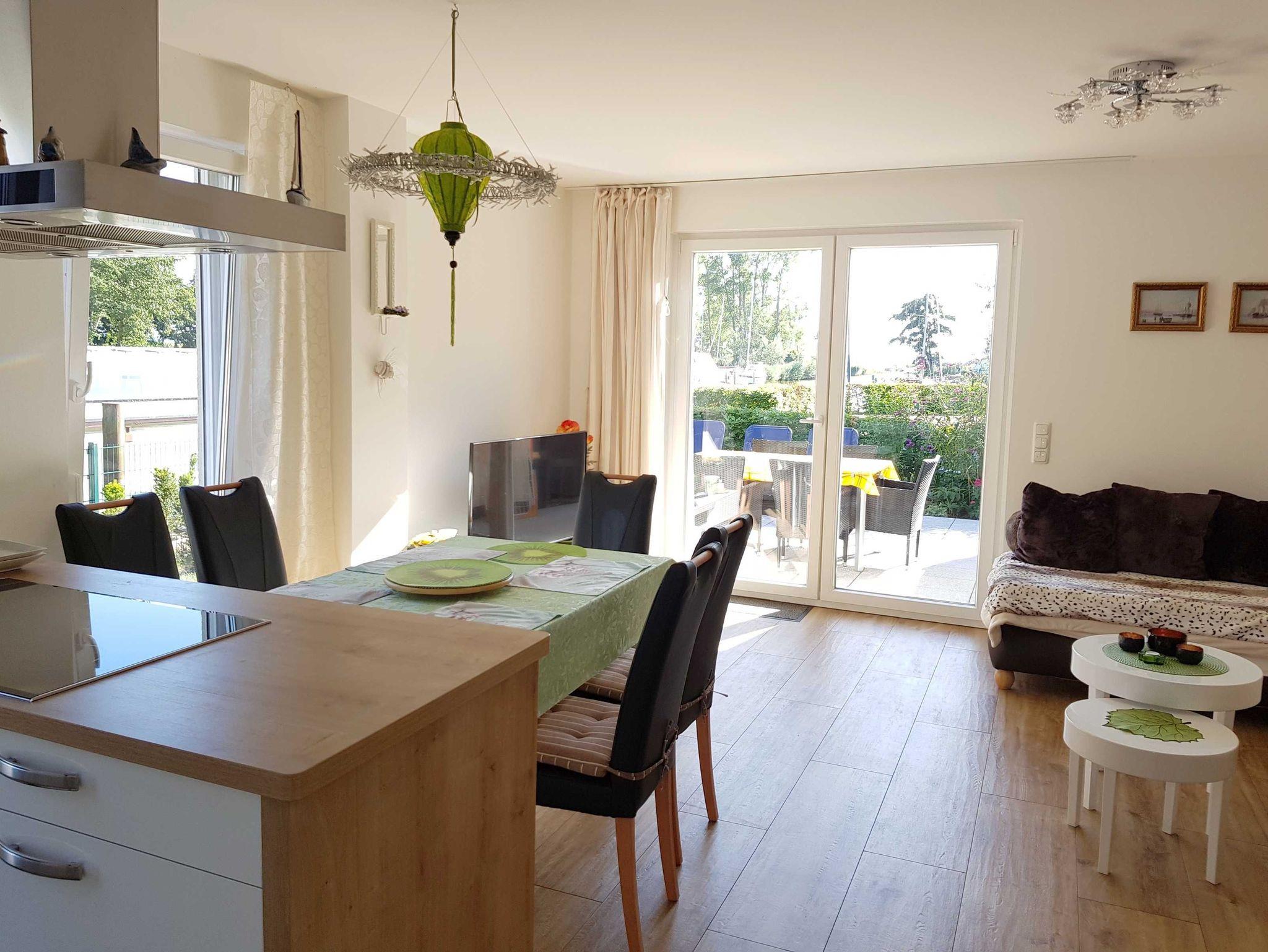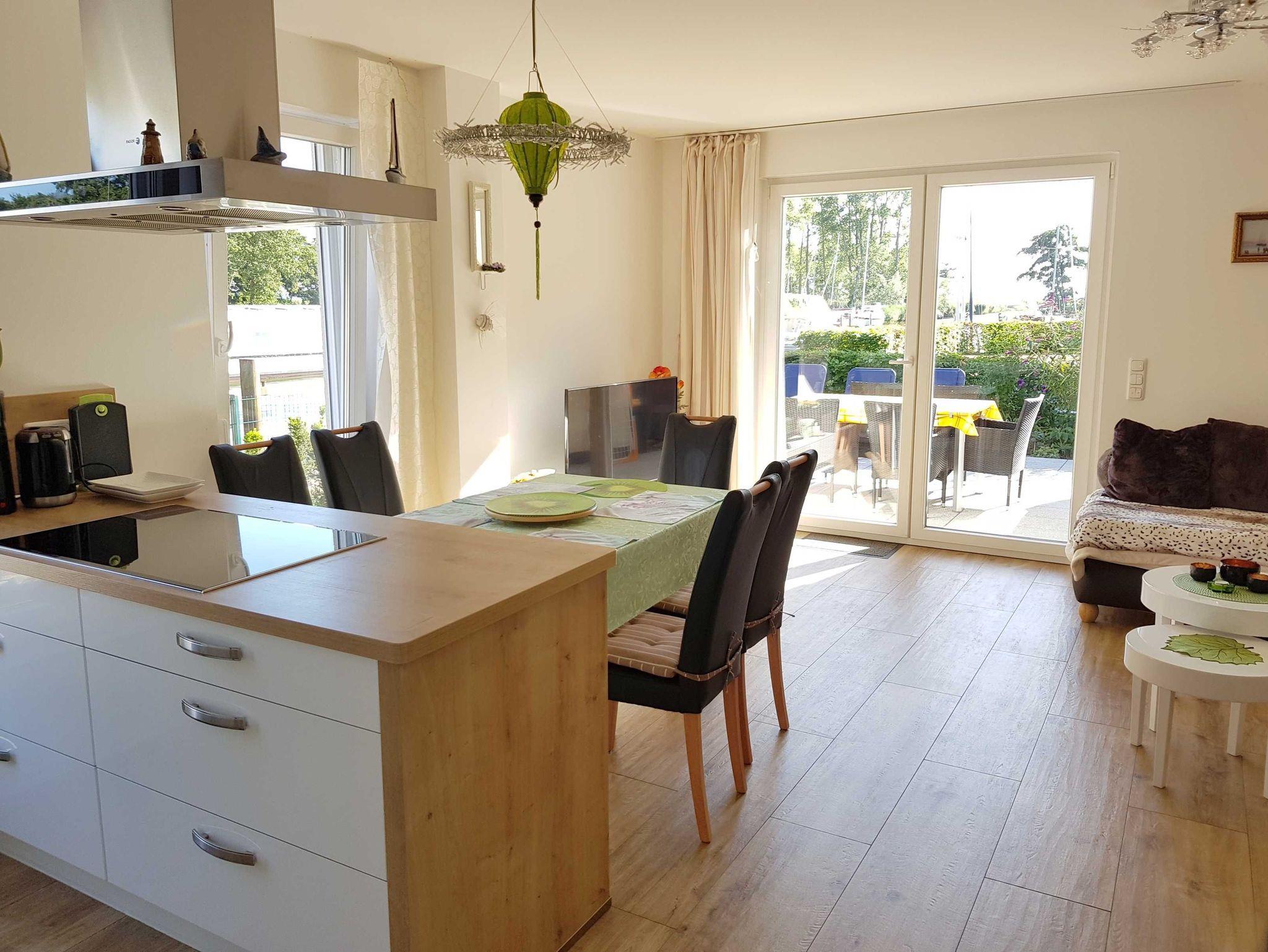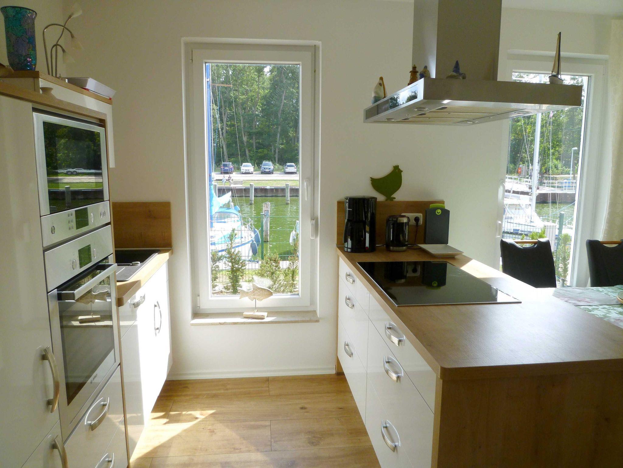 Heller Wohn- und Essbereich mit hochwertiger Küche. Die offene Küche ist modern ausgestattet mit Geschirrspüler, Kühlschrank mit separatem Gefrierfach, Backofen, eingebauter Mikrowelle sowie einer Kochinsel mit Ceran-Kochfeld (Induktion). Ein breites, beiges Ledersofa in modernem Design sorgt für besten Sitzkomfort. Abgerundet wird der Wohnbereich von einem modernen 55'' Fernseher mit Ambilight (Smart-TV) sowie einer Hifi-Anlage auf einem TV-Lowboard mit stimmungsvoller LED-Beleuchtung (Farbe einstellbar). Ein besonders reizvoller Platz bietet die möblierte Terrasse mit Strandkorb und Wasserblick. Der Garten ist mit vielen Pflanzen sehr schön und liebevoll angelegt - ideal zur Erholung.