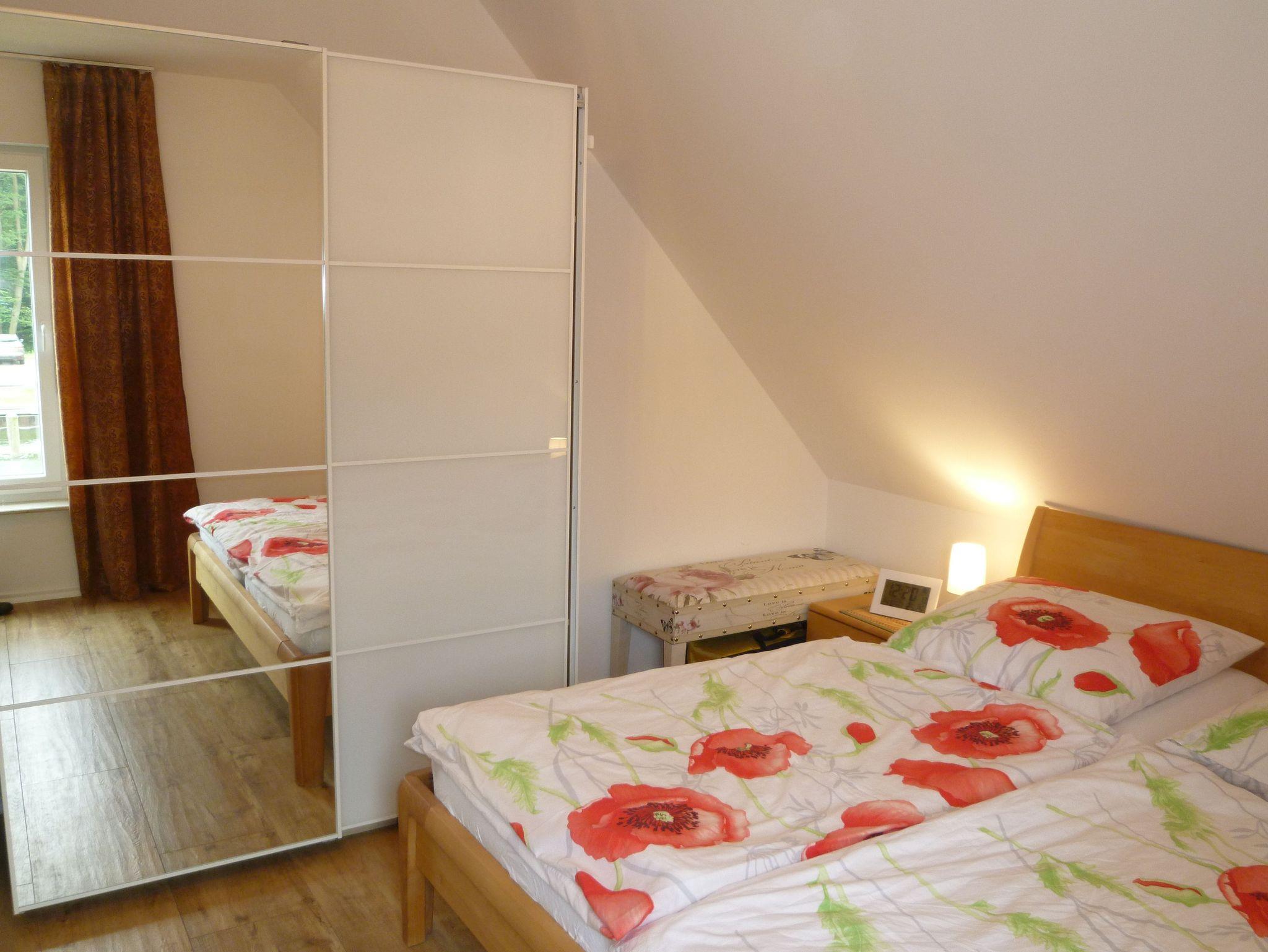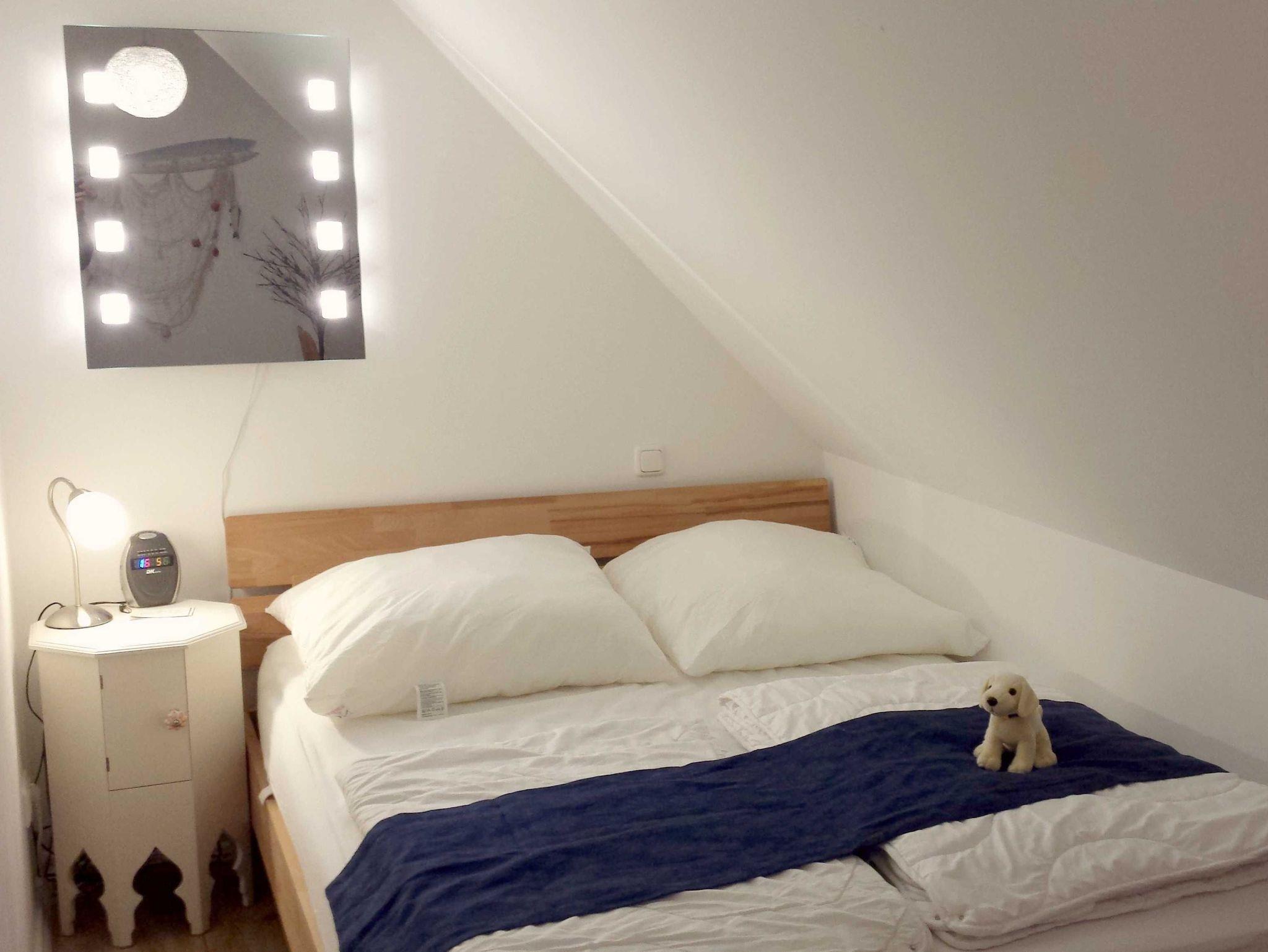 Im Obergeschoss befinden sich zwei Schlafzimmer sowie ein Bad. Ein Schlafzimmer mit Doppelbett aus Massivholz (Breite 1,80 m). Das zweite Schlafzimmer verfügt über ein weiteres Bett (Breite 1,40 m). Im ausgebauten Spitzboden stehen 2 weitere Schlafmöglichkeiten bereit: Ein Einzelbett (Breite 1 m) sowie ein Bett (Breite 1,40 m). Der Spitzboden ist auch ideal als Spielhöhle für Kinder geeignet. Der Zugang zum Spitzboden erfolgt über eine Raumspartreppe (kein abgeschlossenes Zimmer). Eine weitere vollwertige Schlafmöglichkeit besteht im Wohnzimmer durch ein hochwertiges Einzelbett.