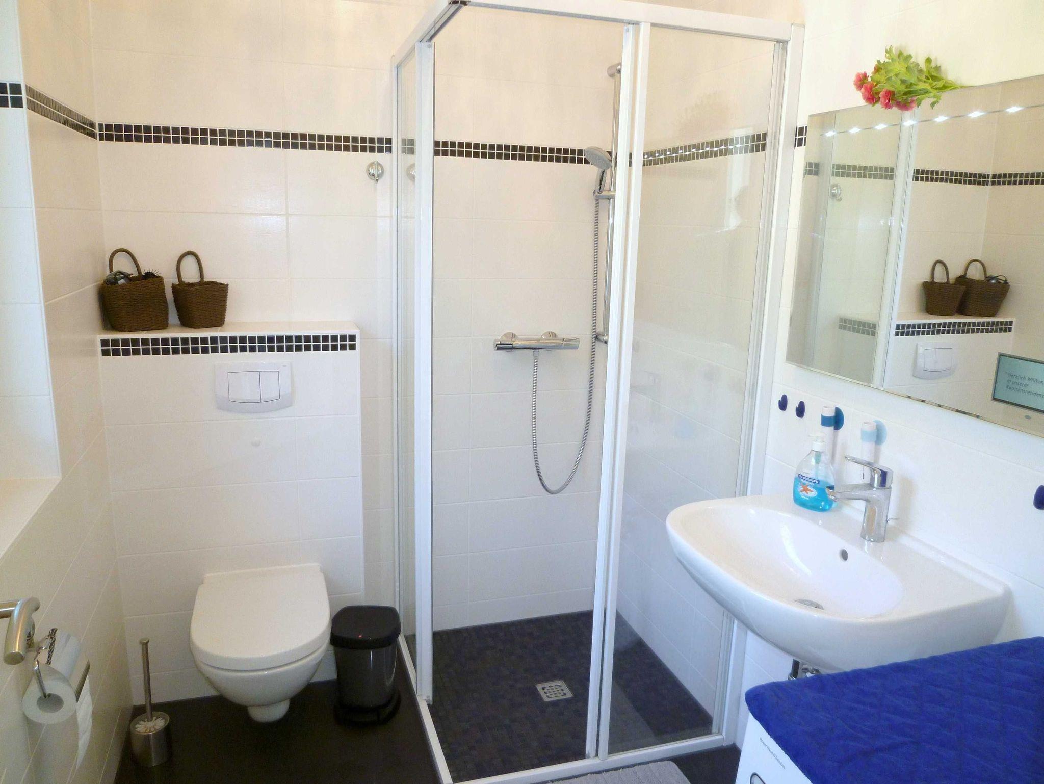 Das Ferienhaus verfügt über 2 moderne Bäder, jeweils mit bodengleichen Duschen. Neben dem Bad im Erdgeschoss steht ein zweites Bad im Obergeschoss zur Verfügung. Außerdem steht eine Waschmaschine für Sie bereit.