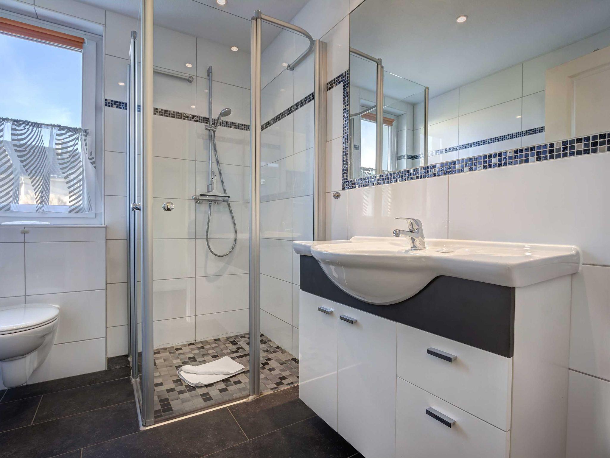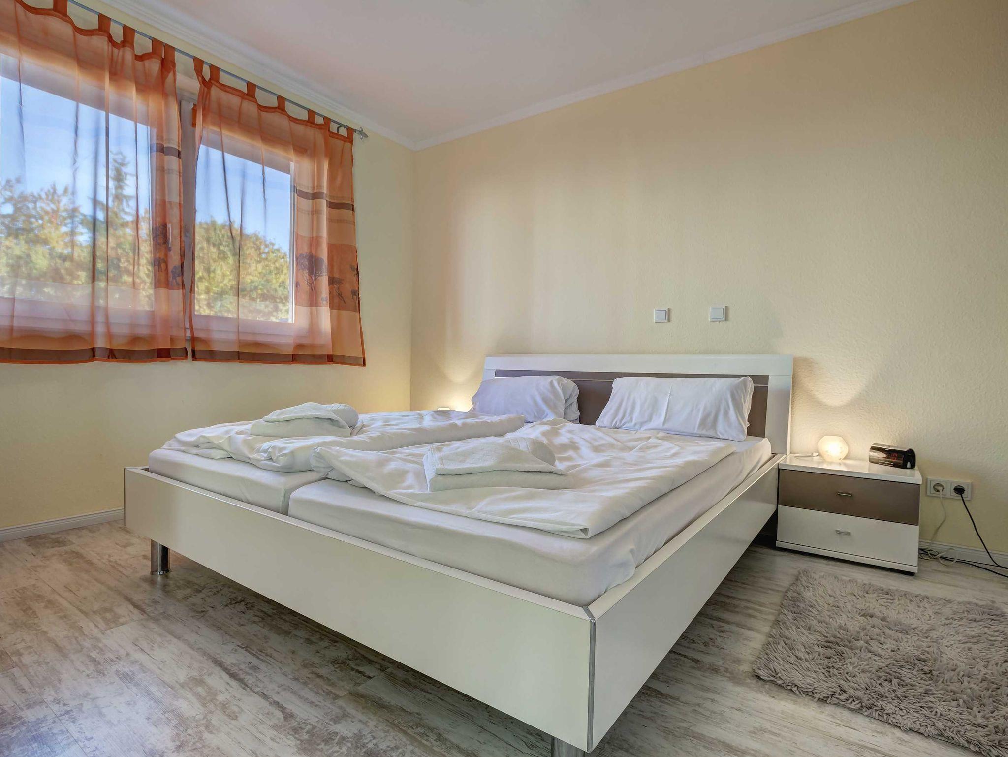 Auf 60 qm erwartet Sie in dieser ebenerdigen Wohnung ein modernes Flair mit einem großzügigen Wohn-/Essbereich mit offener Küche, Abstellraum, ein Badezimmer mit Dusche und einem Schlafzimmer mit einem Doppelbett. Im Schlafzimmer ist ein zusätzlicher Fernseher vorhanden.