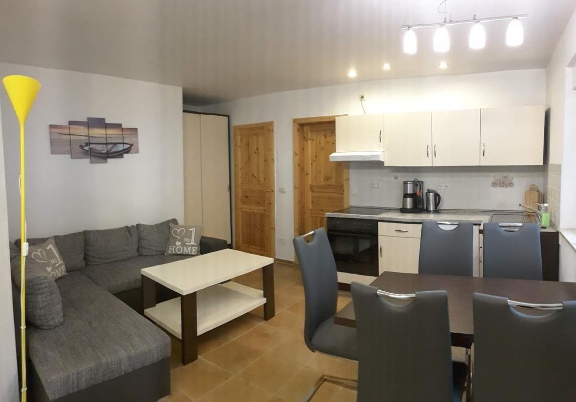 Ferienwohnung für 6 Personen mit kombiniertem Ess/Wohnbereich sowie einem separates Schlafzimmer und einem Bad mit Dusche.