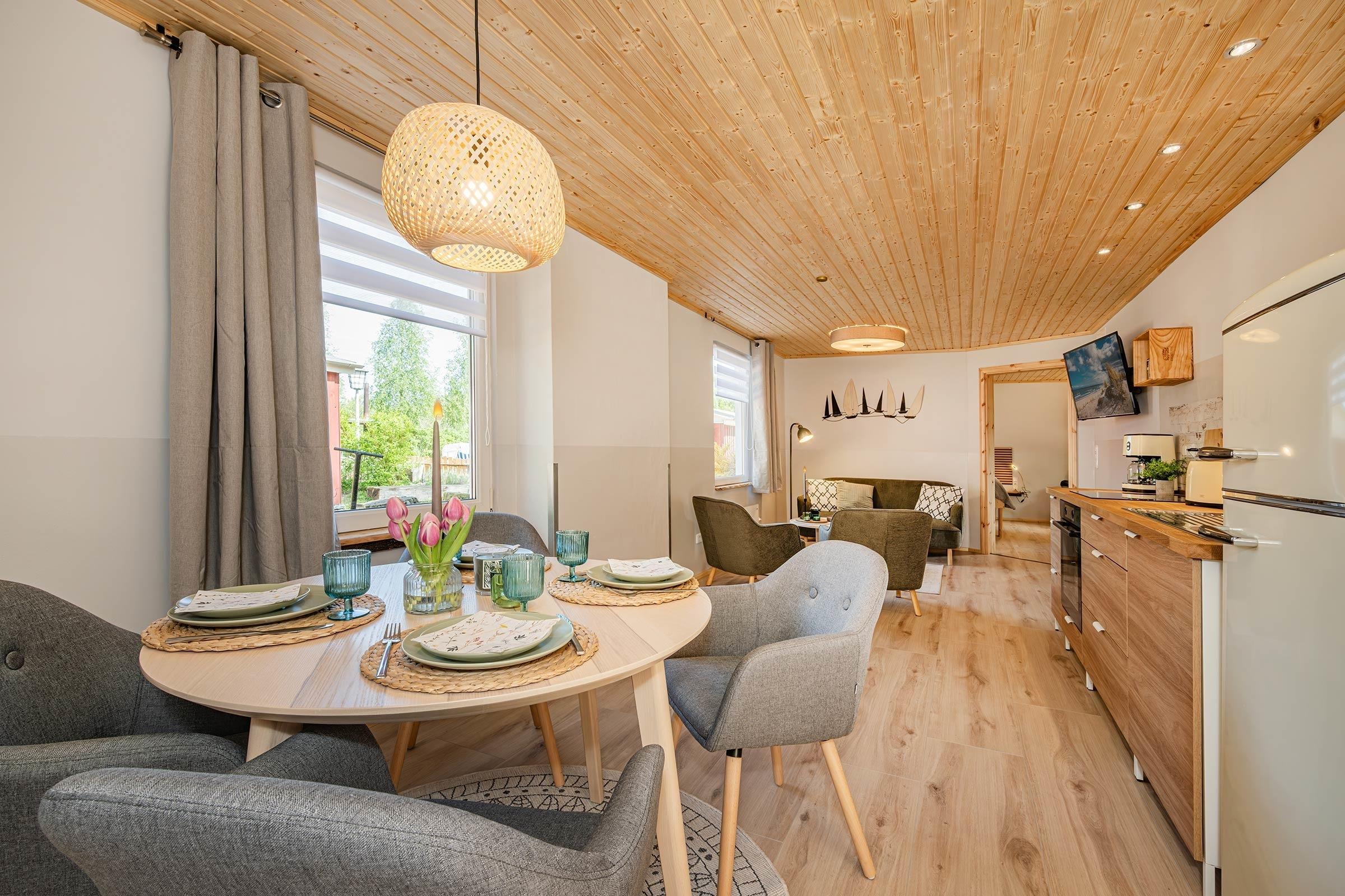 Das Ferienhaus Strandläufer befindet sich inmitten des wunderschönen Naturcampingplatzes in Ückeritz, eingebettet zwischen dem feinen Sandstrand und den einmaligen Buchenwäldern. Abseits des Trubels der Insel lässt es sich hier für bis zu 4 Personen auf 84m2 Wohnfläche herrlich entspannen. Ein zentral kombinierter Wohn-Küchenbereich mit gemütlichen Sitzmöglichkeiten laden zum gemeinsamen Kochen und Verweilen ein. An kalten Tagen zünden Sie den Kamin an. Das Ferienhaus verfügt über 2 großzügige Schlafzimmer, mit jeweils einer gemütlichen Leseecke. Ihr Reisegepäck bringen sie in den selbstgebauten offenen Kleiderablagen aus Echtholz bequem unter. Im Ferienhaus stehen ihnen 2 Badezimmer zur Verfügung, eins geht direkt vom 2. Schlafzimmer ab.. Auf der großzügigen Terrasse mit rustikalen Holzmöbeln und einem eigenen Strandkorb. lässt es sich herrlich entspannen. Auch das Grillen am Haus ist möglich.