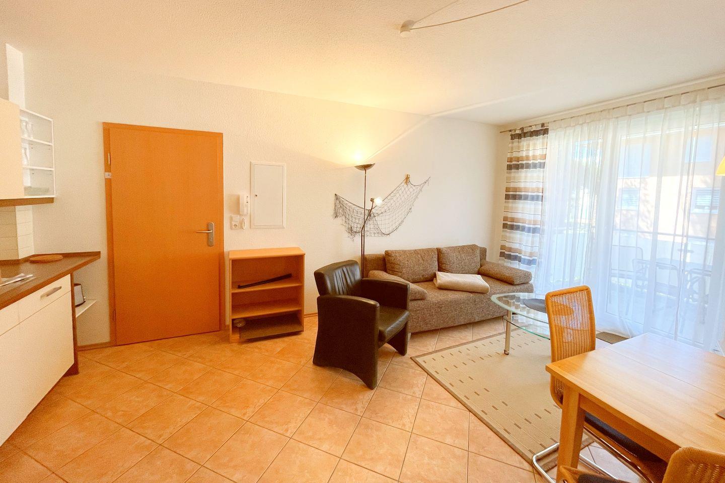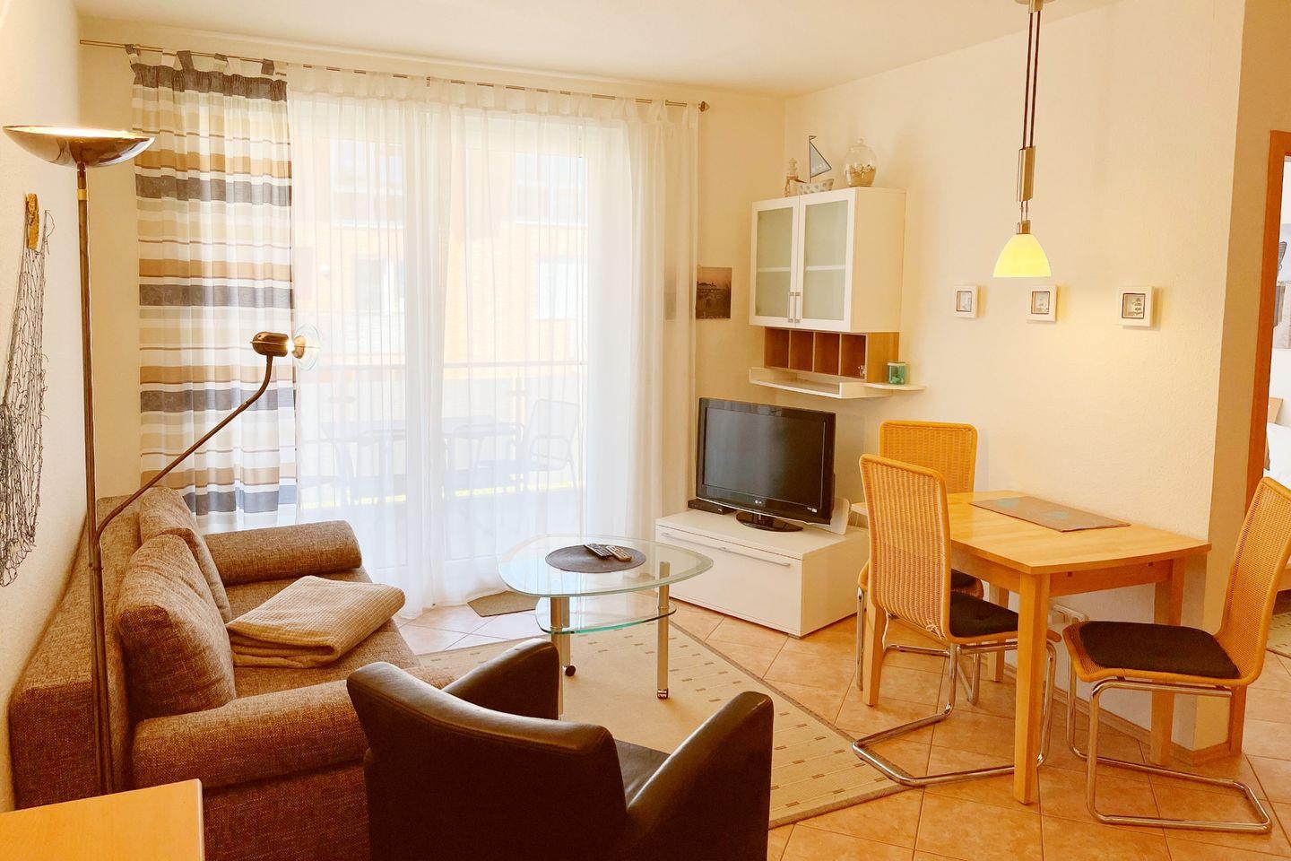 Die Ferienwohnung ist großzügig geschnitten und verfügt über ein Schlafzimmer mit einem komfortablen Bett sowie ein helles Wohnzimmer mit einer Sofaecke und einem Essbereich, der zum Verweilen und Genießen einlädt. Die offene Küche ist mit modernen Geräten ausgestattet, einschließlich eines Ceranherds, Backofens, Kühlschranks, Geschirrspüler und einer Mikrowelle, sodass Sie Ihre Lieblingsgerichte direkt zubereiten können. Die komplette Küchenausstattung mit Geschirr, Besteck und Küchenutensilien lässt keine Wünsche offen.