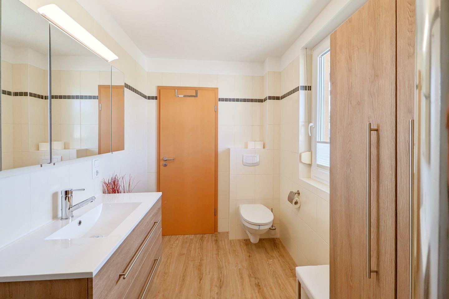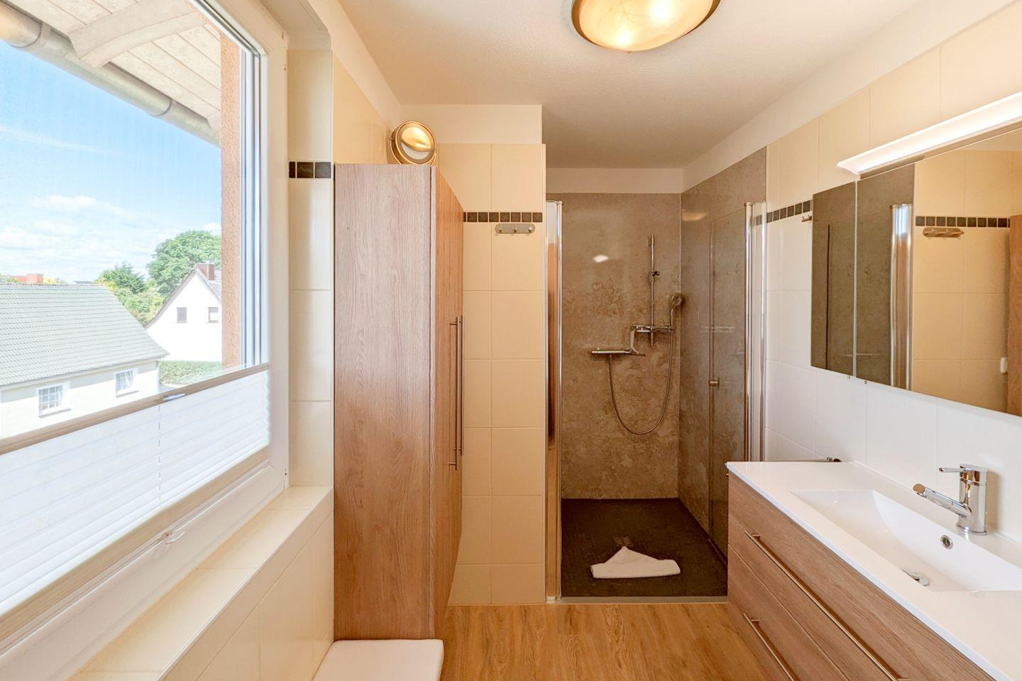 Das Badezimmer ist modern gestaltet und verfügt über eine bodengleiche Dusche, die einen einfachen Zugang bietet. Hier heißt es entspannen und nach einem erlebnisreichen Tag am Strand oder im Wald neue Energie tanken.