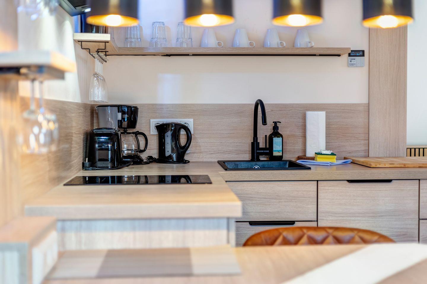 • Backofen, Mikrowelle, Wasserkocher, Cerankochfeld, Kaffeemaschine und Toaster