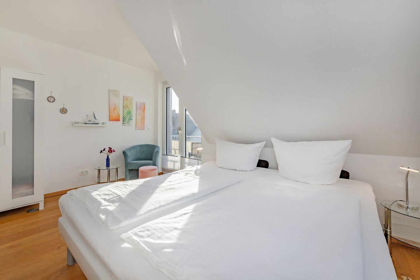 Drei stilvoll eingerichtete Schlafzimmer laden zum Träumen ein und garantieren erholsame Nächte. Zwei Schlafzimmer verfügen über große Doppelbetten (Liegefläche jeweils 1,80m x 2,00m), einen Kleiderschrank und Verdunklungsmöglichkeiten. Das Bett im dritten Schlafzimmer bietet eine Liegefläche von 1,40m x 2,00m und ebenfalls eine Verdunklung sowie ausreichend Stauraum für Ihre Garderobe. Dank der Fußbodenheizung erwartet Sie in jedem Raum eine angenehme Wohlfühlatmosphäre, egal zu welcher Jahreszeit.