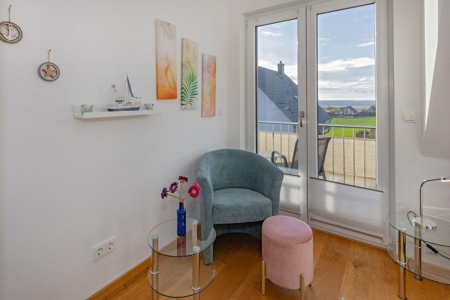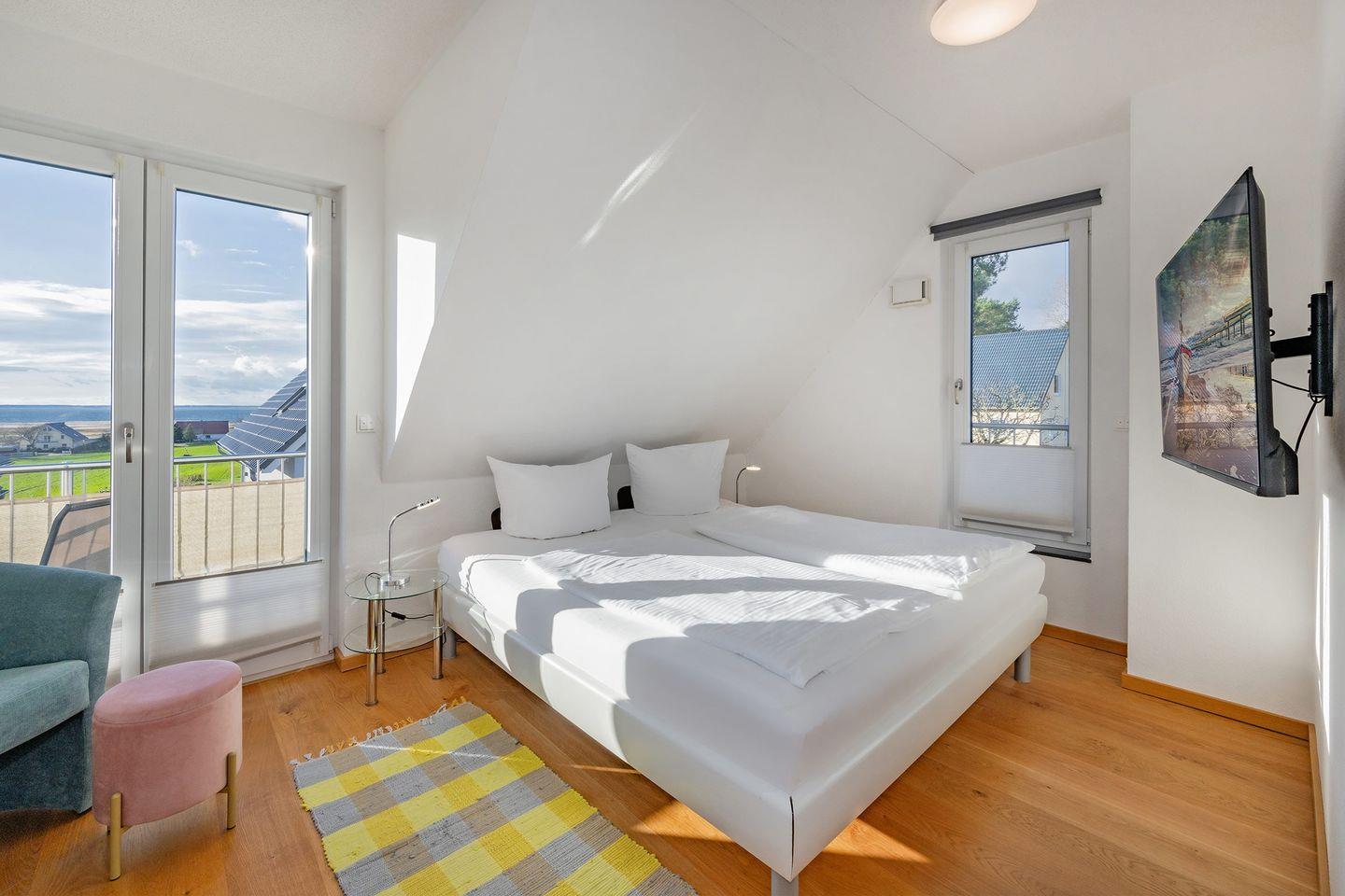 Ein Highlight des Hauses ist der möblierte Balkon im Obergeschoss. Genießen Sie von beiden Schlafzimmern den traumhaften Achterwasserblick und die idyllische Umgebung, die zu entspannten Stunden und besonderen Momenten einladen. Das gesamte Haus verfügt über Außenrollos, die heruntergelassen werden können. Der Parkettboden im Obergeschoss unterstreicht die hochwertige Einrichtung.