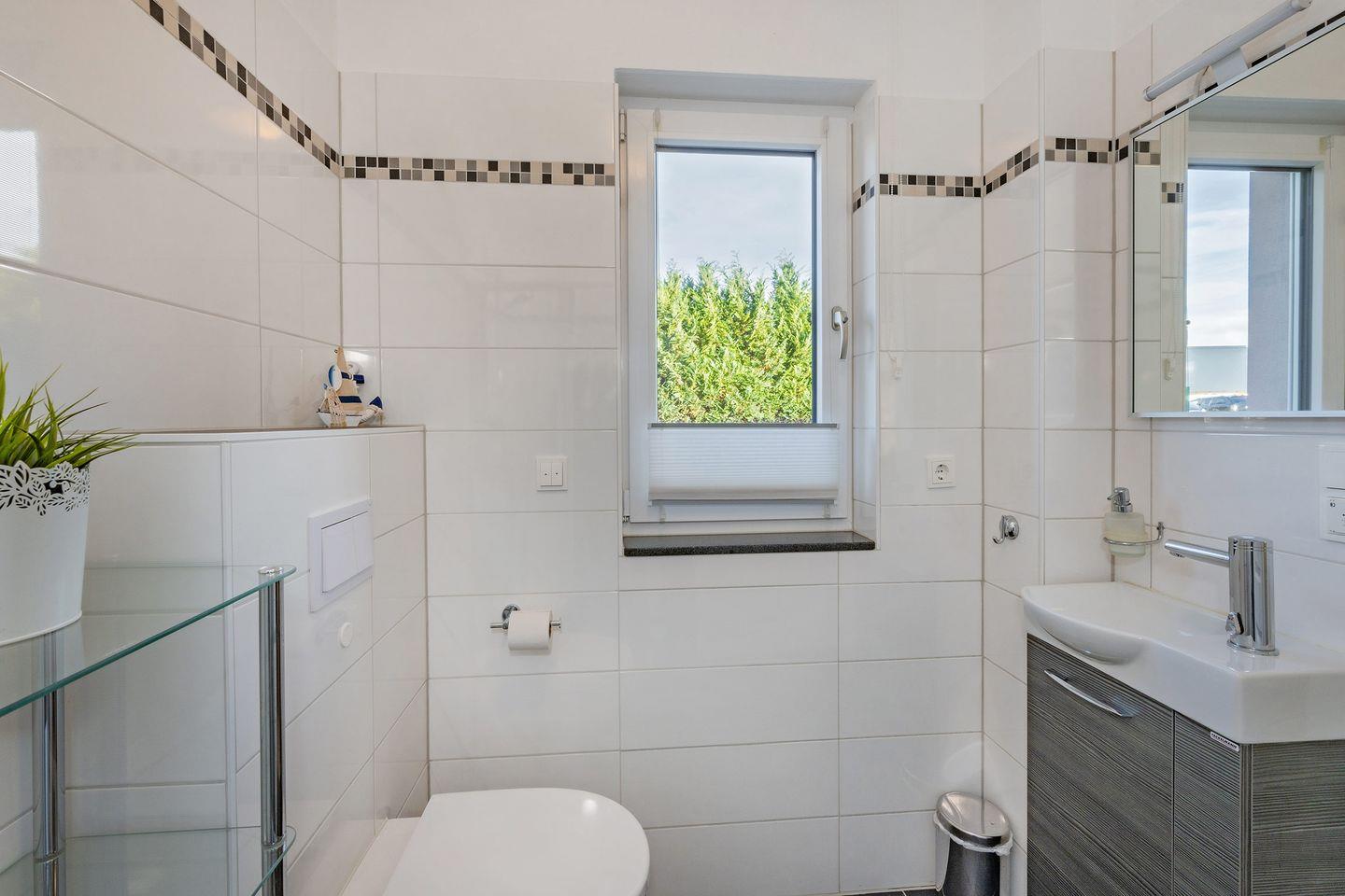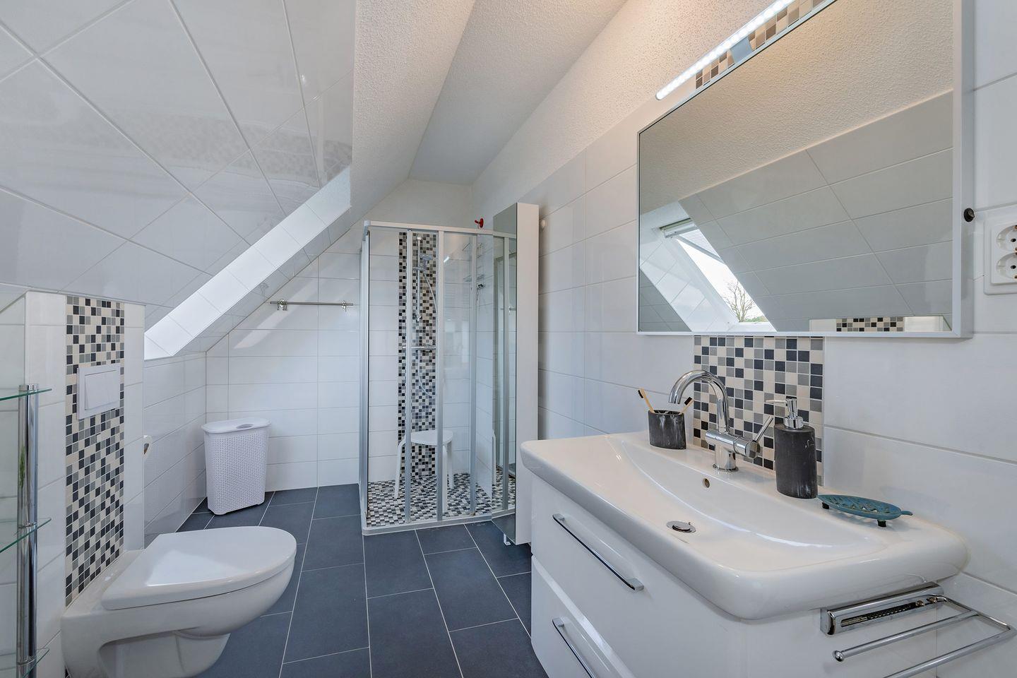 Die Bäder überzeugen durch Eleganz und Komfort: Im Obergeschoss finden Sie ein Bad mit bodengleicher Dusche, Badewanne, Radio und Kosmetikspiegel; im Erdgeschoss ein weiteres Bad mit bodengleicher Dusche. Beide sind modern und hochwertig gestaltet.