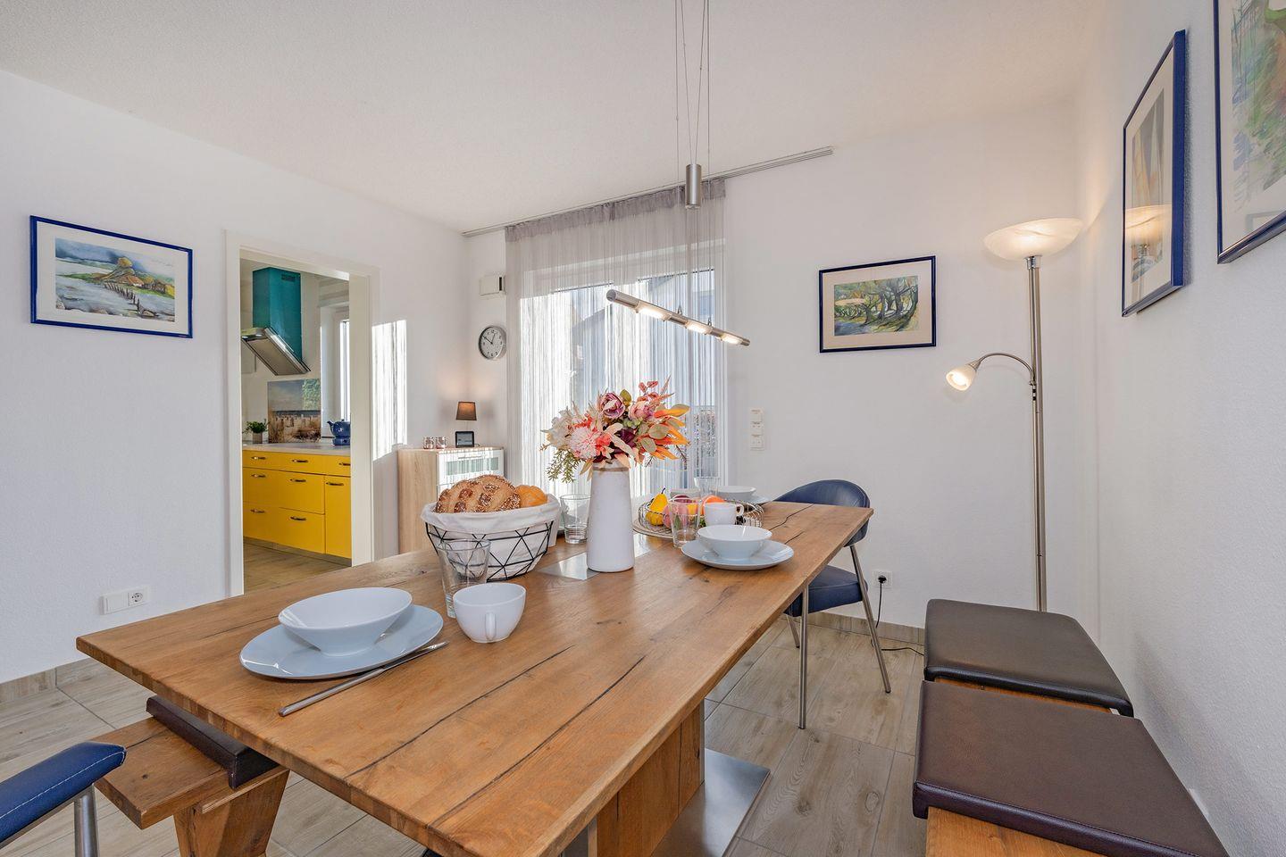 Der lichtdurchflutete Wohnbereich überzeugt mit einem gemütlichen Kamin, der an kühleren Abenden für eine behagliche Stimmung sorgt. Auf der bequemen Couchlandschaft können Sie die Urlaubs-Abende ausklingen lassen. Das Erdgeschoss verfügt über zwei Terrassen, eine mit südlicher Ausrichtung, die Andere mit östlicher Ausrichtung. So können Sie je nach Gusto Zeit im Freien verbringen oder Sie nutzen den Garten mit Grill für gesellige Abende.