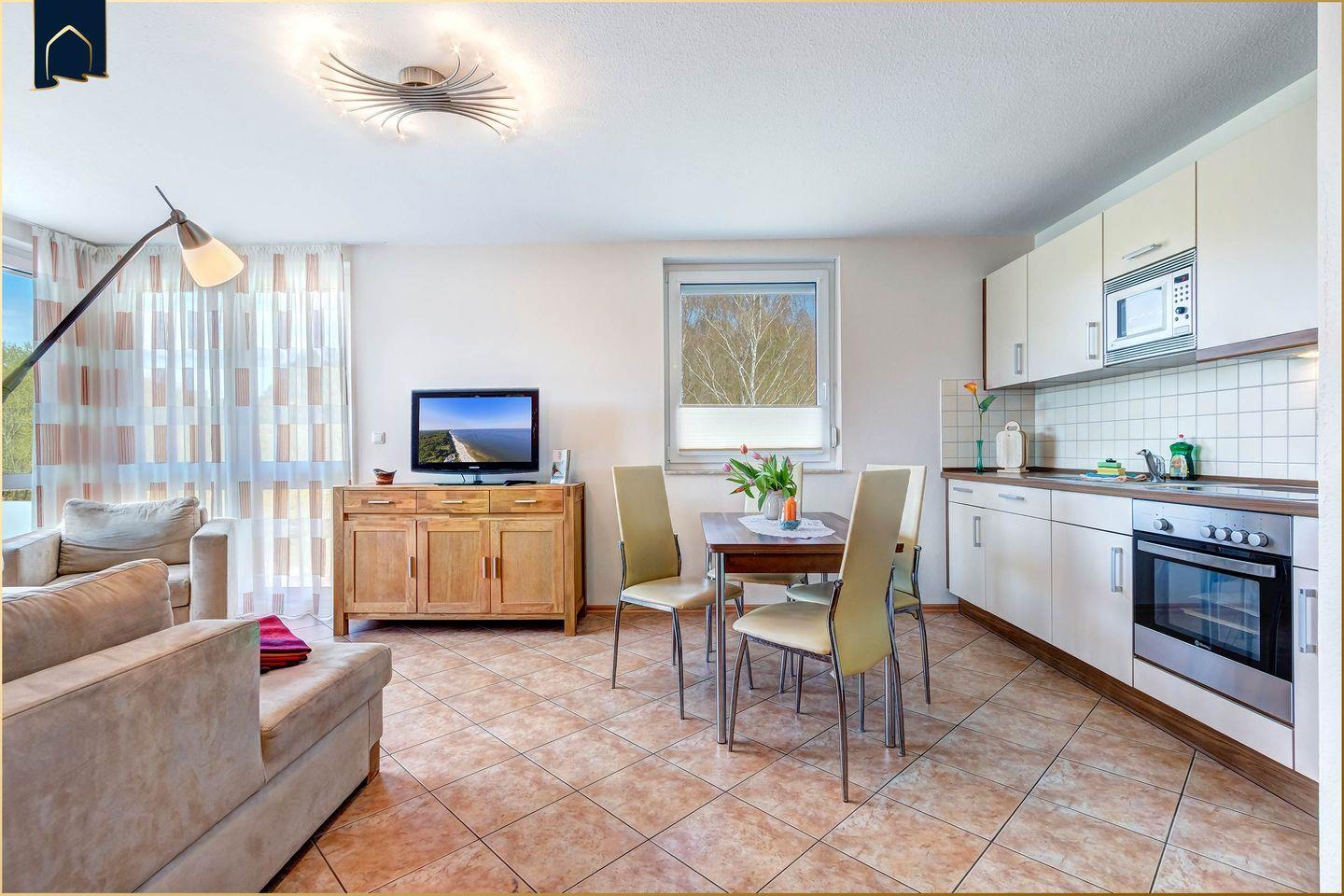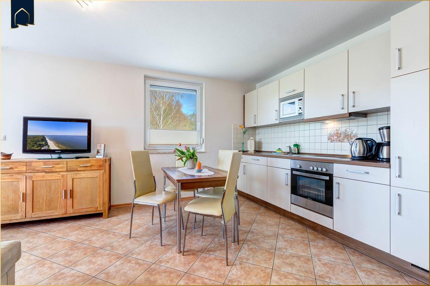 Diese charmante Ferienwohnung auf Usedom bietet auf 40?m² den perfekten Rahmen für entspannte Urlaubstage – ob als Paar, mit der Familie oder mit Hund. In nur 800?Metern Entfernung wartet bereits der feine Ostseestrand auf Sie. Der helle Wohnbereich mit gemütlicher Sofaecke, TV und Esstisch lädt nach einem aktiven Tag zum Verweilen ein. Die offene Küche ist mit Backofen, Herd, Kühlschrank, Gefrierfach, Mikrowelle, Toaster und Kaffeemaschine bestens ausgestattet. Die moderne Dusche sowie Extras wie ein Haartrockner, Kosmetikspiegel und Fußbodenheizung sorgen auch im Badezimmer für hohen Komfort.
