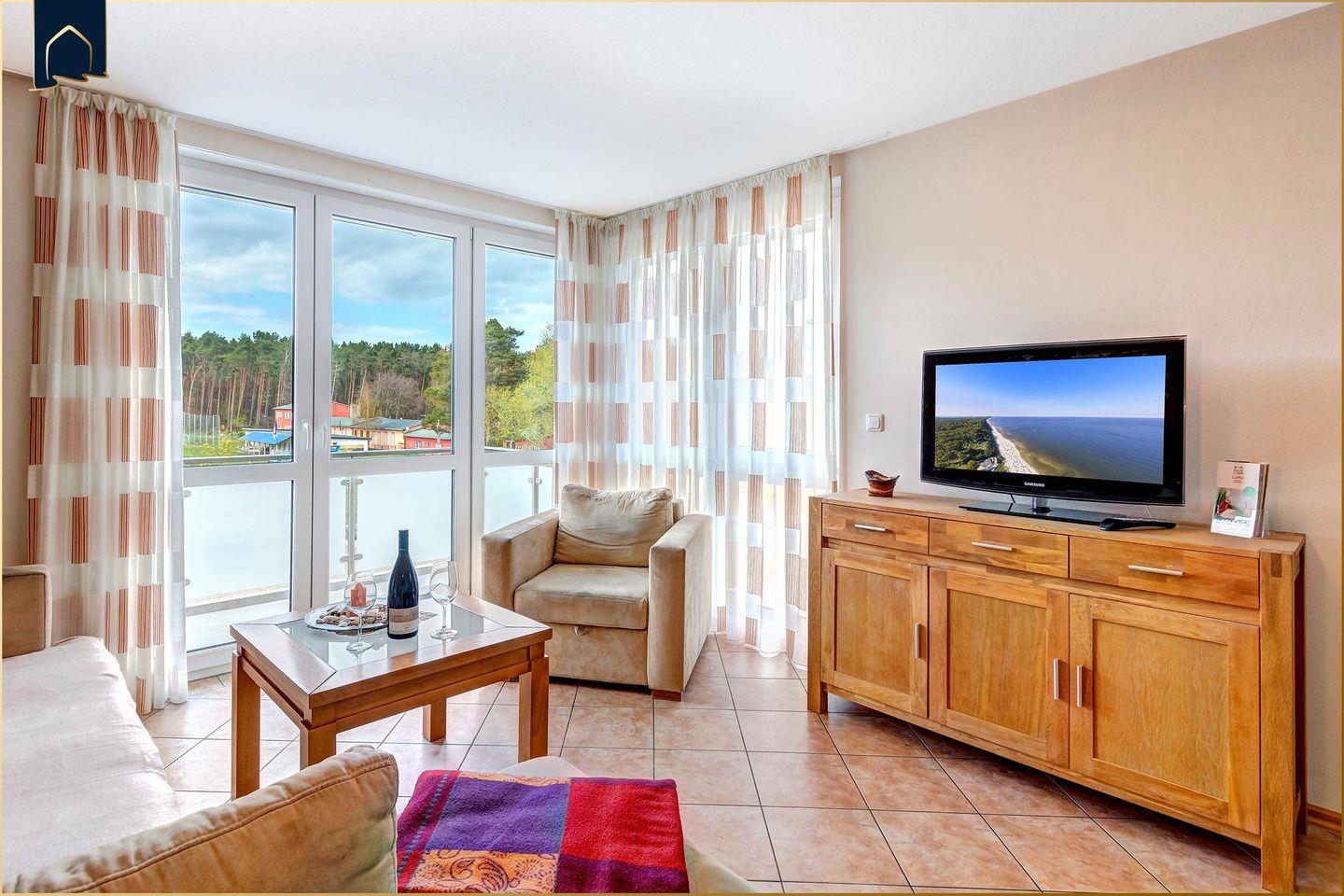 Der Wohnbereich ist geschmackvoll eingerichtet mit einem gemütlichen Sofa, Sessel, TV sowie Verdunklungsmöglichkeiten an allen Fenstern. Die Fußbodenheizung schafft ein angenehmes Raumklima – perfekt auch in der Nebensaison.